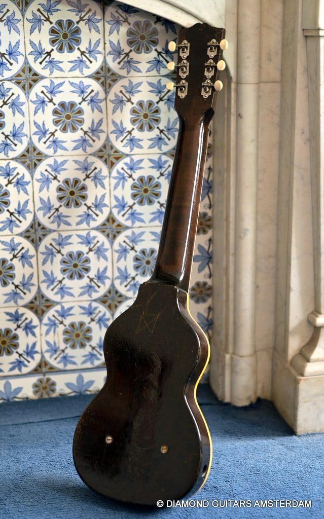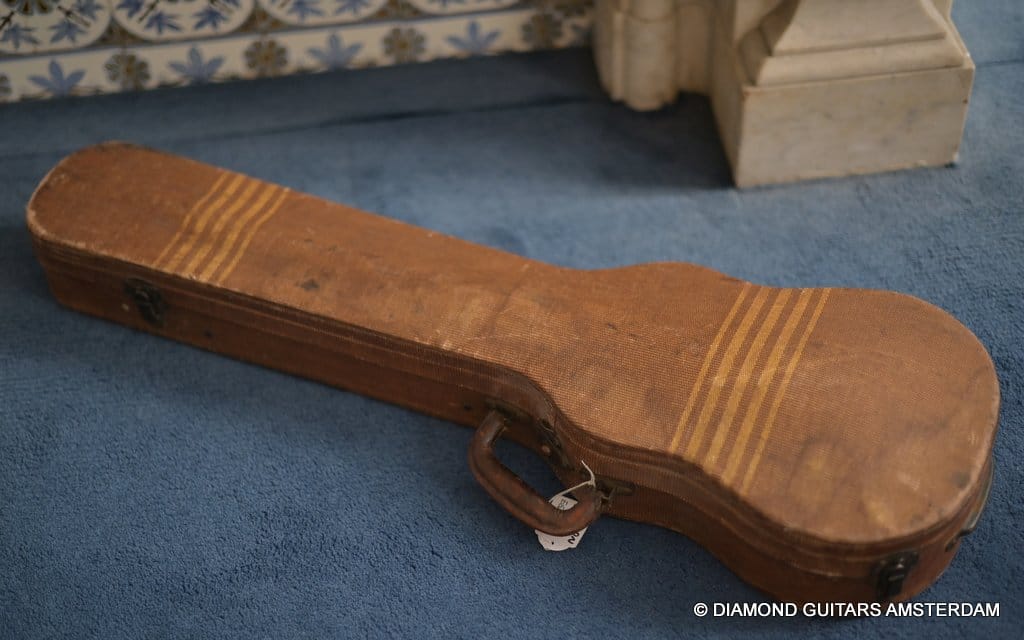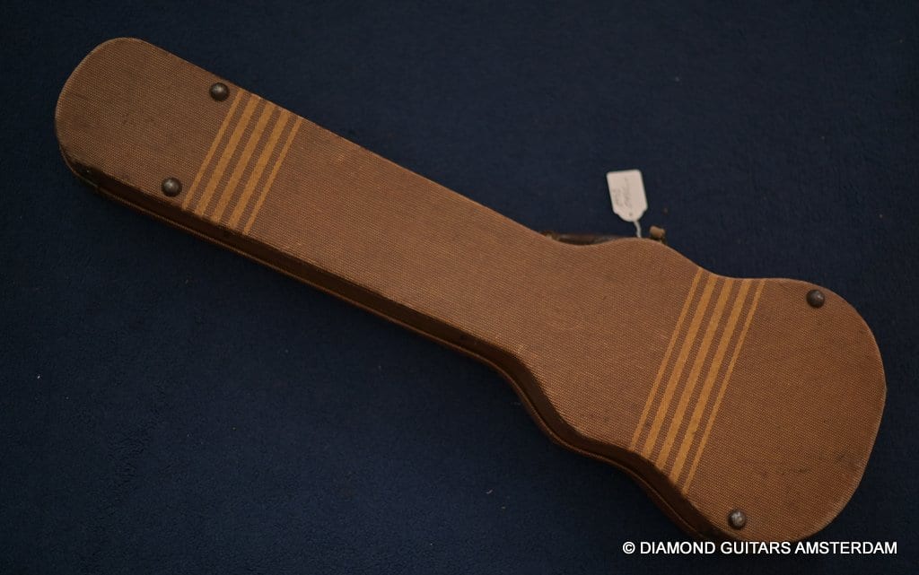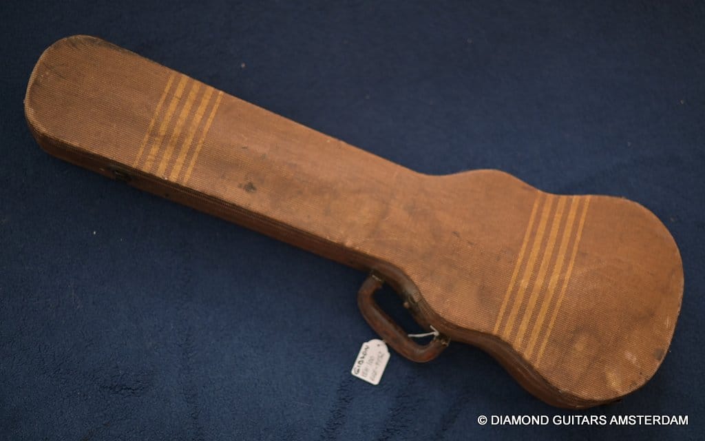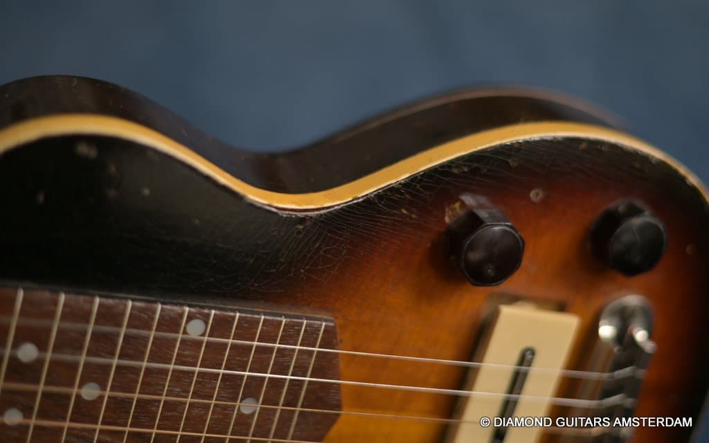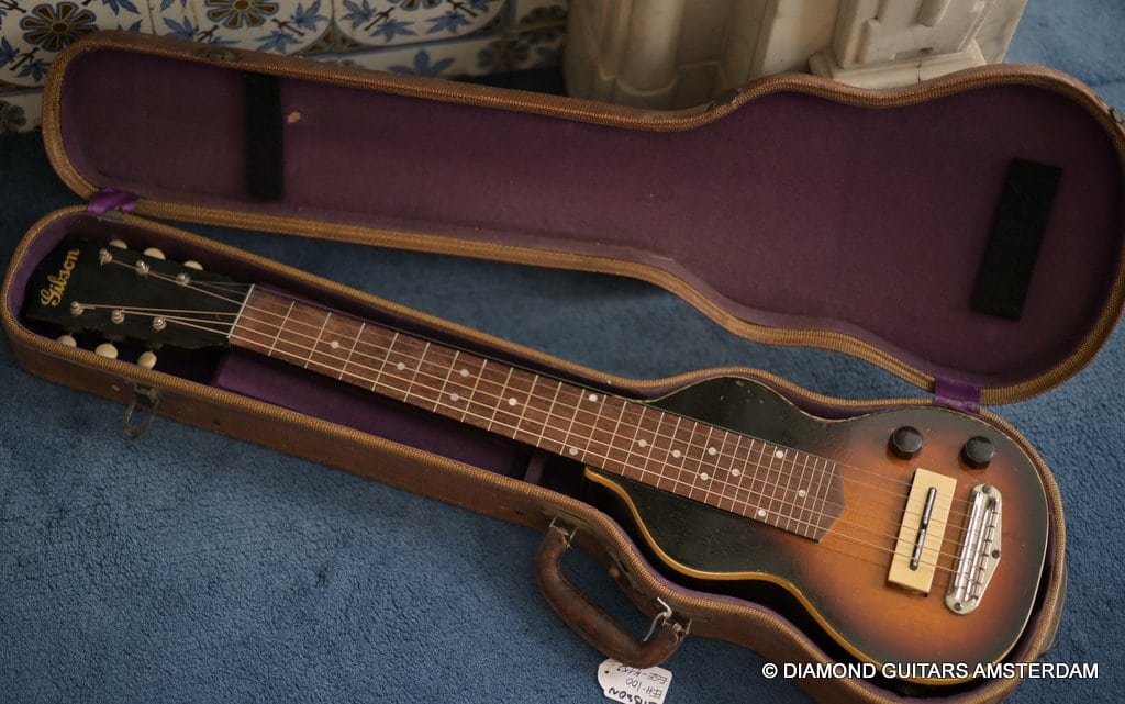 This sweet Gibson EH-100 Lap Steel Guitar or ‘Hawaiian’ guitar the first electric stringed instrument and hit the market just a few years before Les Paul and Charlie Christian modified their instruments. Gibson stated that this Lap Steel ‘had the quality and tone that players have dreamed about, but have never been able to find in an electric guitar before’, while highlighting ‘its great sustaining power’. The Gibson logo is cut-out of metal and mounted onto a solid cast piece. Original Grove open back tuners work great. More info on Gibson Lap Steels HERE