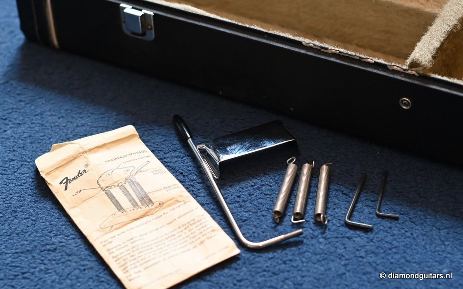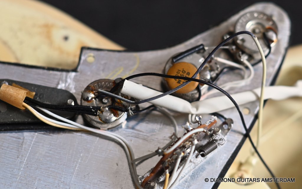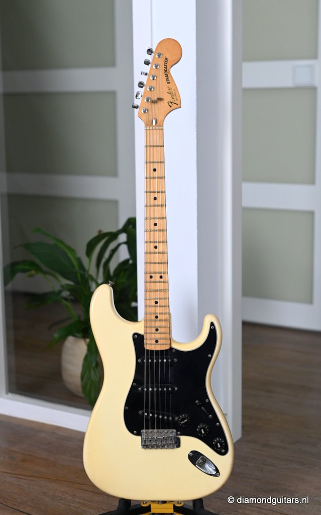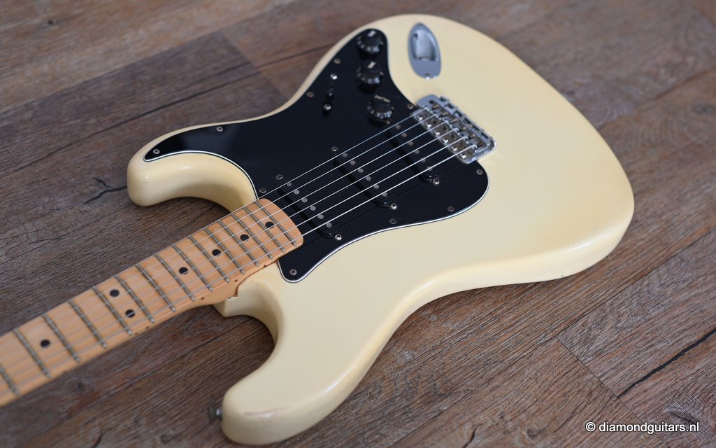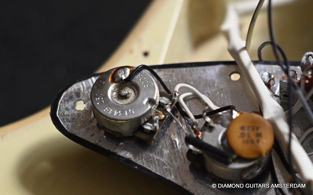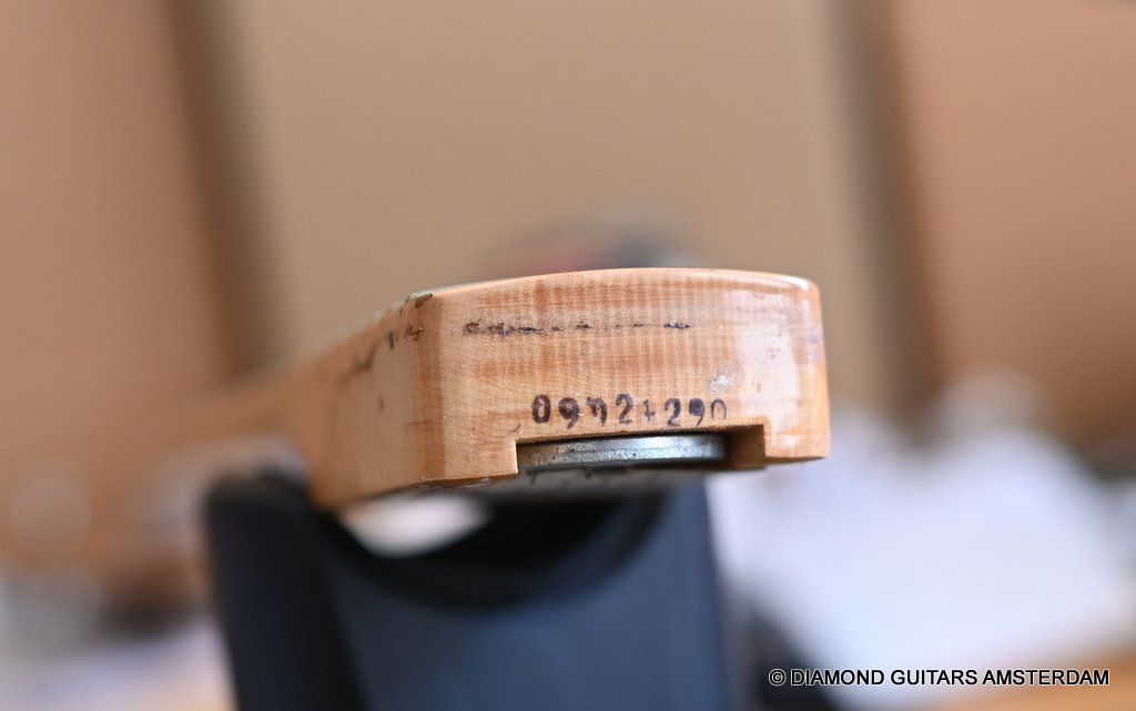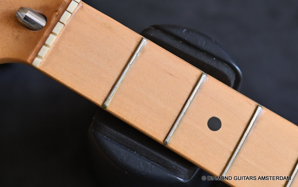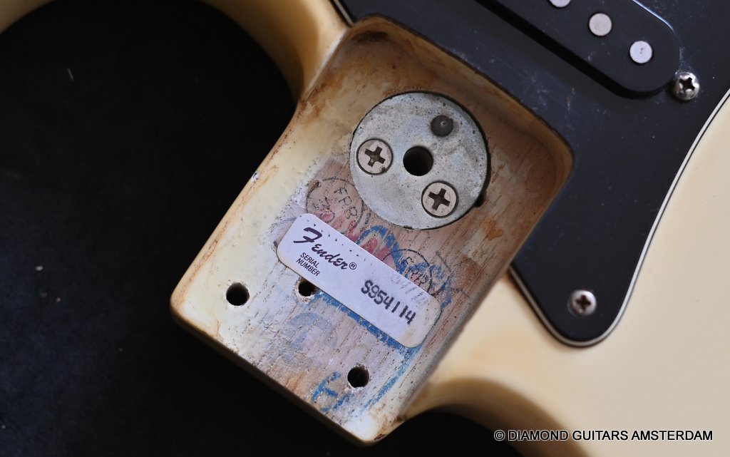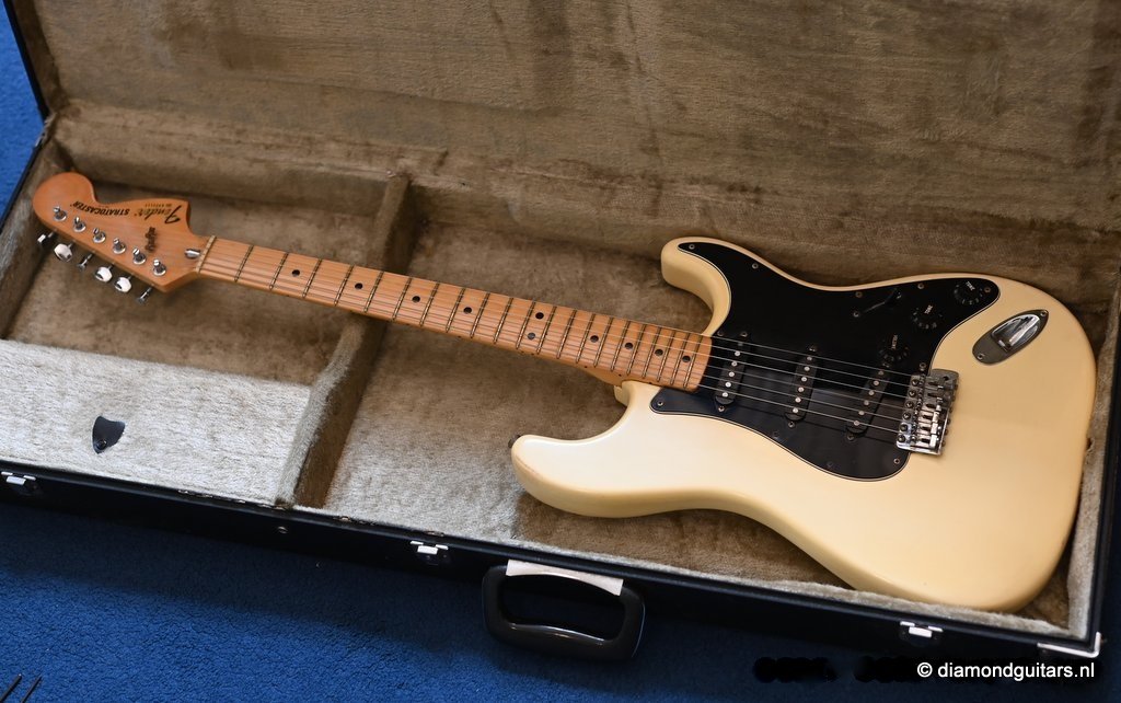 The Olympic White finish has faded to that wonderful cream color. There are the expected but modest knicks and bumps, nothing too substantial. The neck is clean, no dings. A well treated guitar. Frets are in good condition, with the usual playwear on the lower frets. The plastics as you’d expect have faded a little, but there is not too much wear. Electronically, she’s also all-original. Many classic Strat tones live in these late 70s guitars. Plenty of spanky brightness with a pleasing warmer tone from the neck pickup. A great looking guitar with tone to match. Your foothold on the ladder or the perfect live foil. Comes with original claw cover and ashtray and non-original hardshell case. With only 4.35 kg / 9,59 lbs, she ain’t a lightweight, but compared to most of her siblings, she sure is. In return, she offers a solid tone and sustain like no other. She’s all original but for the case. Her condition is excellent.