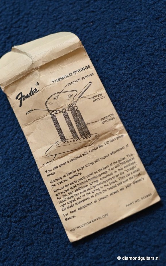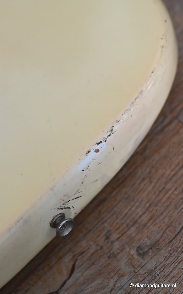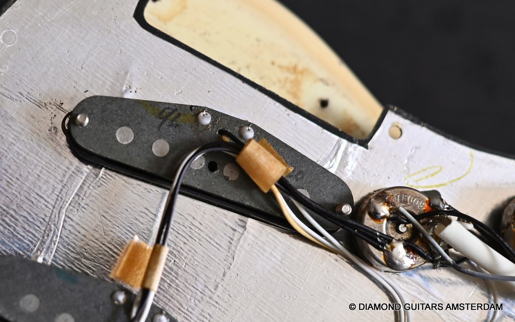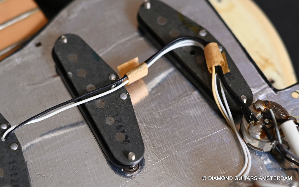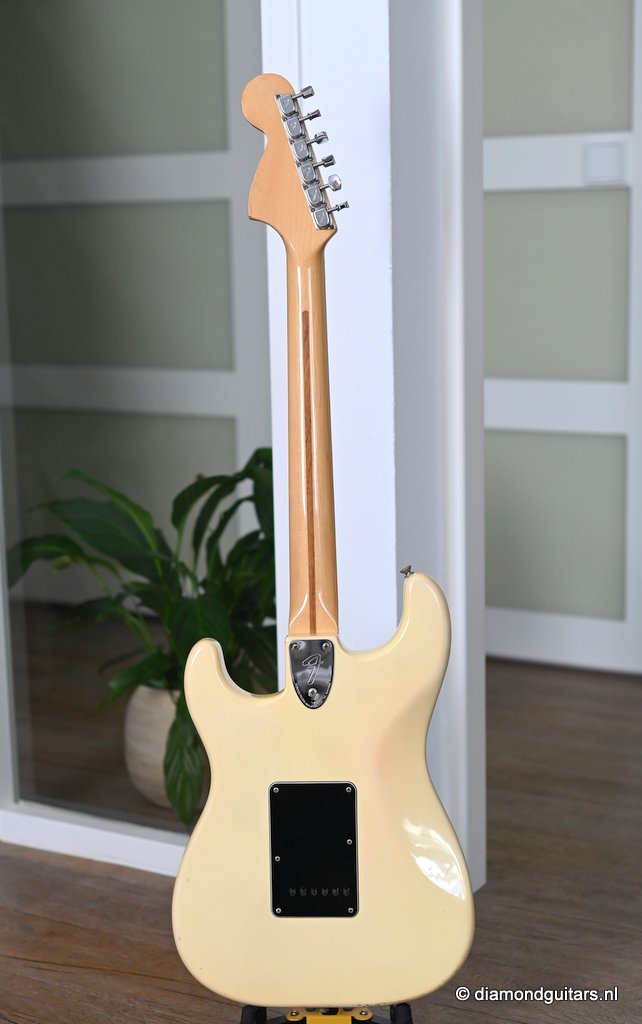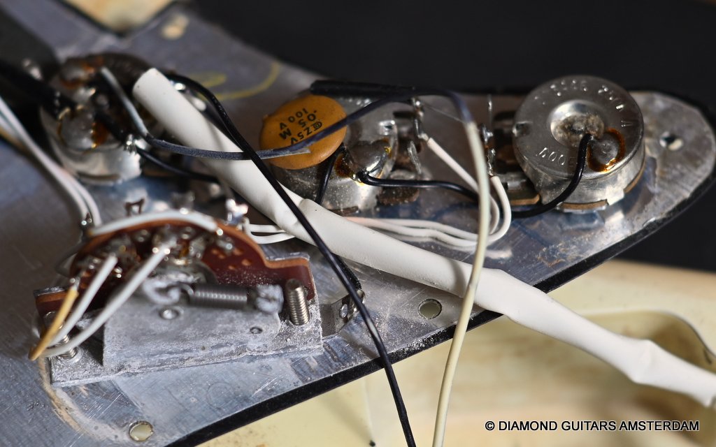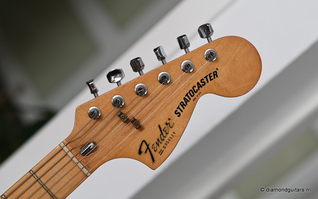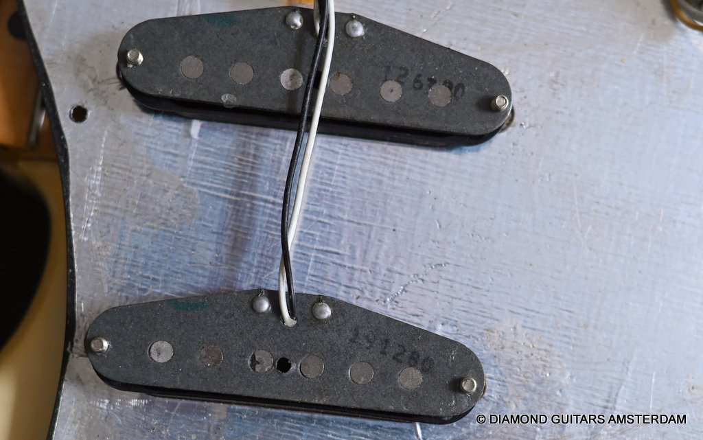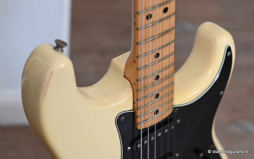 The Olympic White finish has faded to that wonderful cream color. There are the expected but modest knicks and bumps, nothing too substantial. The neck is clean, no dings. A well treated guitar. Frets are in good condition, with the usual playwear on the lower frets. The plastics as you’d expect have faded a little, but there is not too much wear. Electronically, she’s also all-original. Many classic Strat tones live in these late 70s guitars. Plenty of spanky brightness with a pleasing warmer tone from the neck pickup. A great looking guitar with tone to match. Your foothold on the ladder or the perfect live foil. Comes with original claw cover and ashtray and non-original hardshell case. With only 4.35 kg / 9,59 lbs, she ain’t a lightweight, but compared to most of her siblings, she sure is. In return, she offers a solid tone and sustain like no other. She’s all original but for the case. Her condition is excellent.