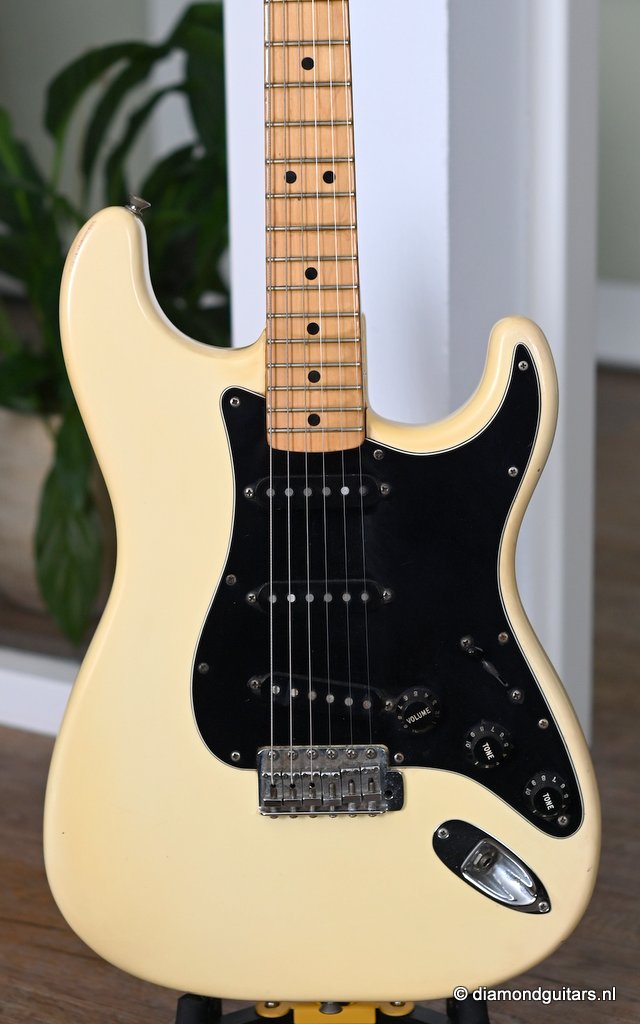 1979 Fender Stratocaster dressed in the rare Olympic White and build with an Ash body and Maple neck and fretboard in excellent, all original condition. A classic vintage!