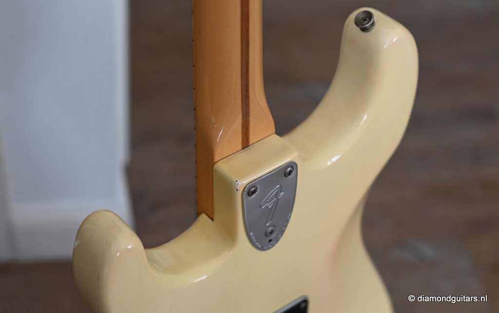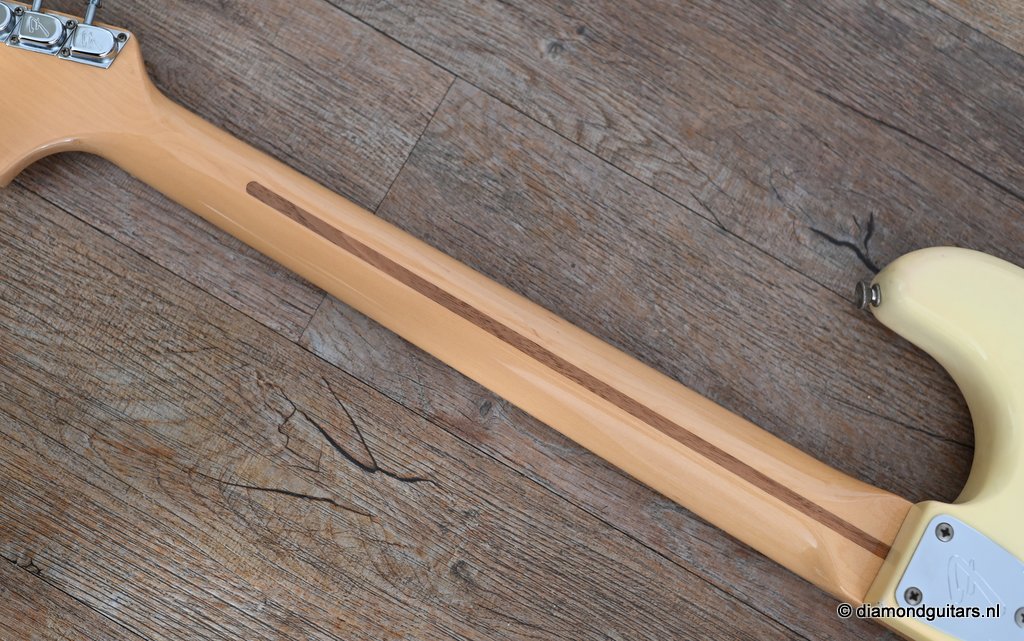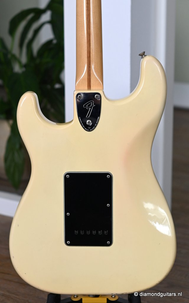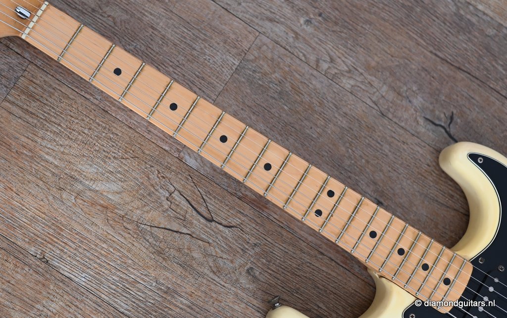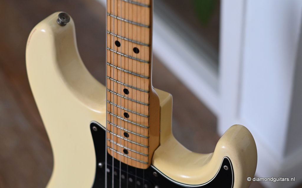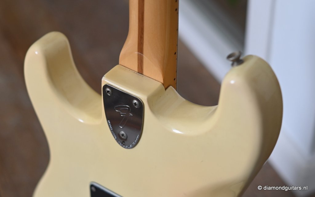 This is the 1979 Fender Stratocaster with the large head, the modern logo and the string guide in 2 locations. She represents the quintessential 70s Strat used by many famous guitarists like The Edge, Ritchie Blackmore, Yngwie Malmsteen, Walter Trout and Mark Knopfler just to name a few. The one with the bullet truss rod that allows you to adjust the neck from the head side without removing the neck. The neck is fitted with a 3-point neck joint plate, and hex wrench to easily adjust the neck insertion angle. The body material is white ash, which has been used as standard since around 1976. The dense Ash produces excellent sustain and solid low mids. It uses a round rosewood board where the joining surface of the maple neck and rosewood fingerboard is pasted along the radius, and it features a well-balanced and warm sound in all positions. A vintage-sounding Stratocaster that combines the clear highs typical of this era with solid mid-bass, and the sound won’t be drowned out by distortion.