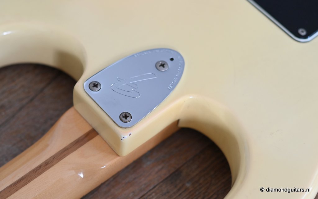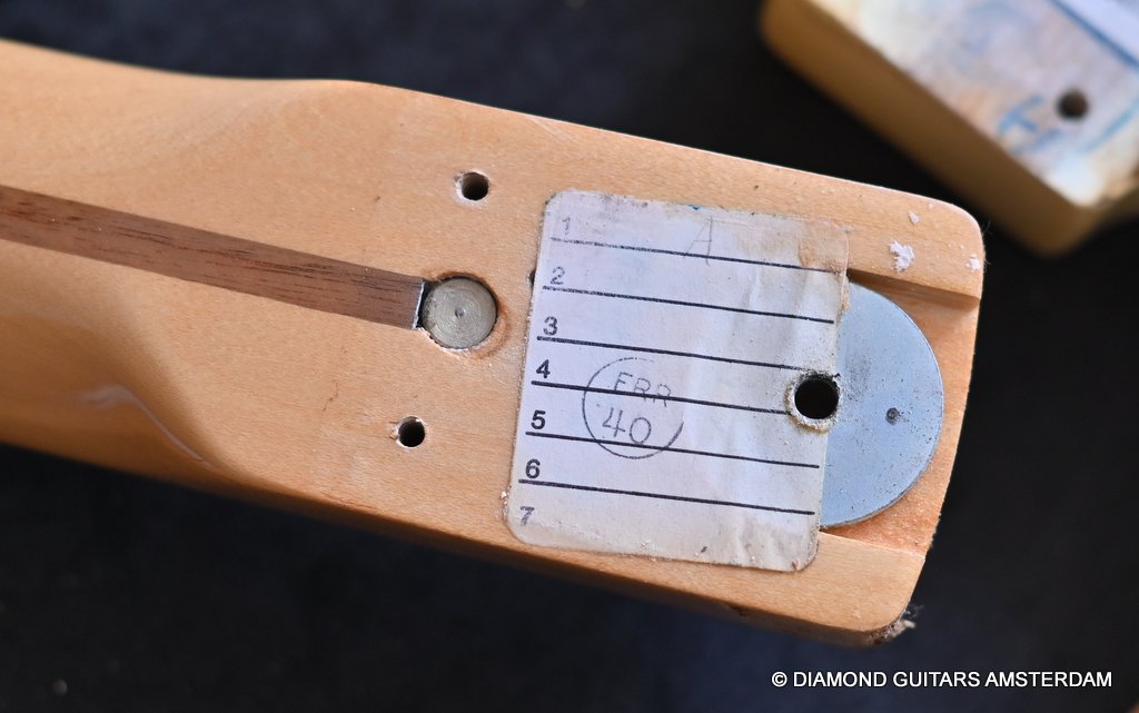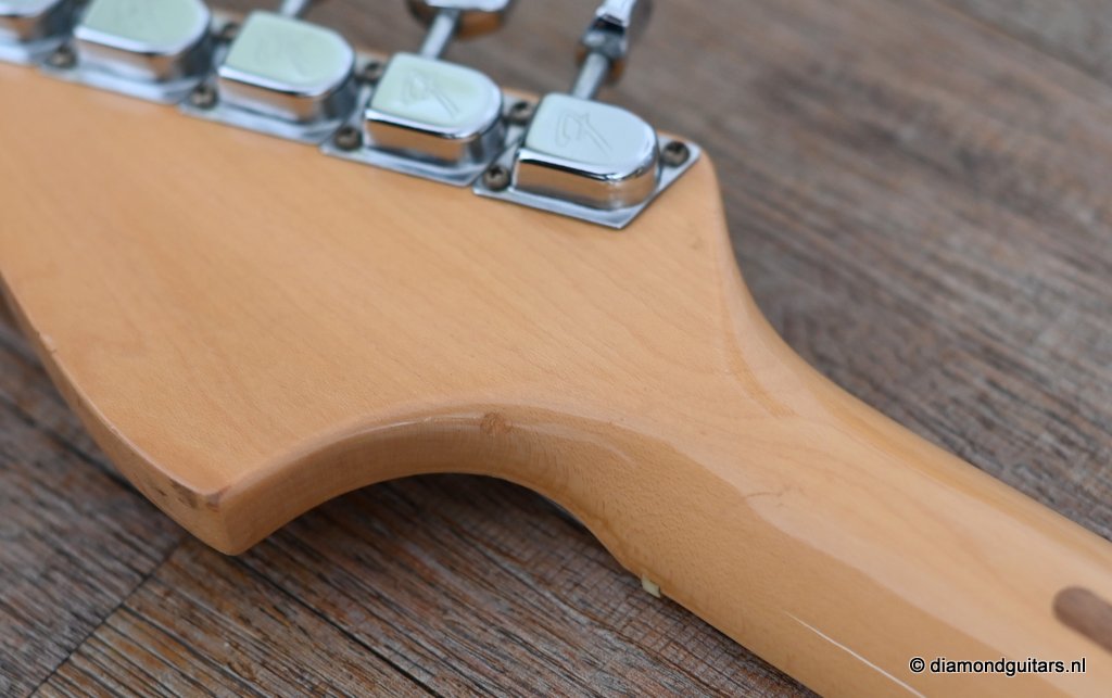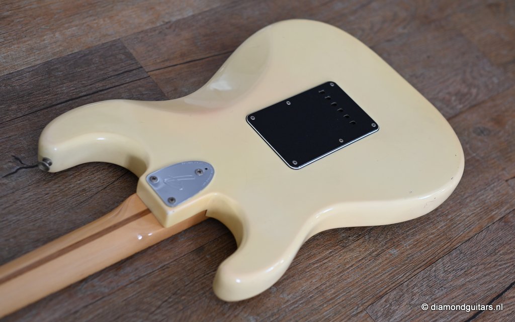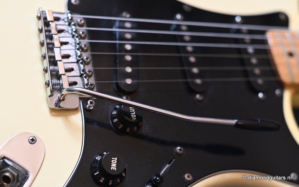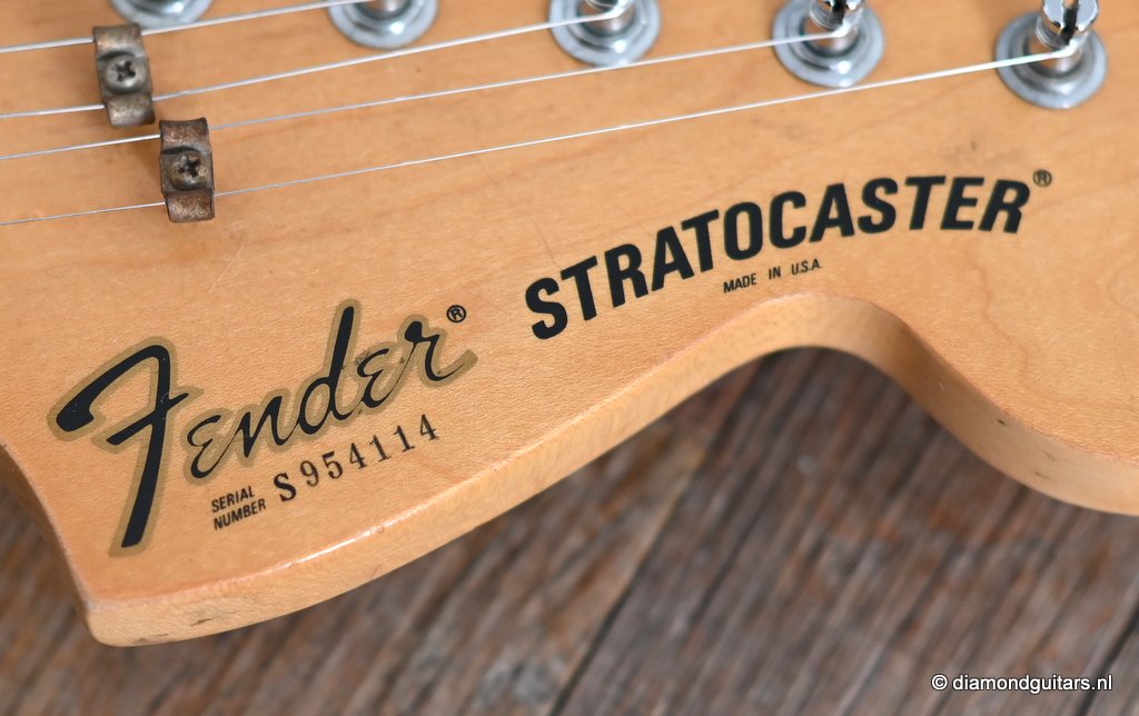This is the 1979 Fender Stratocaster with the large head, the modern logo and the string guide in 2 locations. She represents the quintessential 70s Strat used by many famous guitarists like The Edge, Ritchie Blackmore, Yngwie Malmsteen, Walter Trout and Mark Knopfler just to name a few. The one with the bullet truss rod that allows you to adjust the neck from the head side without removing the neck. The neck is fitted with a 3-point neck joint plate, and hex wrench to easily adjust the neck insertion angle. The body material is white ash, which has been used as standard since around 1976. The dense Ash produces excellent sustain and solid low mids. It uses a round rosewood board where the joining surface of the maple neck and rosewood fingerboard is pasted along the radius, and it features a well-balanced and warm sound in all positions. A vintage-sounding Stratocaster that combines the clear highs typical of this era with solid mid-bass, and the sound won’t be drowned out by distortion.