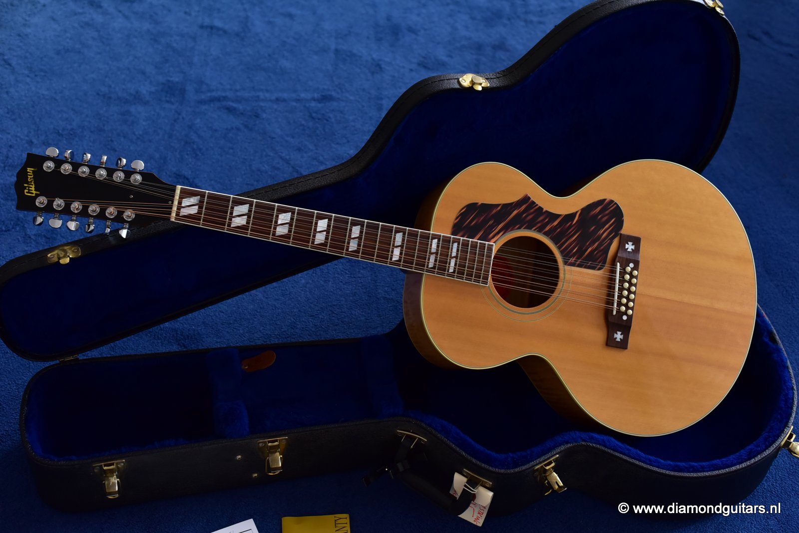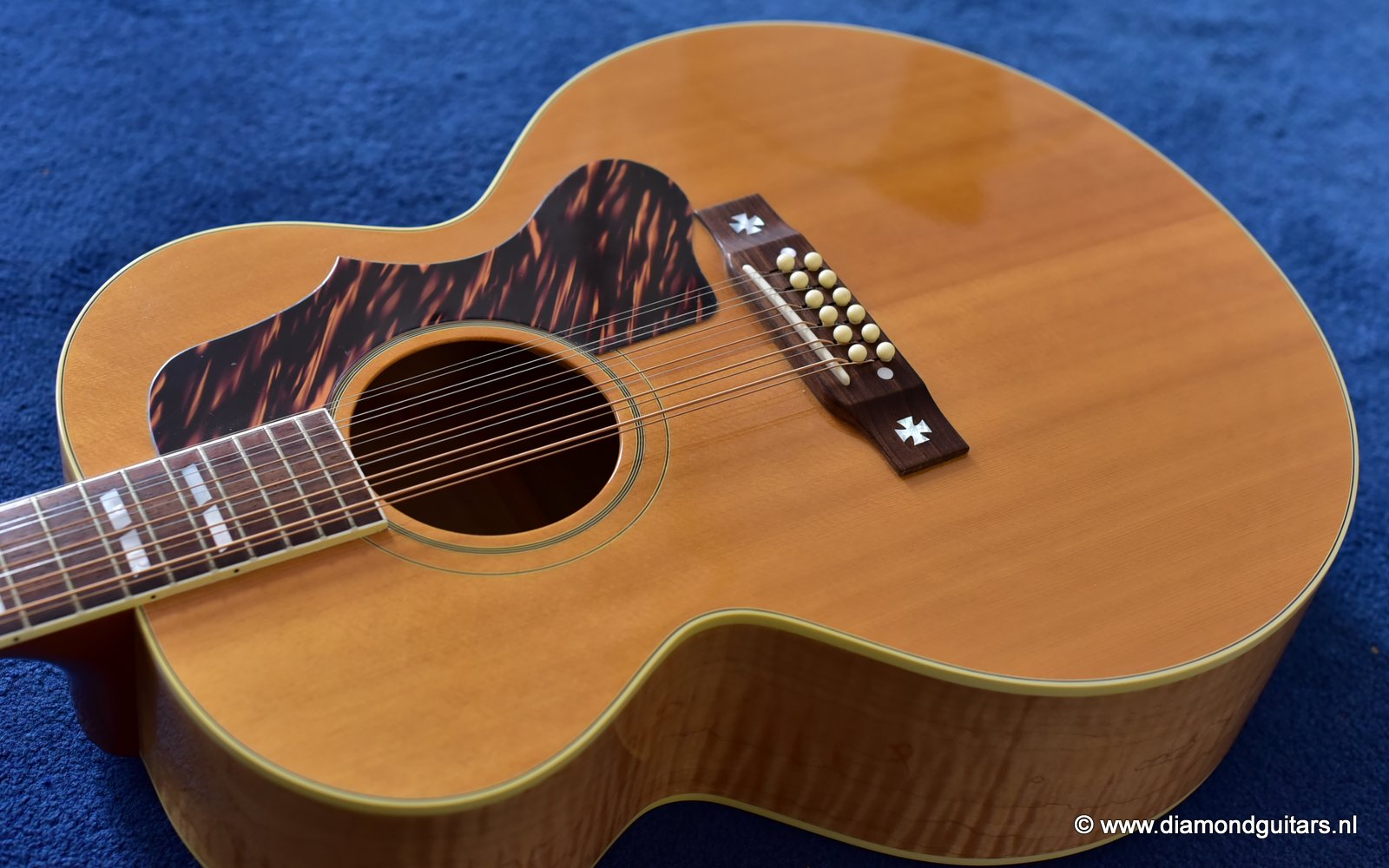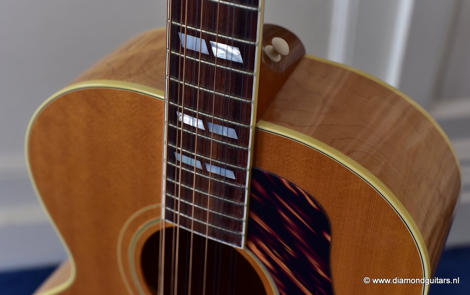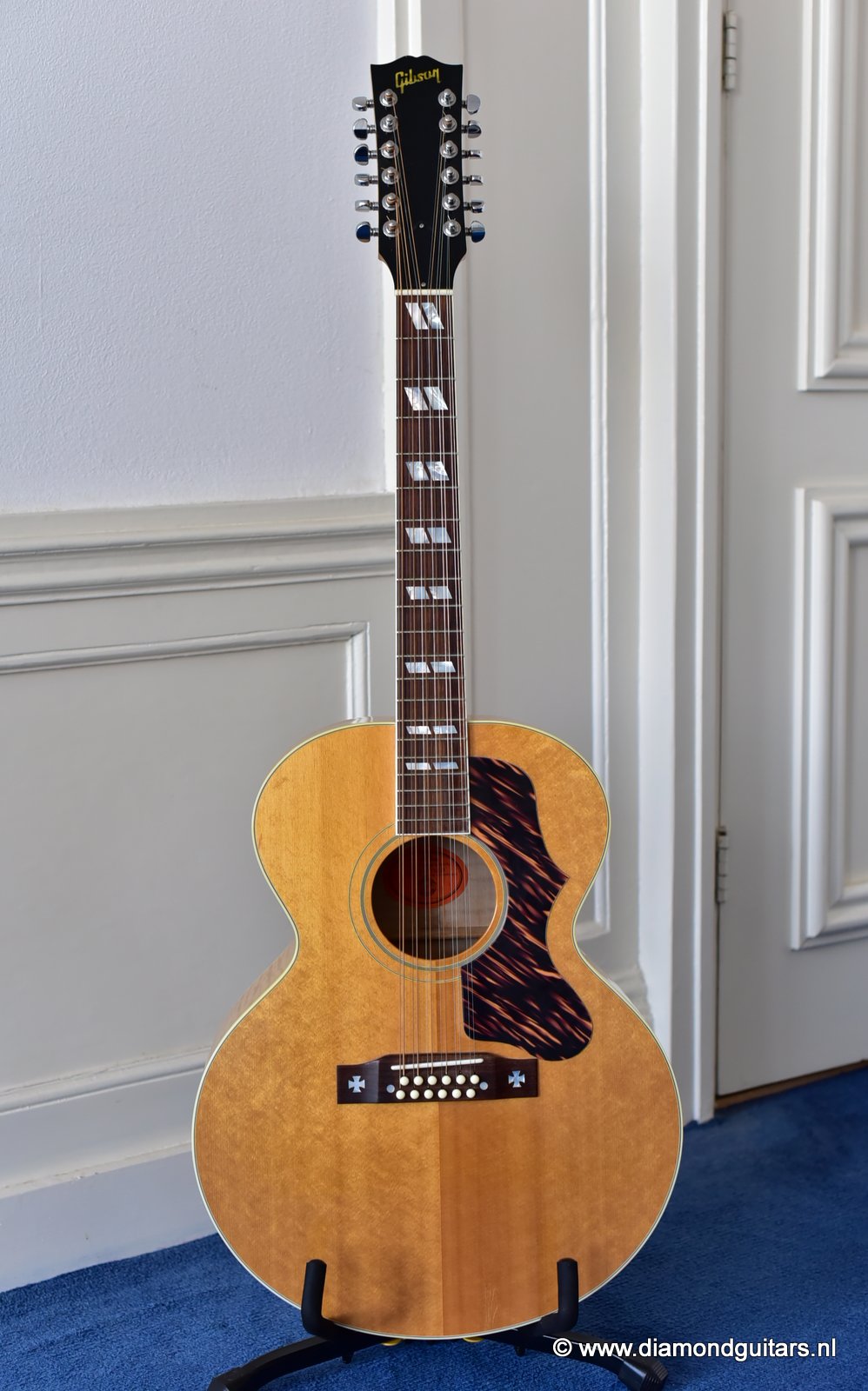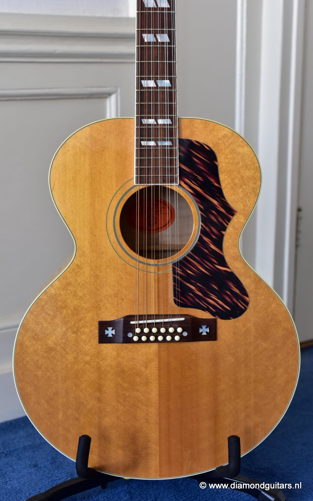 This fine Gibson J-185 12-string was build end of 2001 in the Gibson Bozeman plant in Montana. She is in EXCELLENT condition with some typical light play wear – various minor nicks & dings; surface scratches & mild weather checking. The neck is the well known wide, flat profile Mahogany neck with cream binding & black side-dots. A dark Rosewood fingerboard with Mother of Pearl double parallelogram inlays. Frets show some wear, but have tons of life in them. Grover mini tuners are in perfect working condition. Hit the soundcloud logo to hear a sound impression of this fine lady. Consignment sale, no trades.