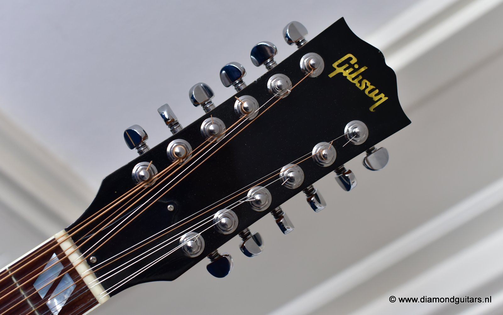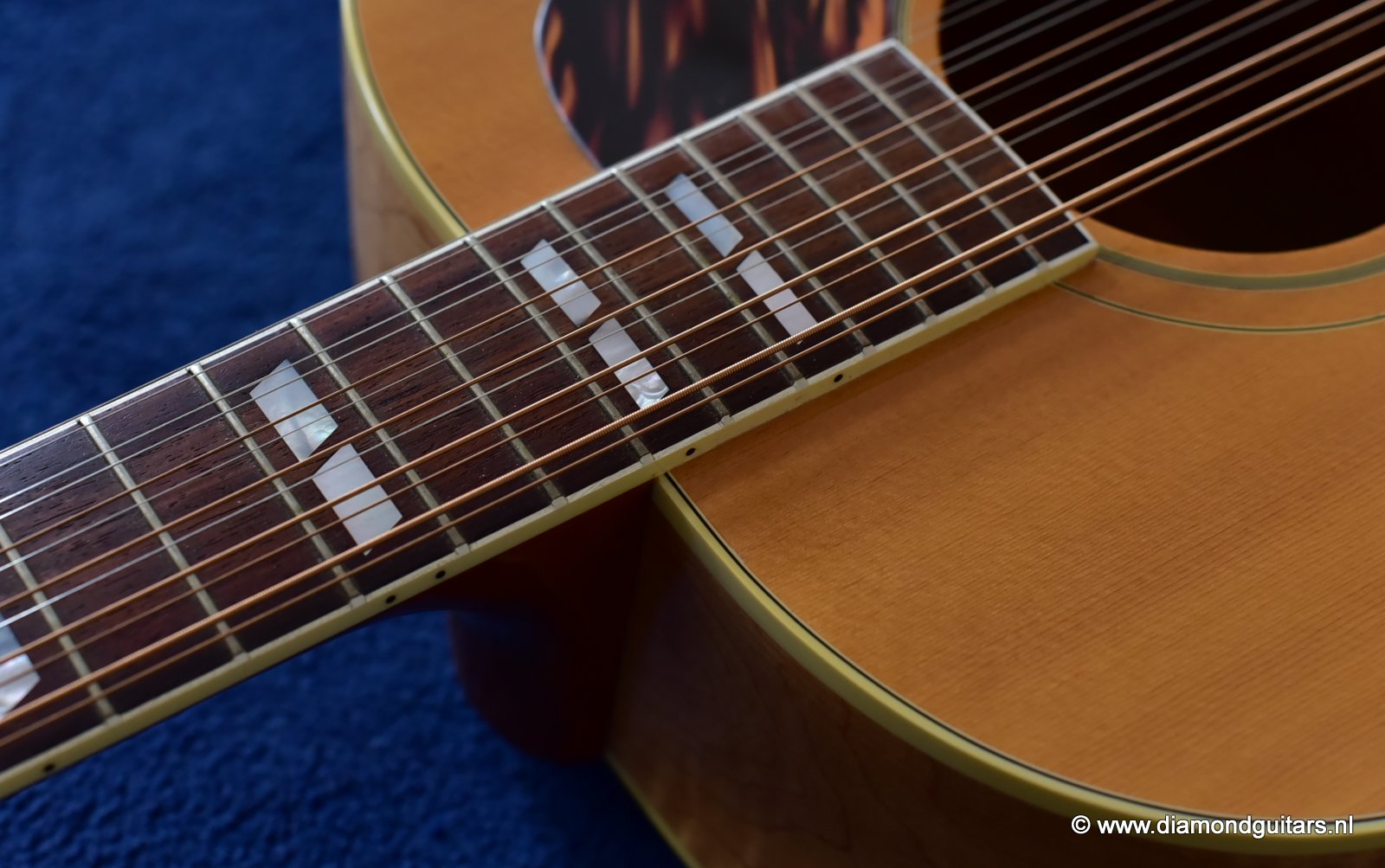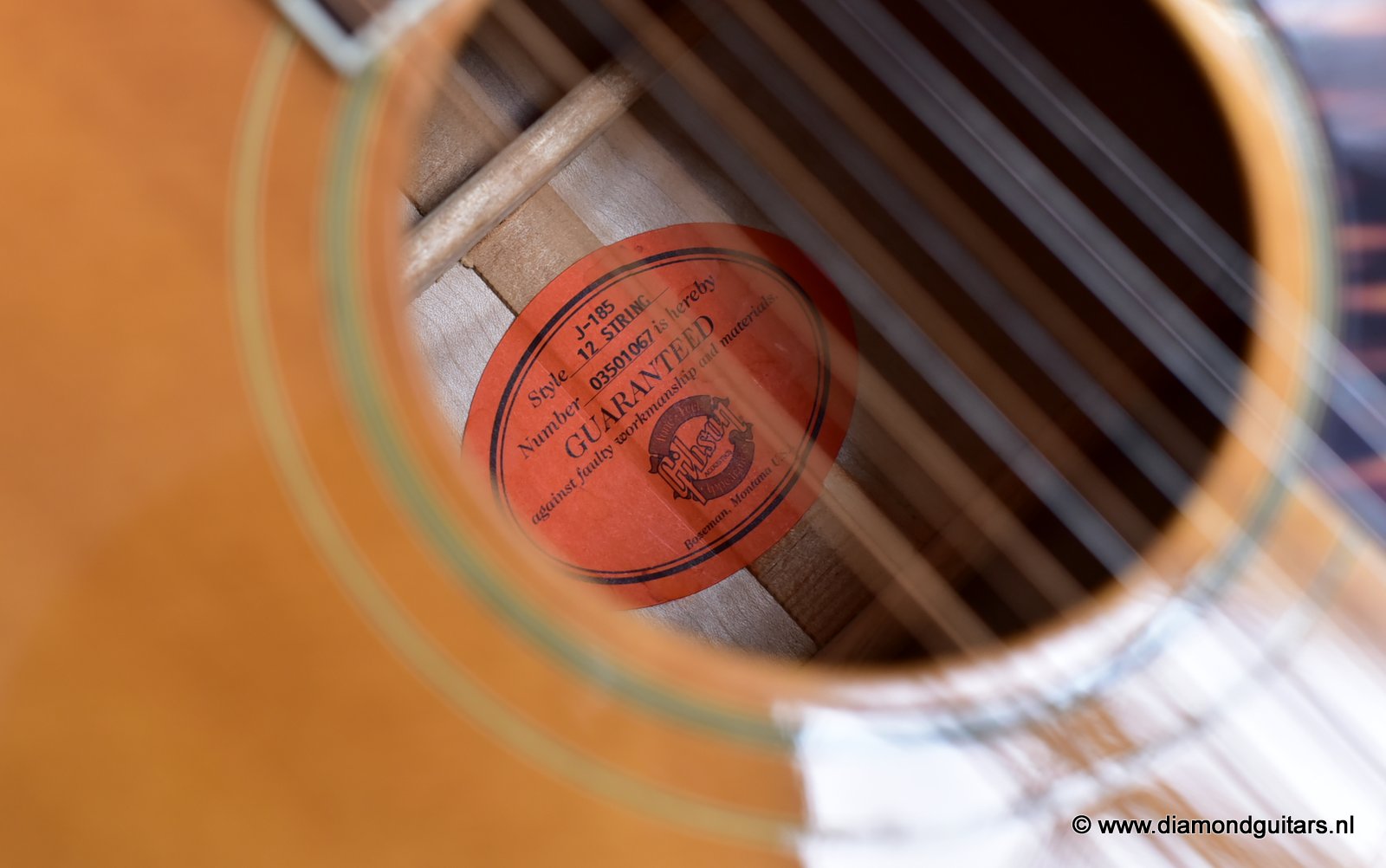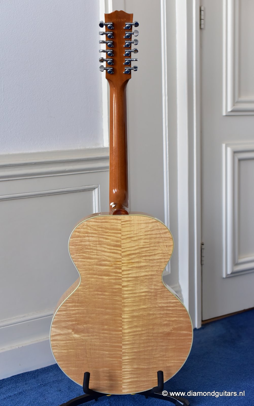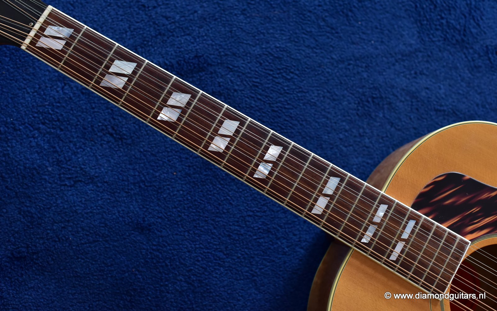 This fine Gibson J-185 12-string was build end of 2001 in the Gibson Bozeman plant in Montana. She is in EXCELLENT condition with some typical light play wear – various minor nicks & dings; surface scratches & mild weather checking. The neck is the well known wide, flat profile Mahogany neck with cream binding & black side-dots. A dark Rosewood fingerboard with Mother of Pearl double parallelogram inlays. Frets show some wear, but have tons of life in them. Grover mini tuners are in perfect working condition. Hit the soundcloud logo to hear a sound impression of this fine lady. Consignment sale, no trades.