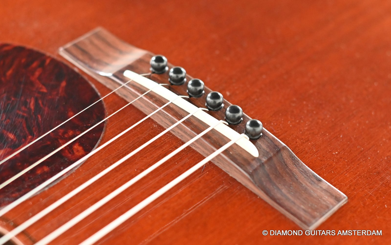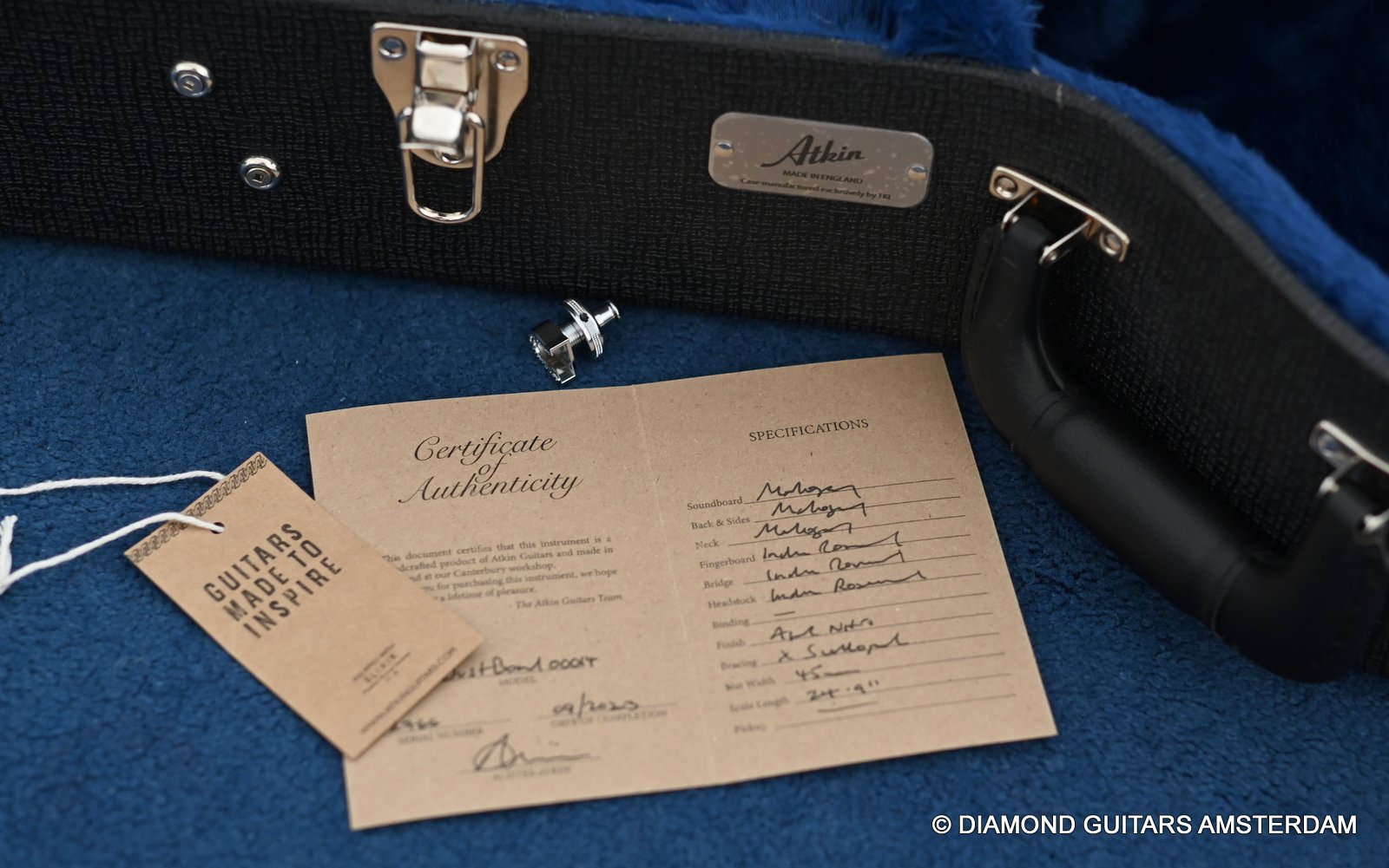This Atkin Dust Bowl 00014 is inspired by depression era guitars of the 1930’s. A lightweight all-mahogany body construction, scalloped braces, and soft-V neck carve that hugs your hand. The 16″ radius Indian Rosewood fingerboard with rounded-over edges makes ‘thumb-overtop’ playing easy and comfortable.