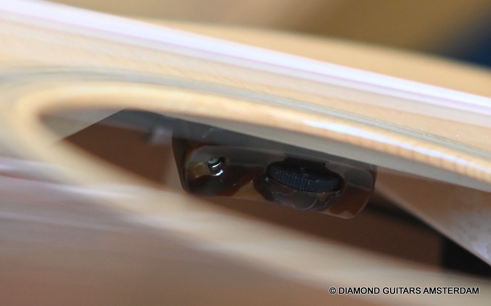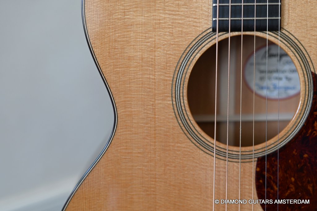 The pickup system – which is not usually included in Bourgeois guitars as a standard feature – utilizes the LR Baggs Lyric, a high-quality internal microphone. What is unique about this feature is that the sound wheel is recessed back in the sound hole much farther than most manufacturers, keeping it hidden and discrete. Like most torrefied Sitka Spruce / Mahogany guitars, the Generation Series has a warm, dry, direct and defined sound. Due to its clarity, she makes an excellent recording guitar. When you listen to it played both acoustically and plugged in to an amp, the guitar sounds remarkably similar — the LR Baggs Lyric does a phenomenal job capturing the character of whatever guitar they are in.