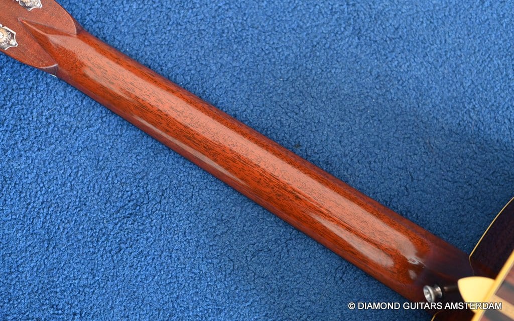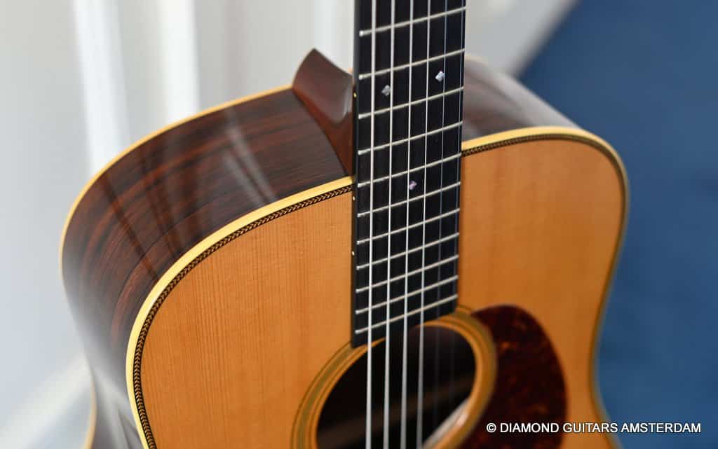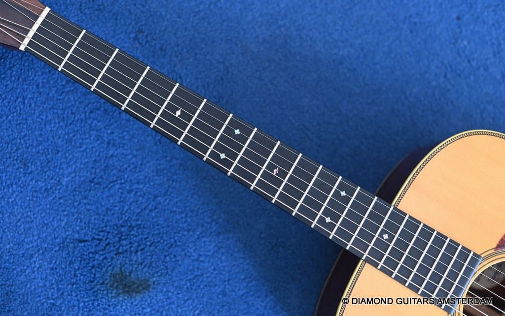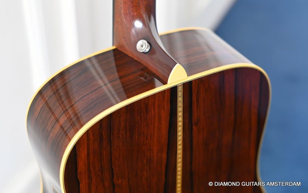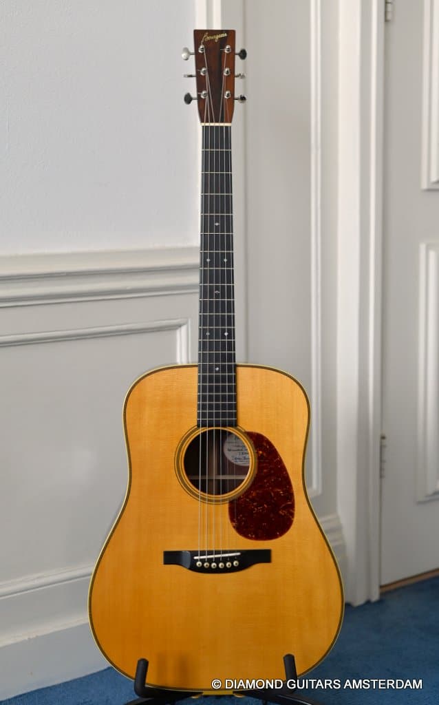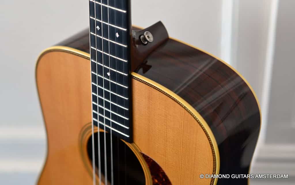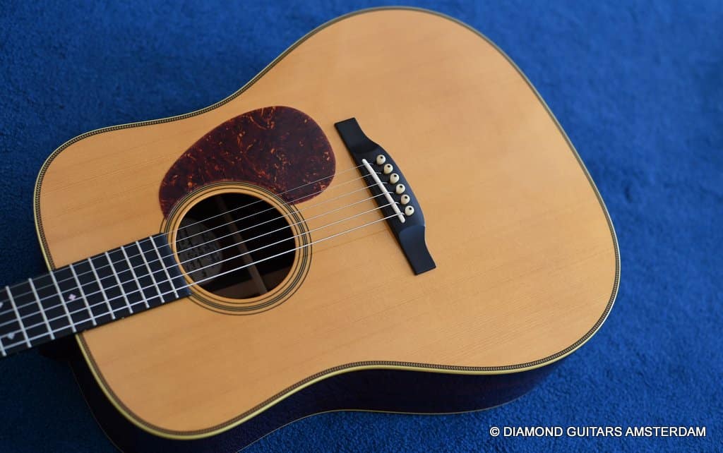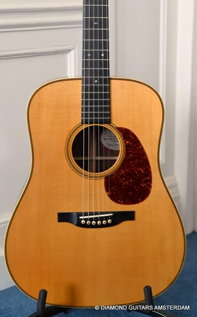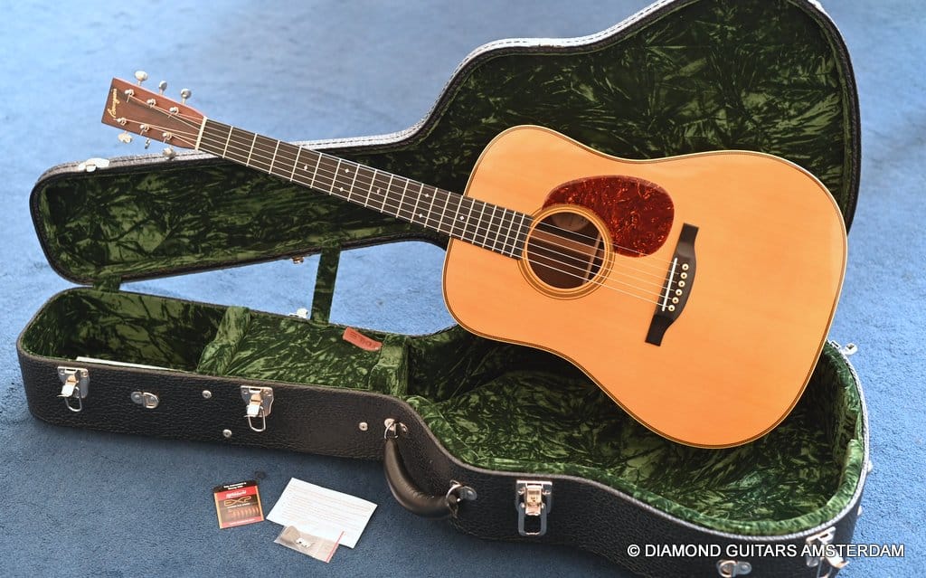 Playing this guitar is like picking on a pre-war D-28. It’s a fantastic reproduction of that classic dreadnought everyone is looking for. One welcome difference is the bolt-on neck which means no expensive neck resets down the road. This guitar is in excellent condition, with no dings or scratchers. Only some minor fret wear. This only two-owner guitar has been very well looked after. Listen to a sound sample here: