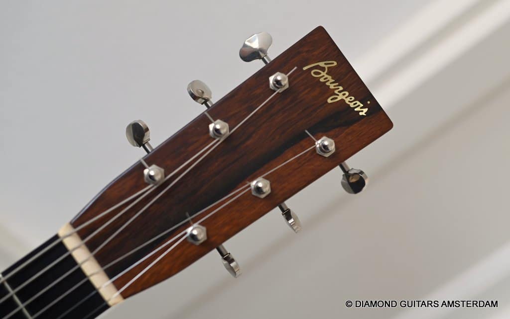 To the table comes a premium Adirondack Red Spruce top, lush figured and dark Madagascar Rosewood and Honduras Mahogany. The wood combination was originally conceived to highlight Madagascar Rosewood back & sides, which Dana was an early proponent of as a worthy Brazilian Rosewood substitute. ‘Madagascar Rosewood will probably get you closest to the sound of Brazilian but at a more affordable price. Madagascar Rosewood has much of the same rich overtone range as Brazilian, as well as a slightly “reverby” quality.’ Constructed with Hot Hide Glue and finished with Oil Varnish all the ingredients for a lively and bold dreadnought are there. Thus, this Bourgeois D Vintage Varnish is bold, impressive.