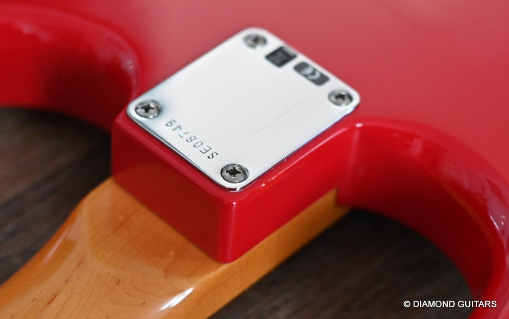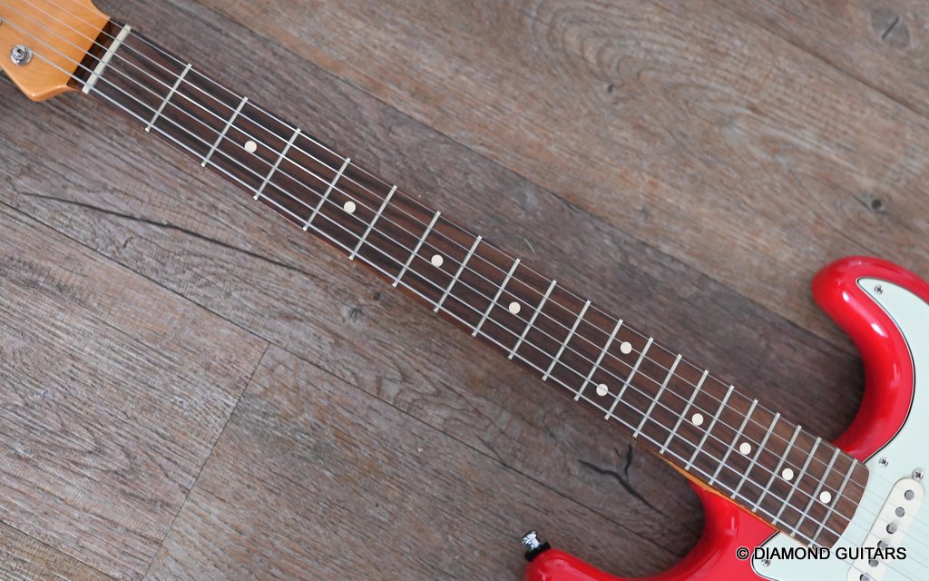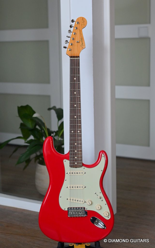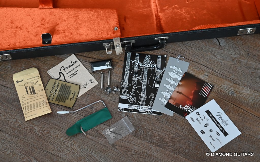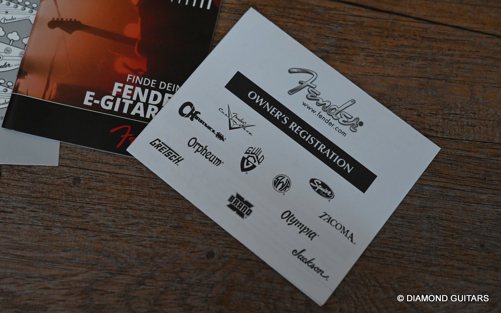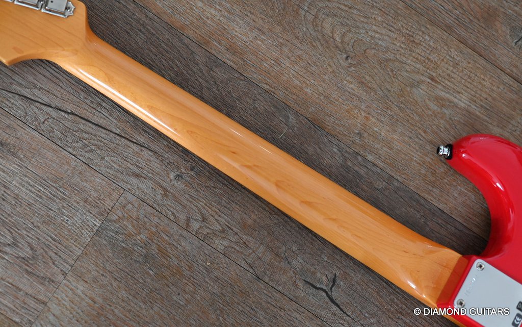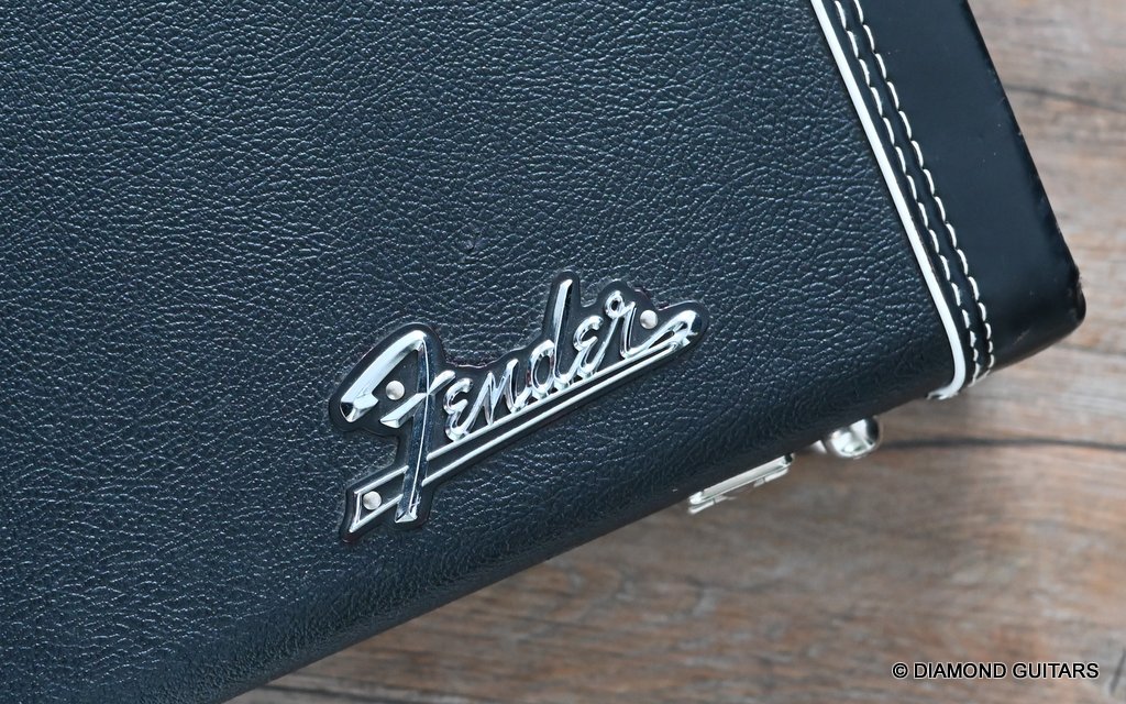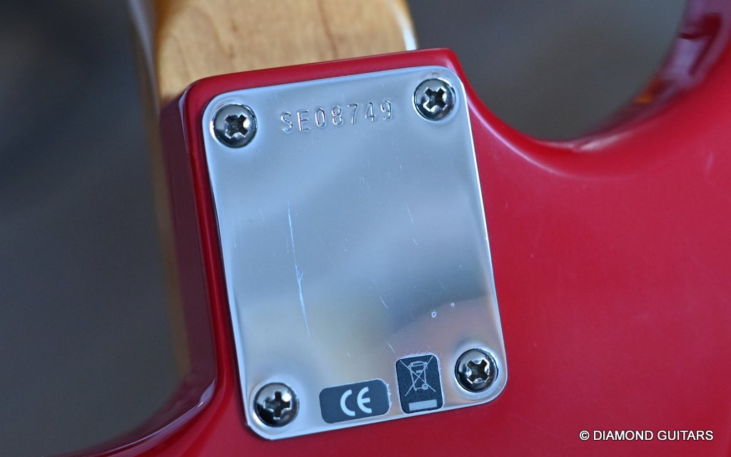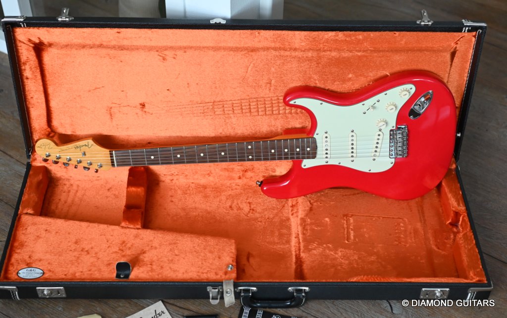 She produces a very fresh and lively sound coming from the Texas Special single coils transmitting the sound of this red icon in the best manner to the amp and conjure up a big grin on your face: bluesy, warm and belly, just as you know it from Mark Knopfler! She has been played but was very well taken care of. Fret work is great, some scratches and tiny dings here and there, but nothing obvious. Overall, her condition is excellent.