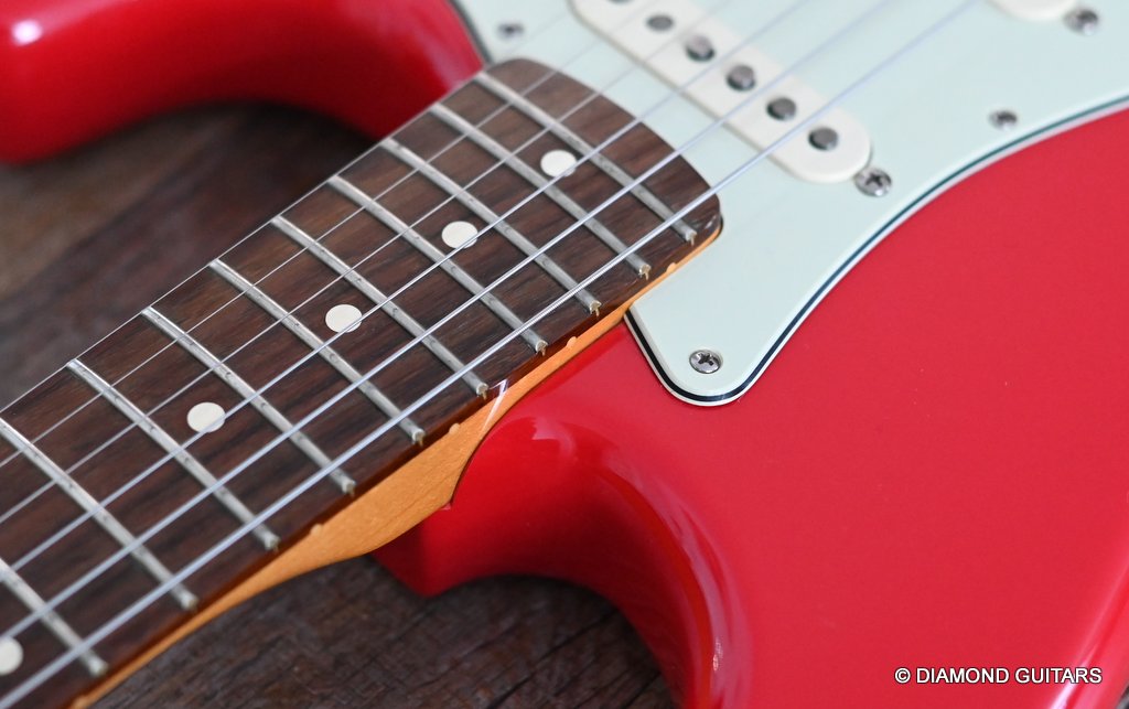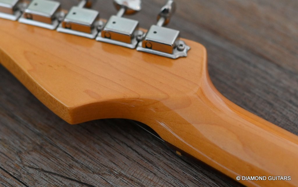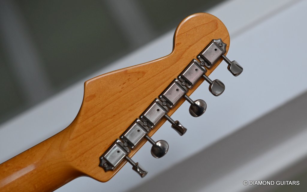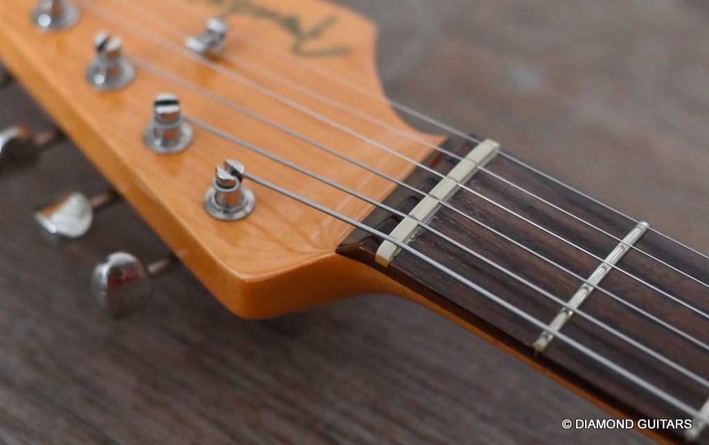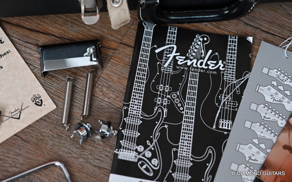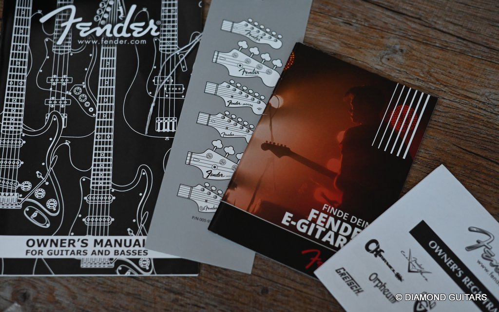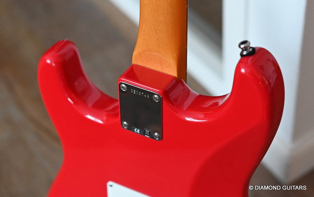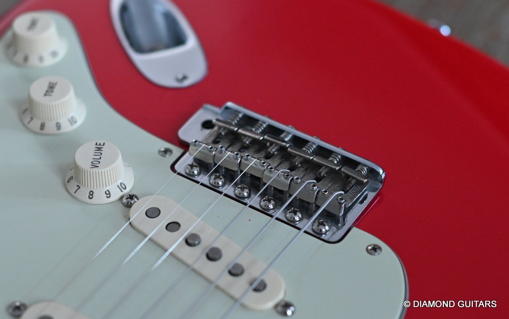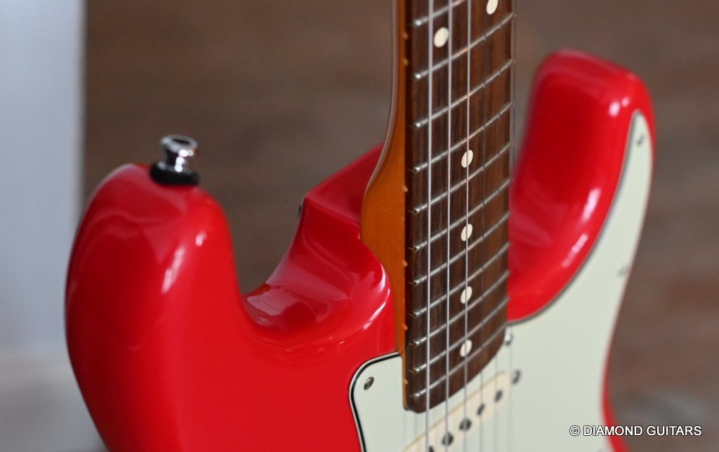 She produces a very fresh and lively sound coming from the Texas Special single coils transmitting the sound of this red icon in the best manner to the amp and conjure up a big grin on your face: bluesy, warm and belly, just as you know it from Mark Knopfler! She has been played but was very well taken care of. Fret work is great, some scratches and tiny dings here and there, but nothing obvious. Overall, her condition is excellent.