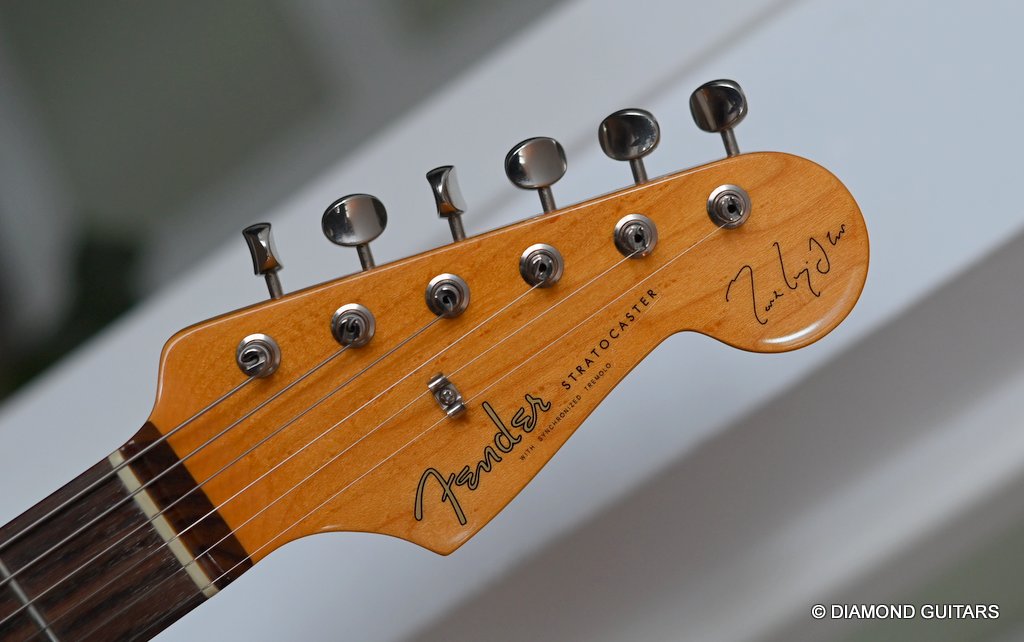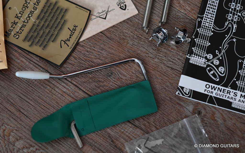 This Fender Mark Knopfler Signature Stratocaster. She’s all original, has some finish wear but overall in excellent condition. She comes with papers and original case. This is the guitar model Mark used to play that well known notes that can be heard in his most famous song ‘Sultan of Swing’. Perhaps the most distinctive guitar voice in the last 30 years. Mark worked with Fender to create a signature guitar that combines all his favorite features like the comfort-contoured ’57 lightweight Ash body, the vintage tinted ’62 C-shaped Maple neck with the Rosewood fretboard, the Texas Special single coil pickups, and American vintage vibrato providing all the sparkle and bite that unique Knopfler tone