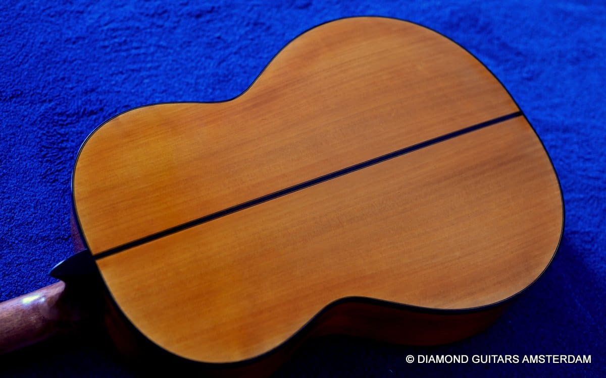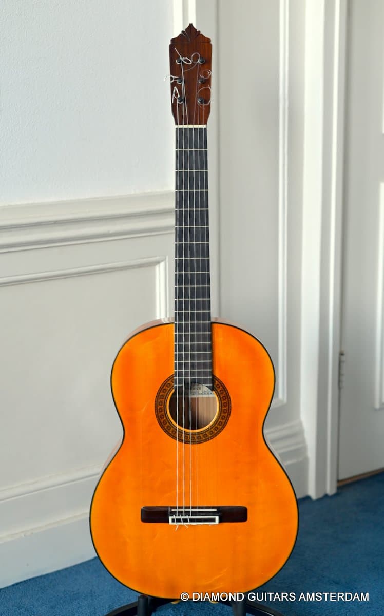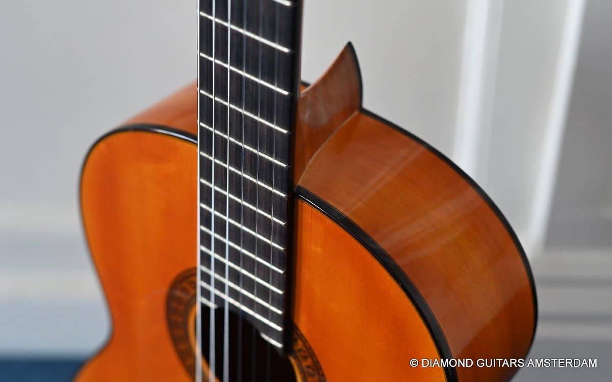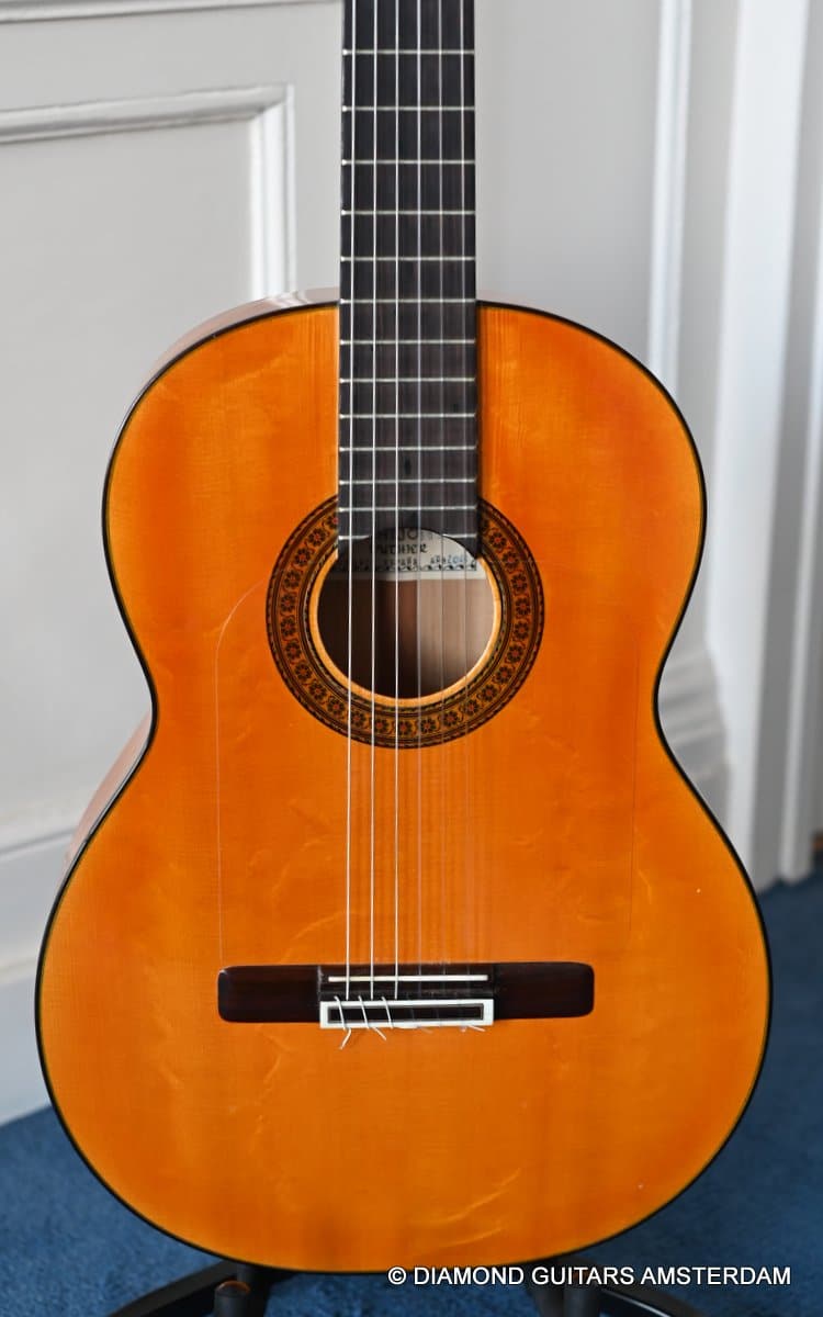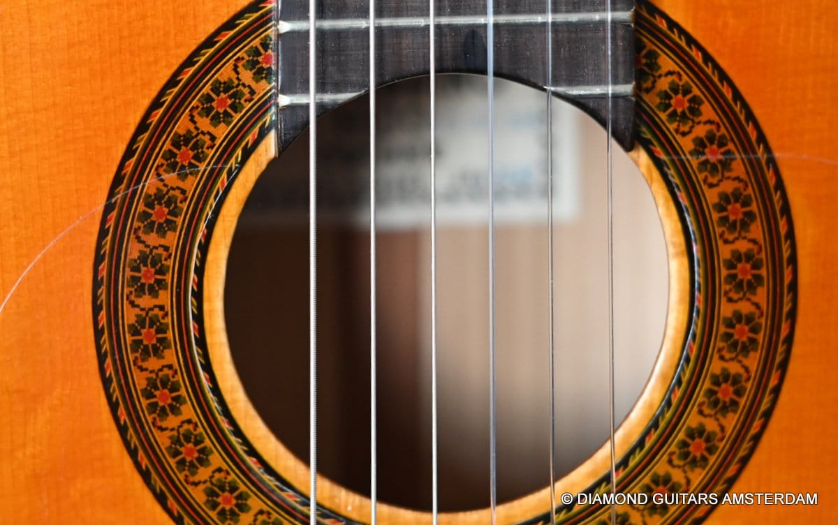 The woods used in this guitar are of an extraordinary quality. The top is mastergrade German Spruce and the back and sides are made of beautiful Cypress. A classic recipe in the best flamenco tradition. Gerundino Hijo succeeded in making a voluminous and dynamic flamenco guitar. This guitar stands out due to its extreme lightness (only 1.2 kg – 2.69lb) and its flamenco timbre. She is the perfect guitar to accompany the singing and dancing. The condition is excellent and original, without any cracks or repairs whatsoever. Current retail price is 4.800 Euro. Listen to a sound sample of the Gerundino Hijo played by Alberto Fernández Romàn
