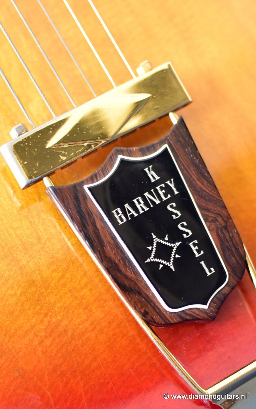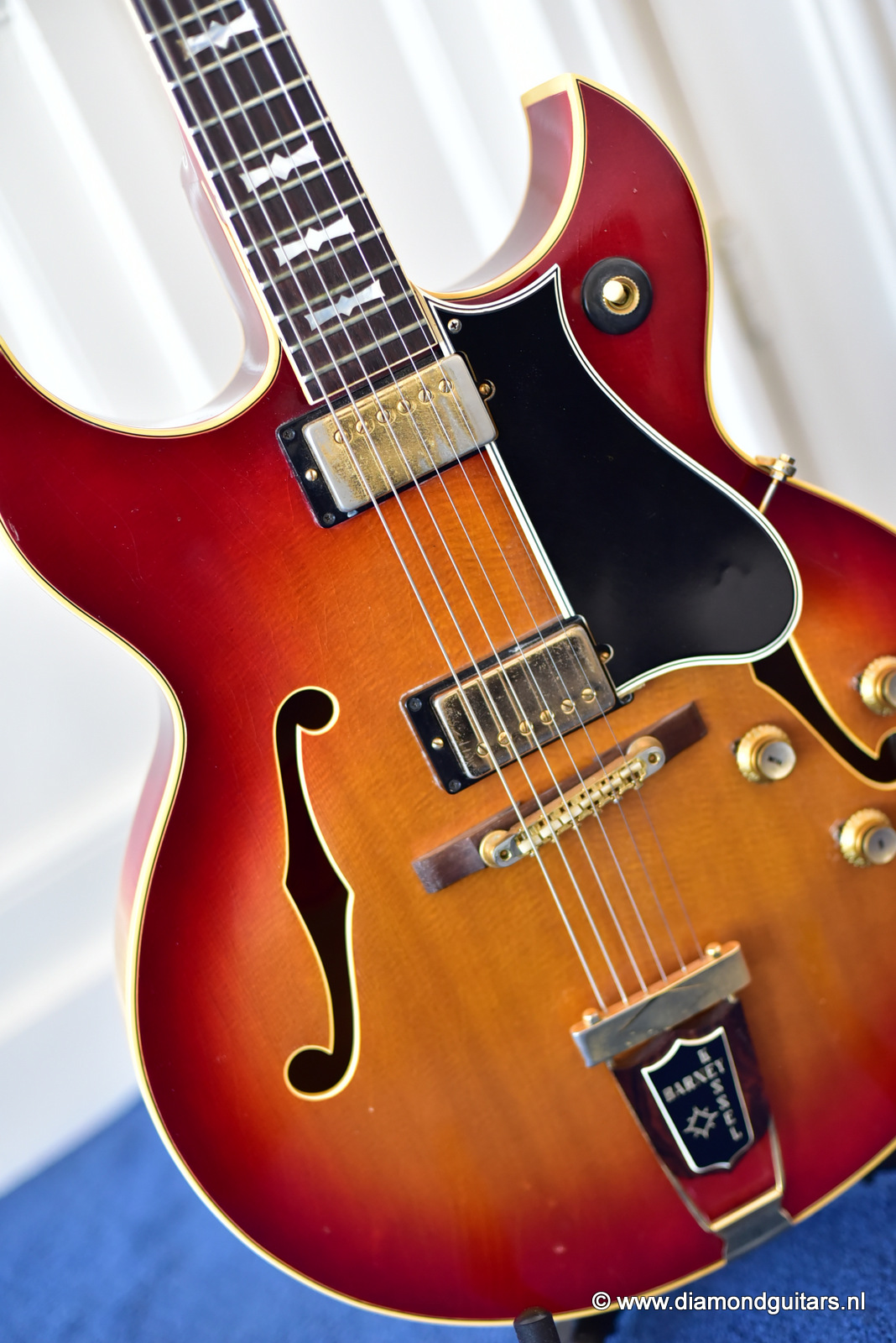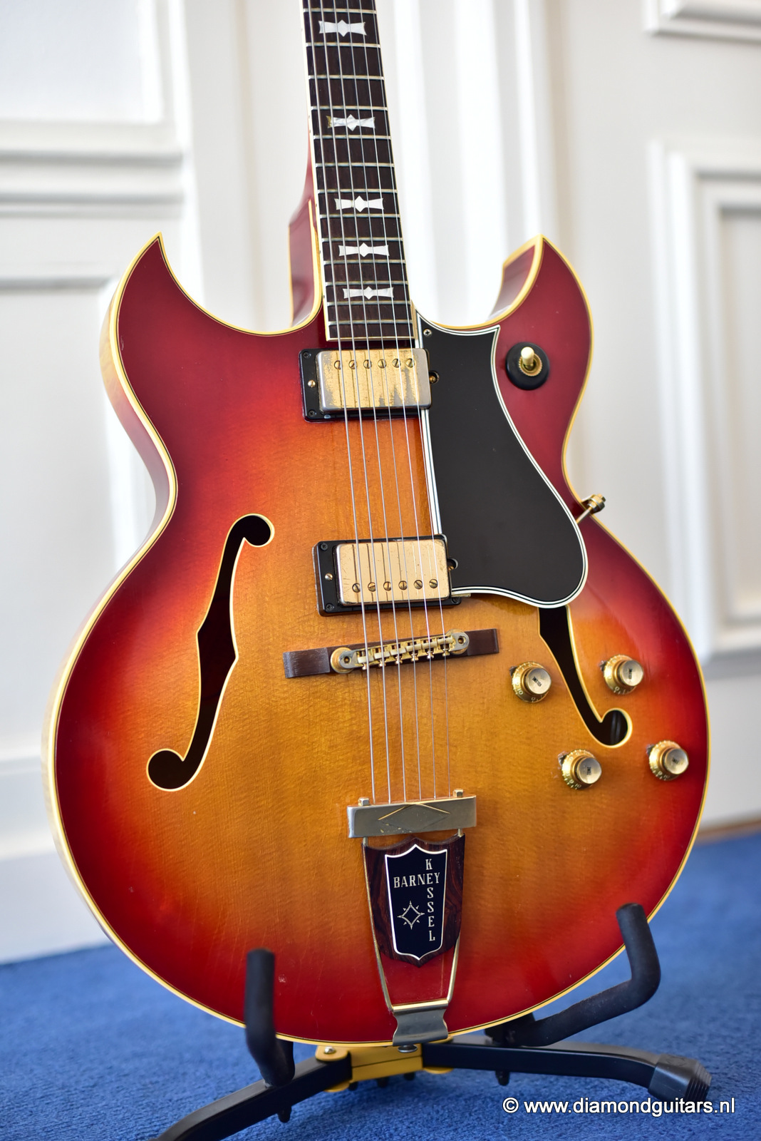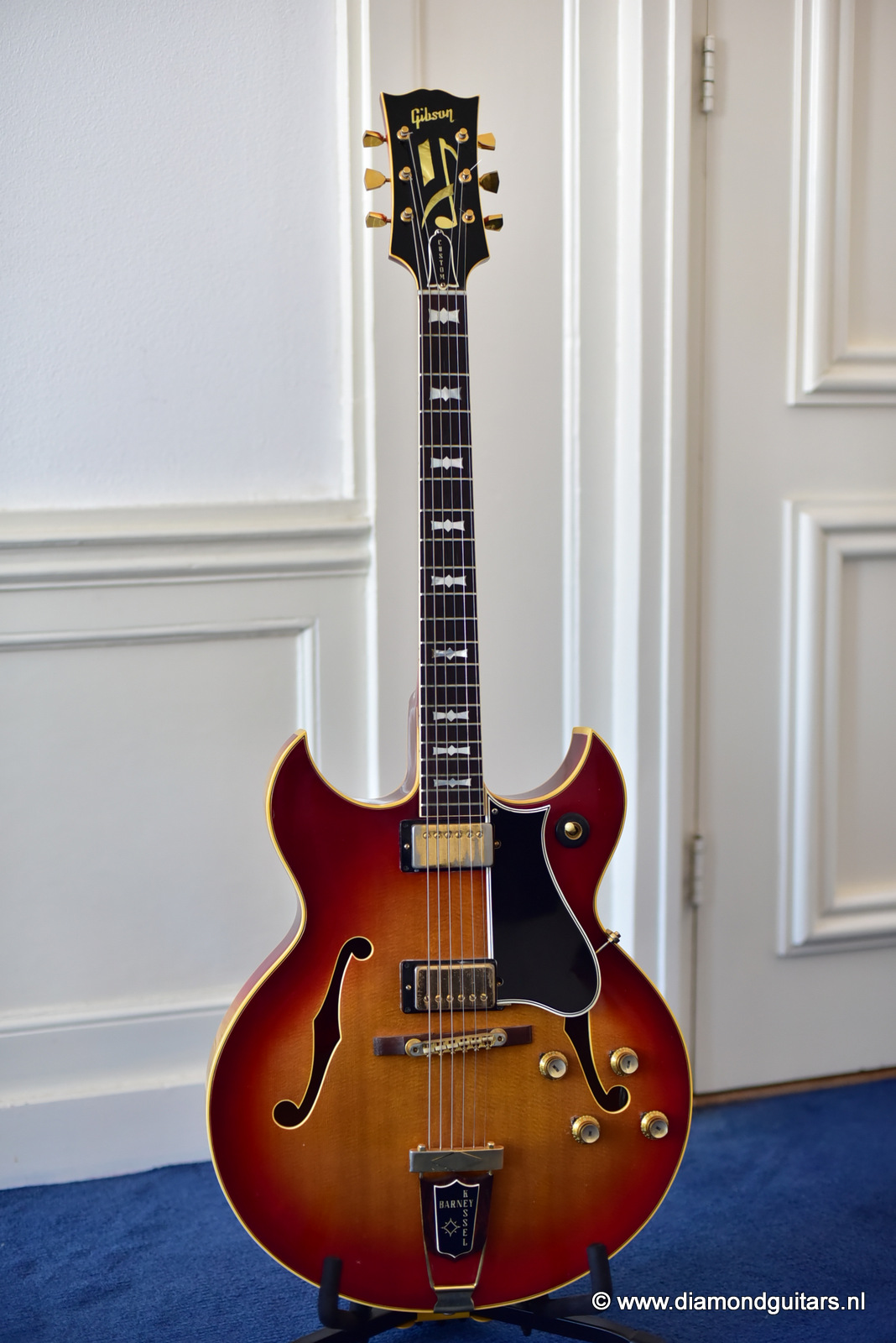 During the early Fifties Barney Kessel played on the gibson es-350. Gibson convinced Barney Kessel that they would match a deal he also had with Kay Guitars and build him a better guitar. In late 1960, Gibson introduced a prototype guitar with a double florentine cutaway shape, very similar features of the Gibson L-5. The Kessel version features a Cherry Sunburst colour, laminated Spruce top, back/sides and came with an oversized peghead with a stinger on the back. The Kessel comes in two versions. We have the Custom version for sale. The magnificent guitar features fancy bow tie inlays on the fingerboard similar to their banjos, gold plated parts, maple neck, bound f-holes, music note on peghead and a tune o matic bridge