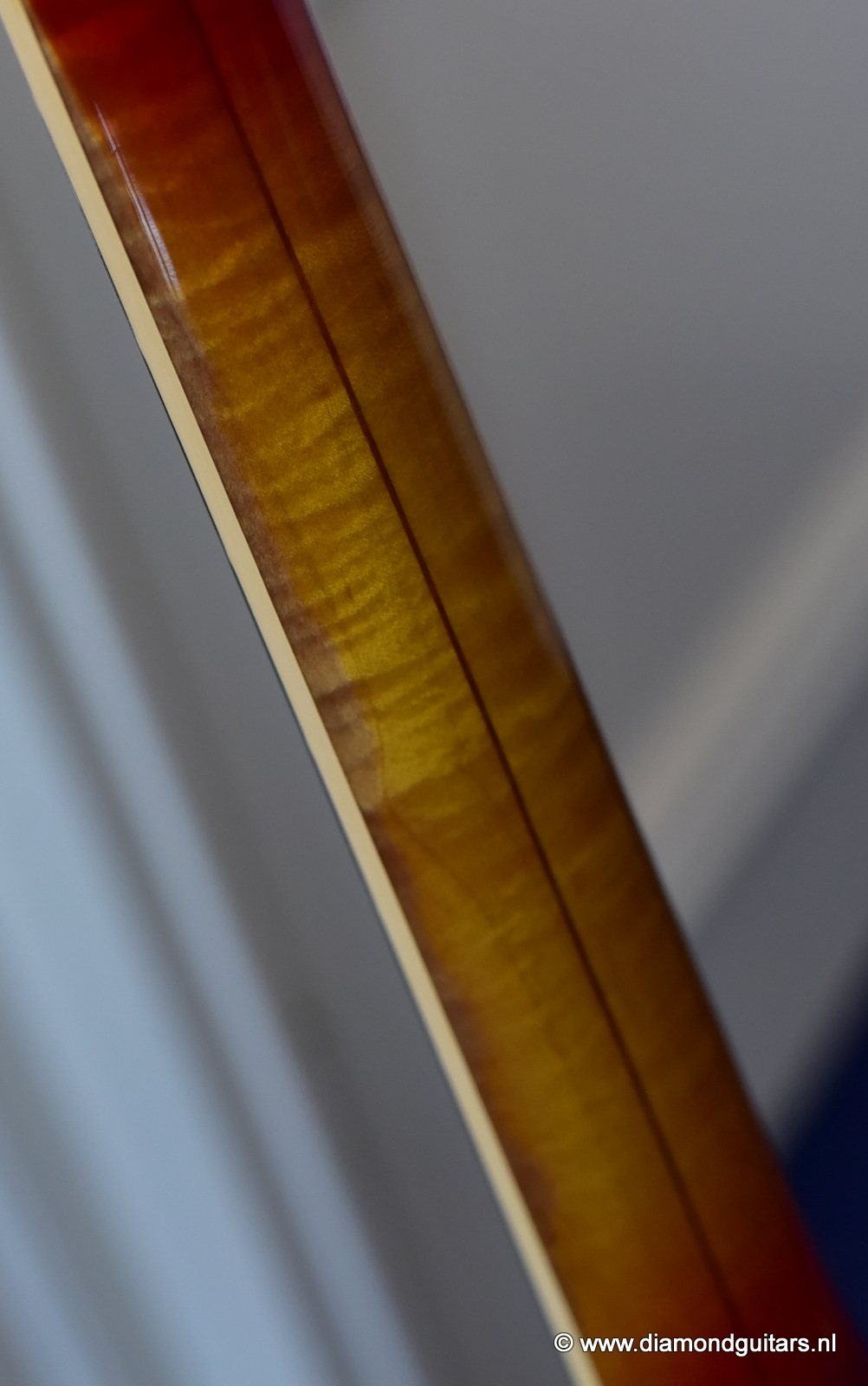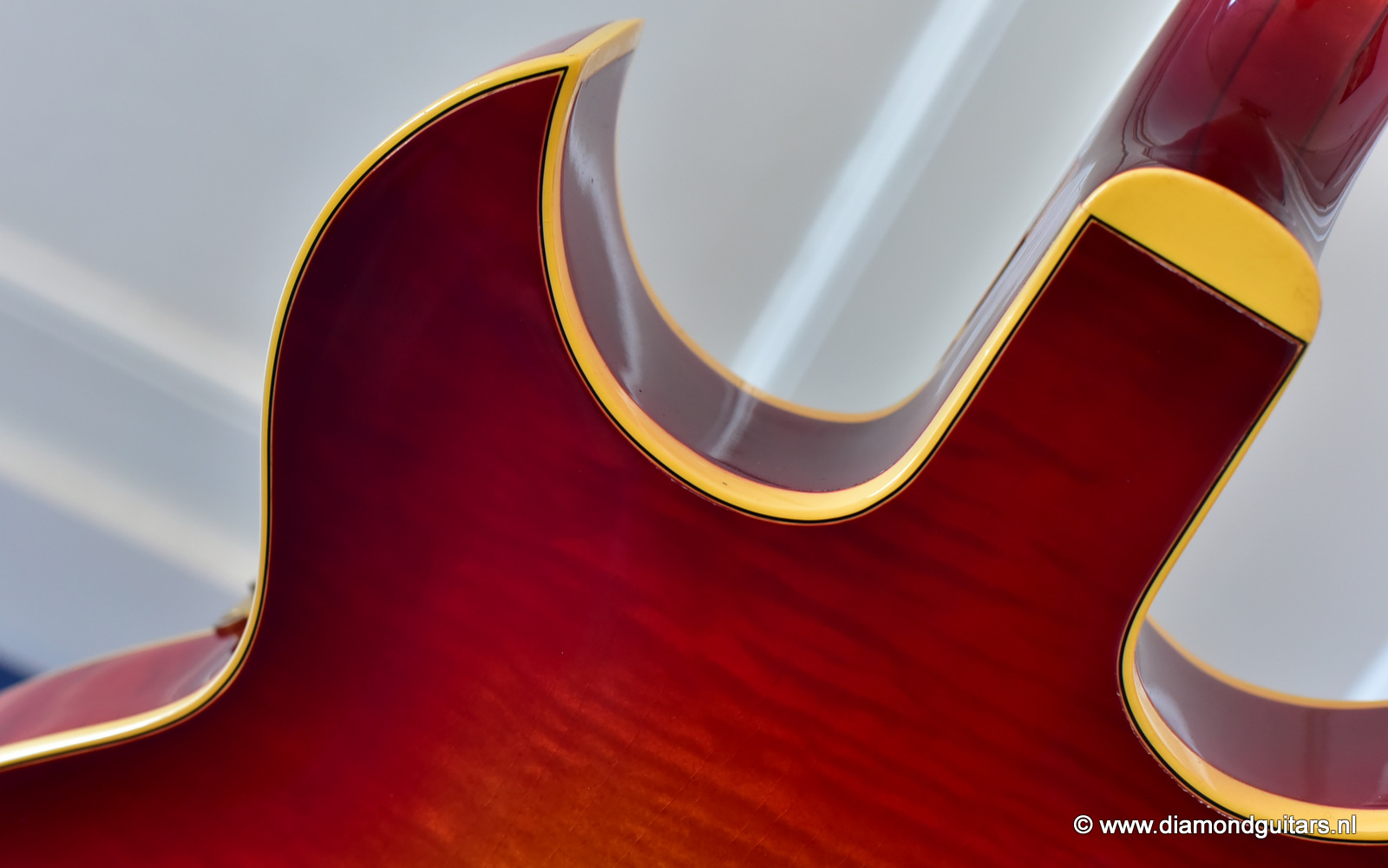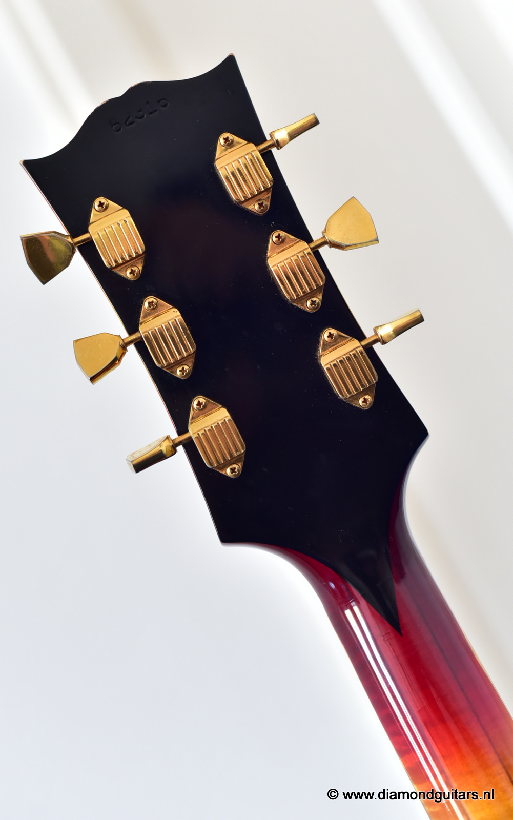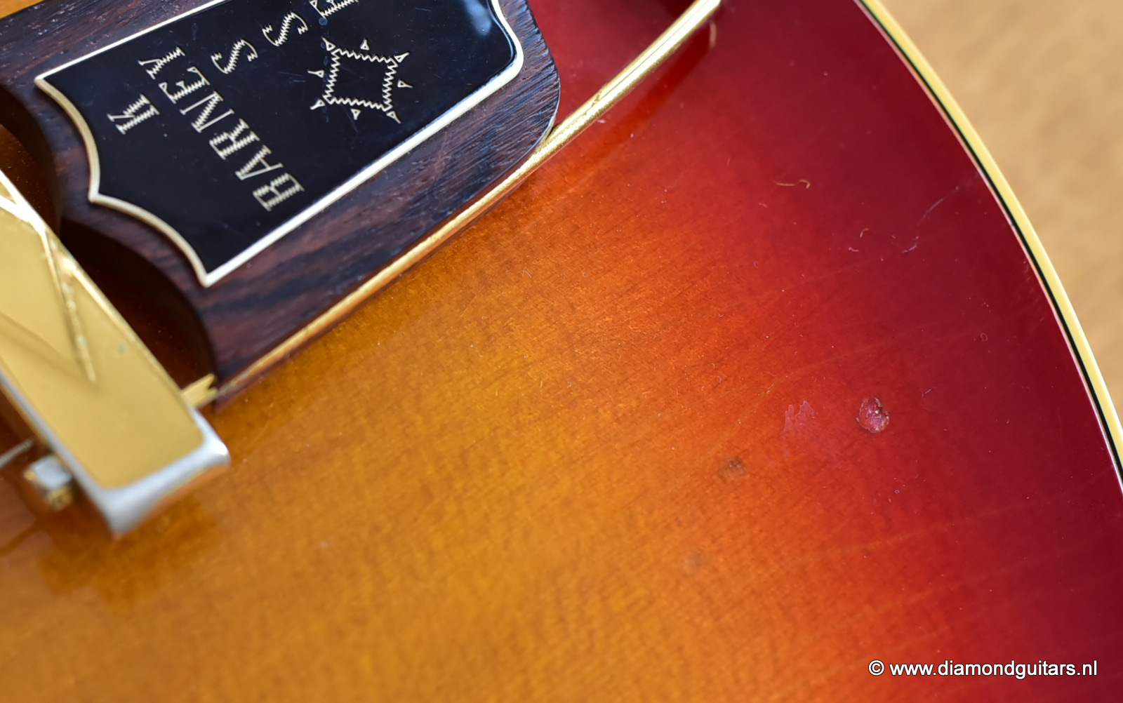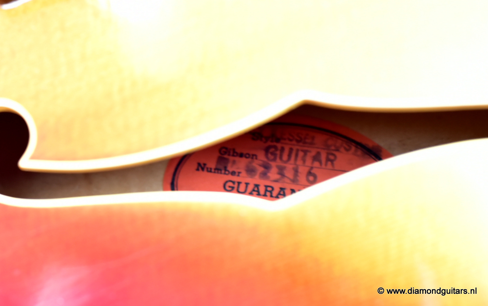 During the early Fifties Barney Kessel played on the gibson es-350. Gibson convinced Barney Kessel that they would match a deal he also had with Kay Guitars and build him a better guitar. In late 1960, Gibson introduced a prototype guitar with a double florentine cutaway shape, very similar features of the Gibson L-5. The Kessel version features a Cherry Sunburst colour, laminated Spruce top, back/sides and came with an oversized peghead with a stinger on the back. The Kessel comes in two versions. We have the Custom version for sale. The magnificent guitar features fancy bow tie inlays on the fingerboard similar to their banjos, gold plated parts, maple neck, bound f-holes, music note on peghead and a tune o matic bridge