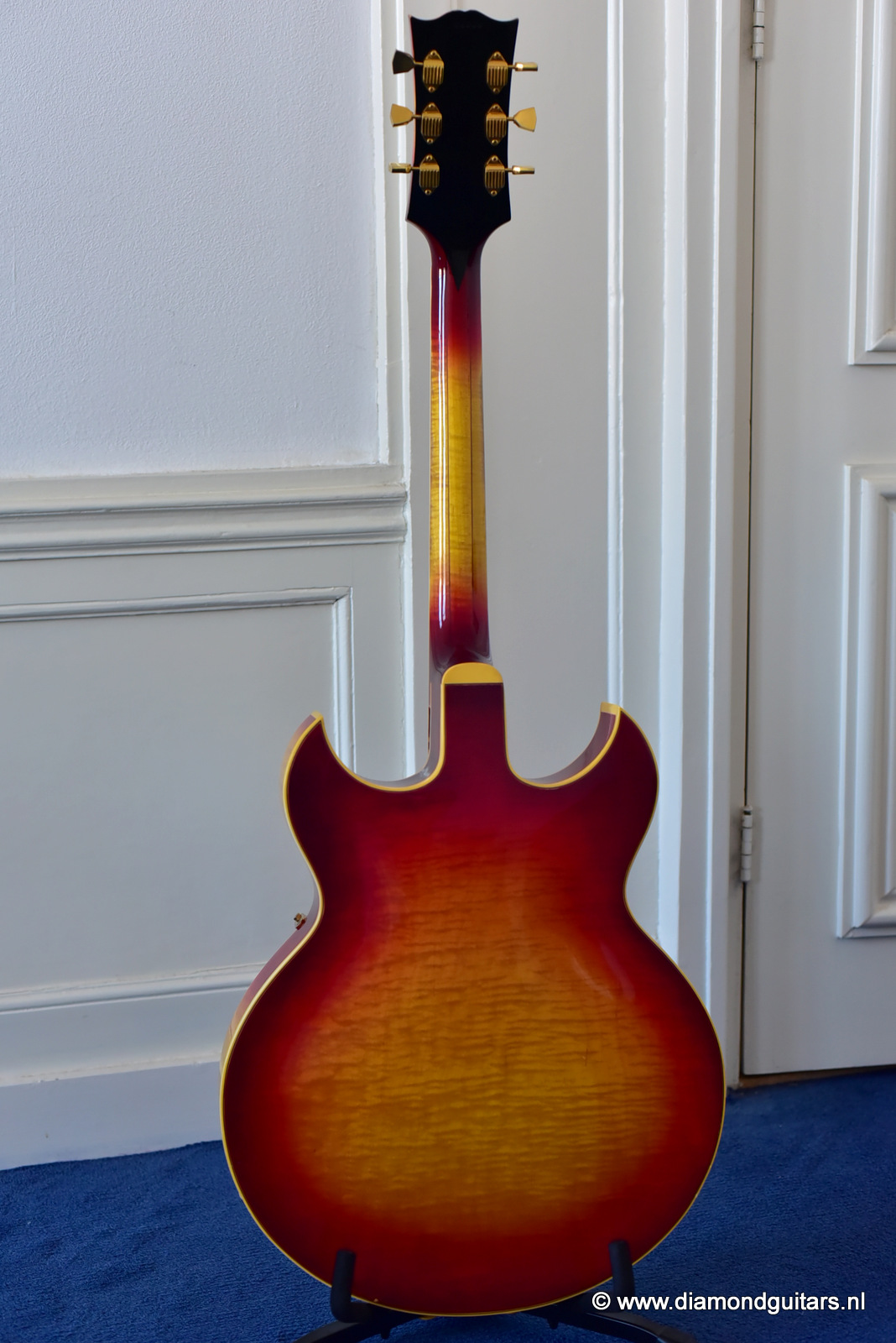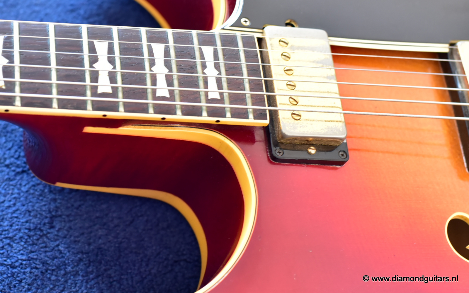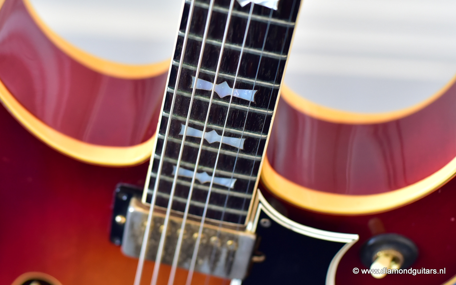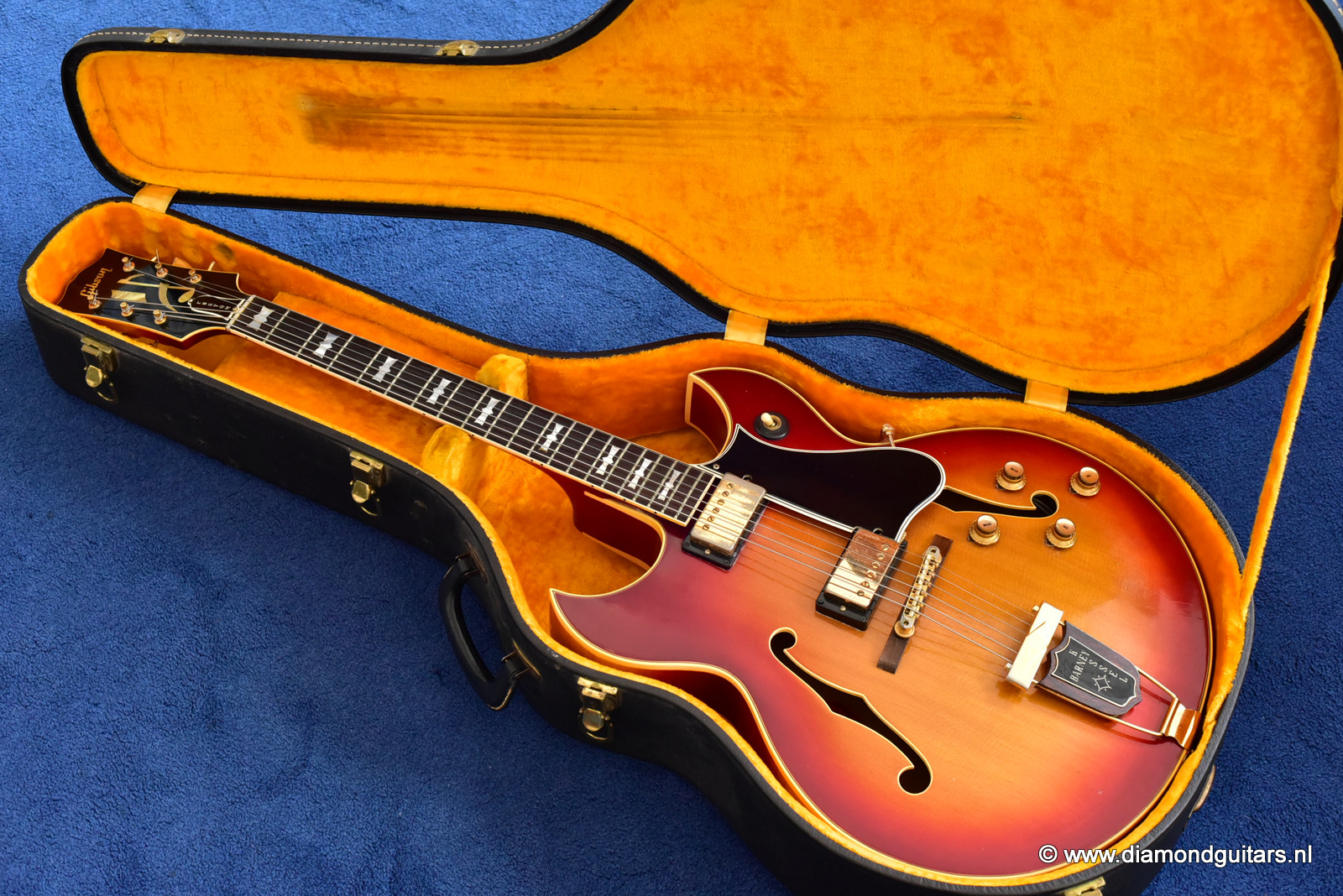 Former owners have treated her very good. The Cherry Sunburst finish is preserved well. She is in excelent condition for an 50 year old lady. This fretboard has been re-fretted and serviced by master luthier Peter De Smed (www.pdsguitars.nl). Excellent and very smooth playability and good for another 50 years of dedicated service. Electronics are good and the sound is…awesome! Only 740 of these guitars were built until 1973.