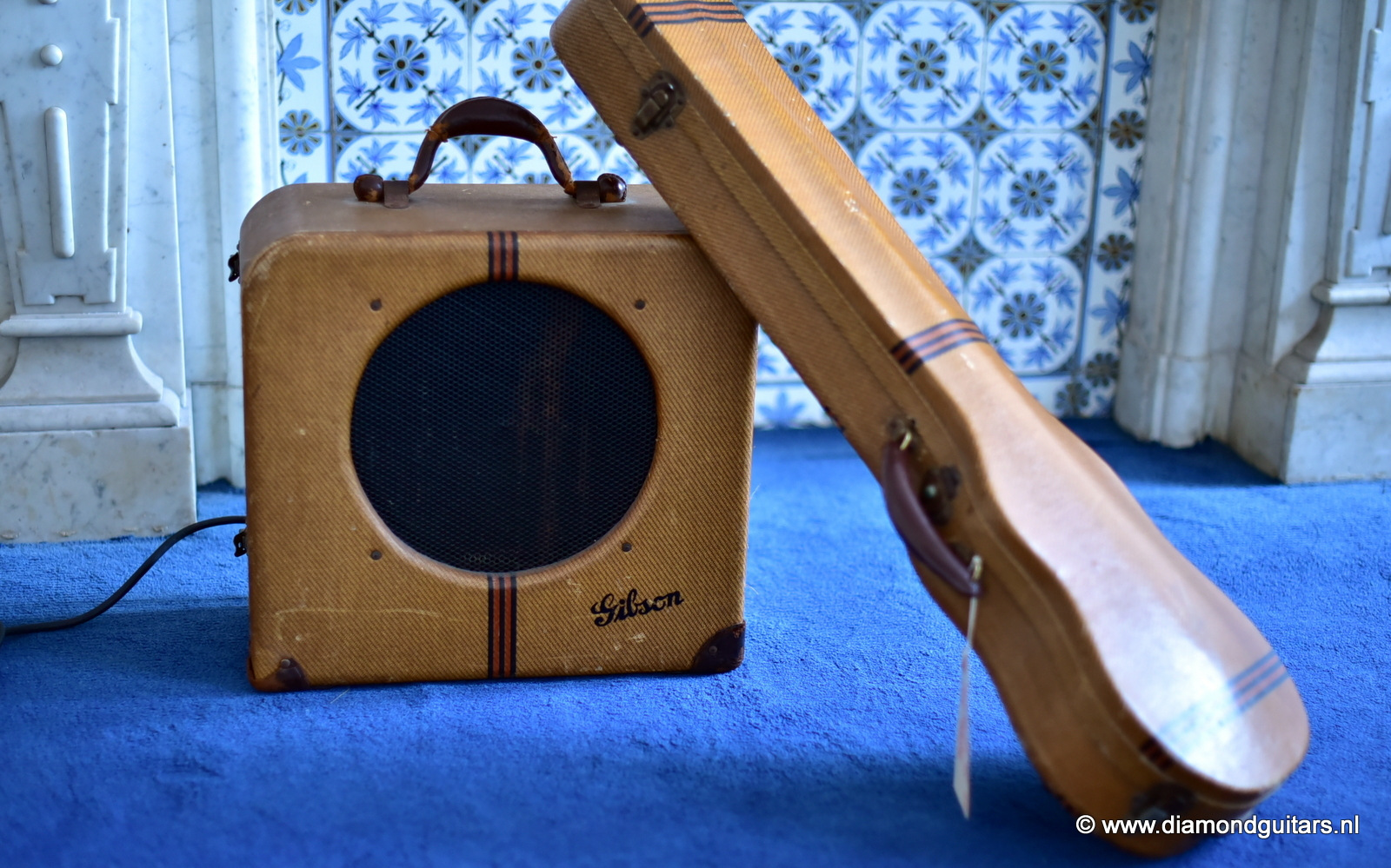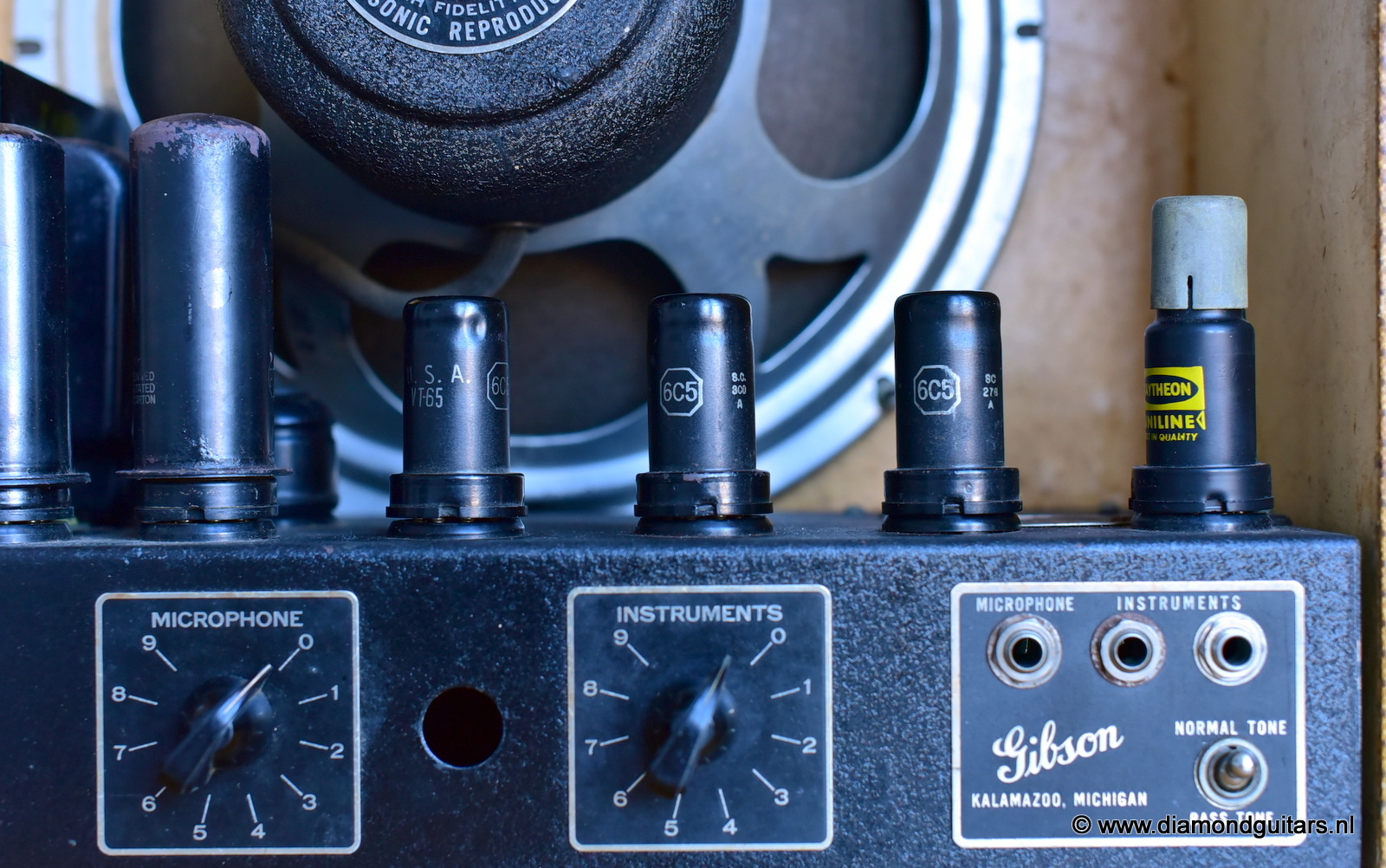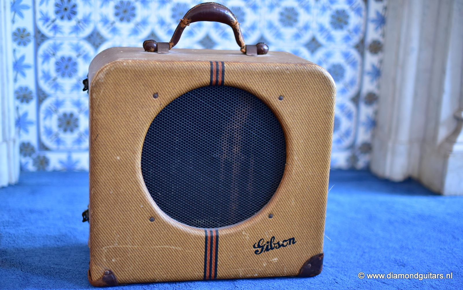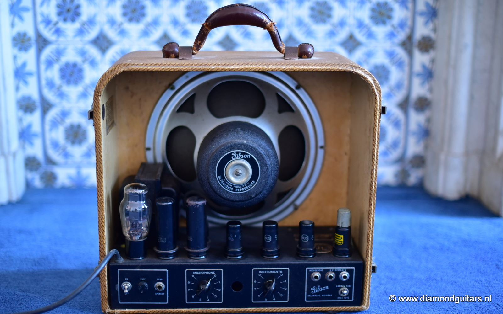 This well preserved example has two labels inside the cabinets – one for Geib, who made guitar and amp cases for Gibson, and a Western Electric licensing agreement granted to Electrical Research Products, Inc., who also made amps for Oahu, Harmony, etc.. This beauty runs on 110-120 Volts, so in many countries a power converter is required to run this beautifull sounding amp. The amp had proffesional maintenance an now lives with new tubes. Cool stuff. Any museum or guitar enthousiast would want a baby like this in the collection.