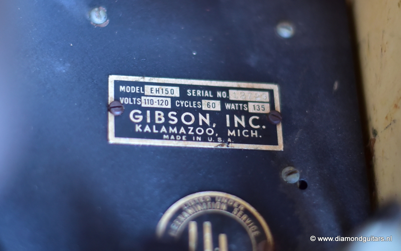 Speaker size in the 1940 Gibson EH-150 V3 increased to a 12″ field-coil with the Gibson name on the magnet cover. A beefed up circuit employing seven tubes featured the relatively new 6L6 beam-power variety, in metal. The 5Z3 rectifier, 6C5 driver and 6F5 microphone channel preamp remained from the earlier model, but the twin triode 6N7 was replaced with two 6C5 triodes for the instrument and microphone channels. Power ratings were given for the first time, a respectable 15 watts.