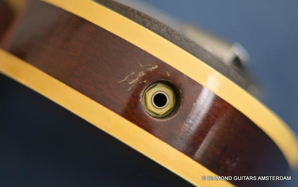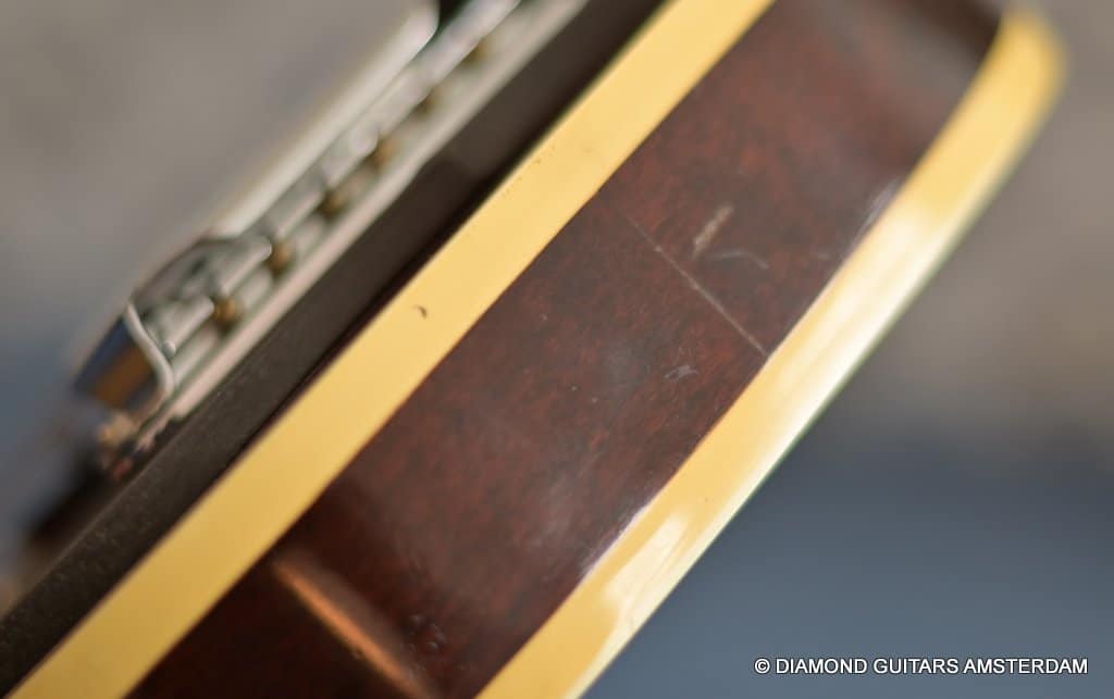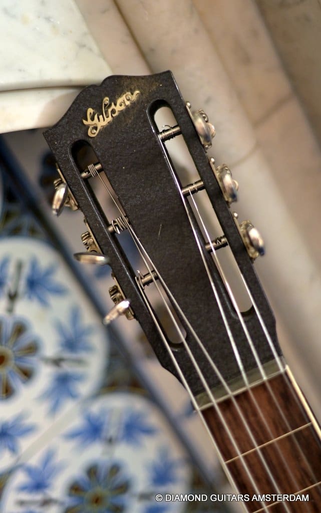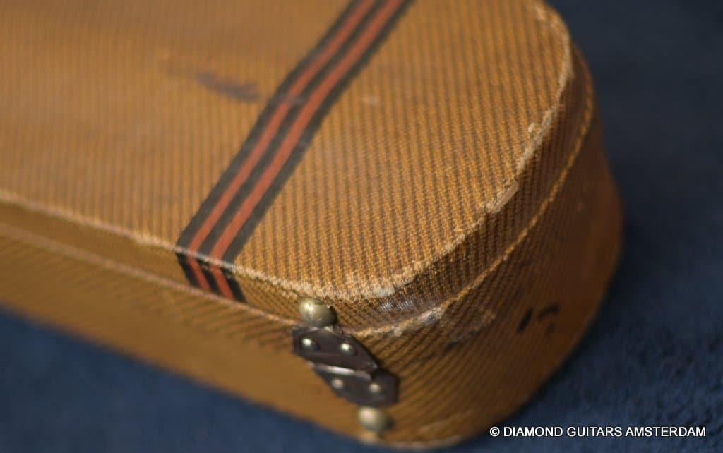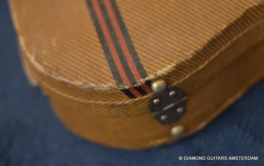 This sweet Gibson EH-185 2nd version Lap Steel Guitar or ‘Hawaiian’ guitar the first electric stringed instrument and hit the market just a few years before Les Paul and Charlie Christian modified their instruments. Gibson stated that this Lap Steel ‘had the quality and tone that players have dreamed about, but have never been able to find in an electric guitar before’, while highlighting ‘its great sustaining power’. The Gibson logo is cut-out of metal and mounted onto a solid cast piece. Original Kluson tuners are mounted on the side. For those of you that encounter EH-185 tuners, they are specific to vertical mounts…thus, they will not fit onto regular EH-150’s. More info on Gibson Lap Steels HERE