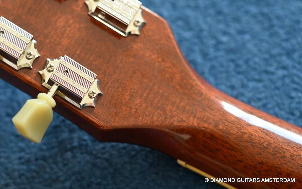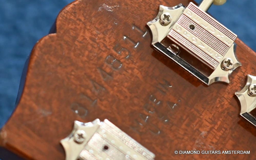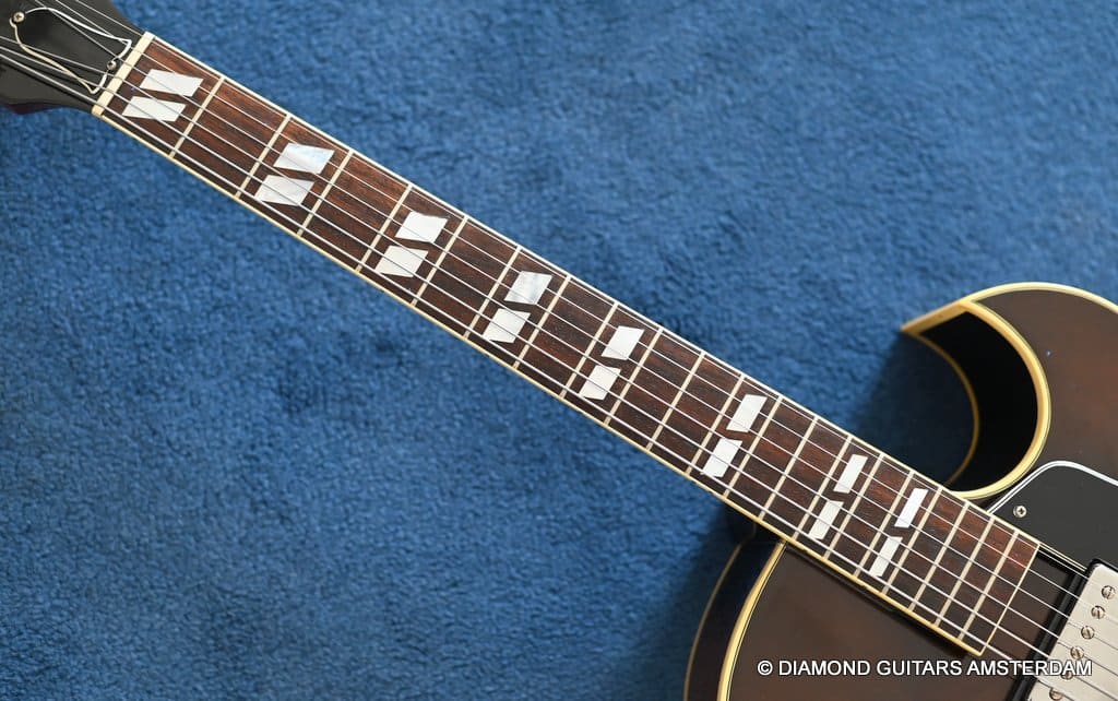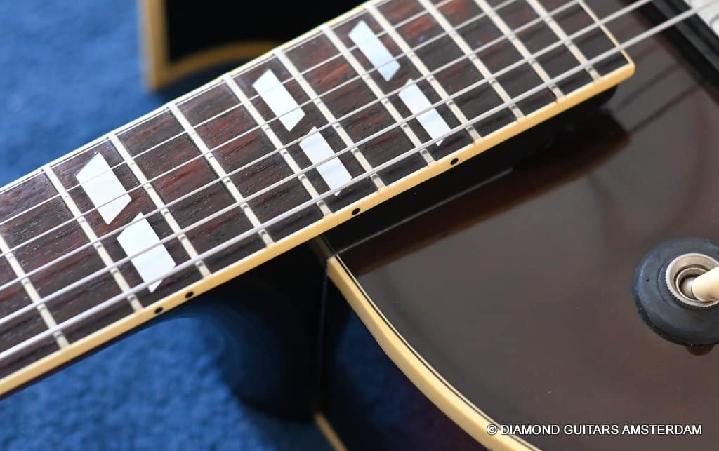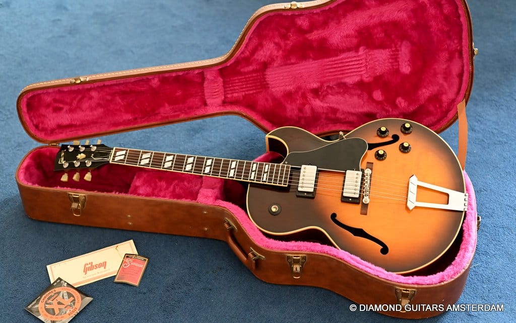 This well-kept 1988 Gibson ES-175D was a two-owner guitar and very well treated during her life. She sparkles in tone and looks. What a beauty. And what a tone. This is a stunning example from the post-Norlin era where Henry Juskiewicz led the company into a new future by focusing on quality of tonewood and build techniques. This ES is built with laminated Honduran Mahogany back & sides and a Big Leaf Maple top. For the fingerboard Madagascar Rosewood was used. Also, the one-piece Honduran Mahogany neck was re-reintroduced in that period. The low output PAF-style Tim Shaw sound bright, sweet, and full of character. They deliver those o so familiar warm, round tones from the neck pickup and a clear, articulate, and punchy tone from the bridge pickup. She is in excellent condition. We had our luthier do a fret job and upgraded the tuners with a nice set of high-quality Kluson-style Grover Vintage Deluxe. This is a very nice example featuring that deep dark Sunburst finish in a very clean shape with minimal signs of use for its age.