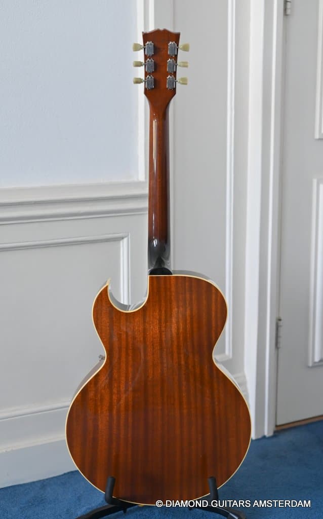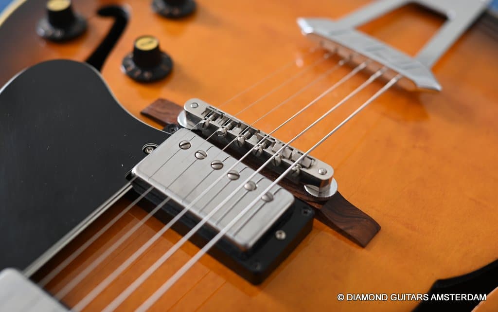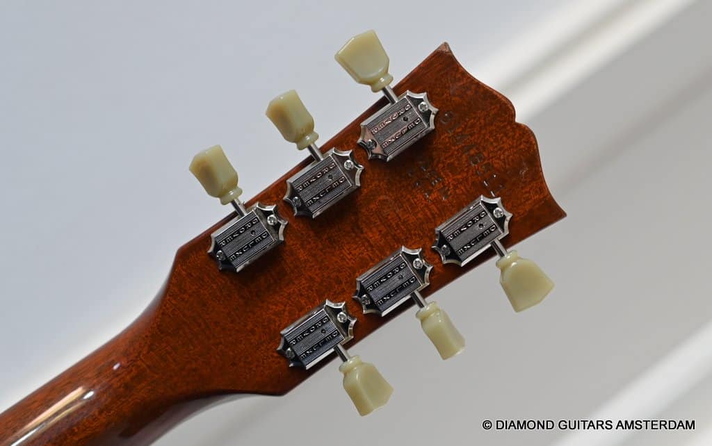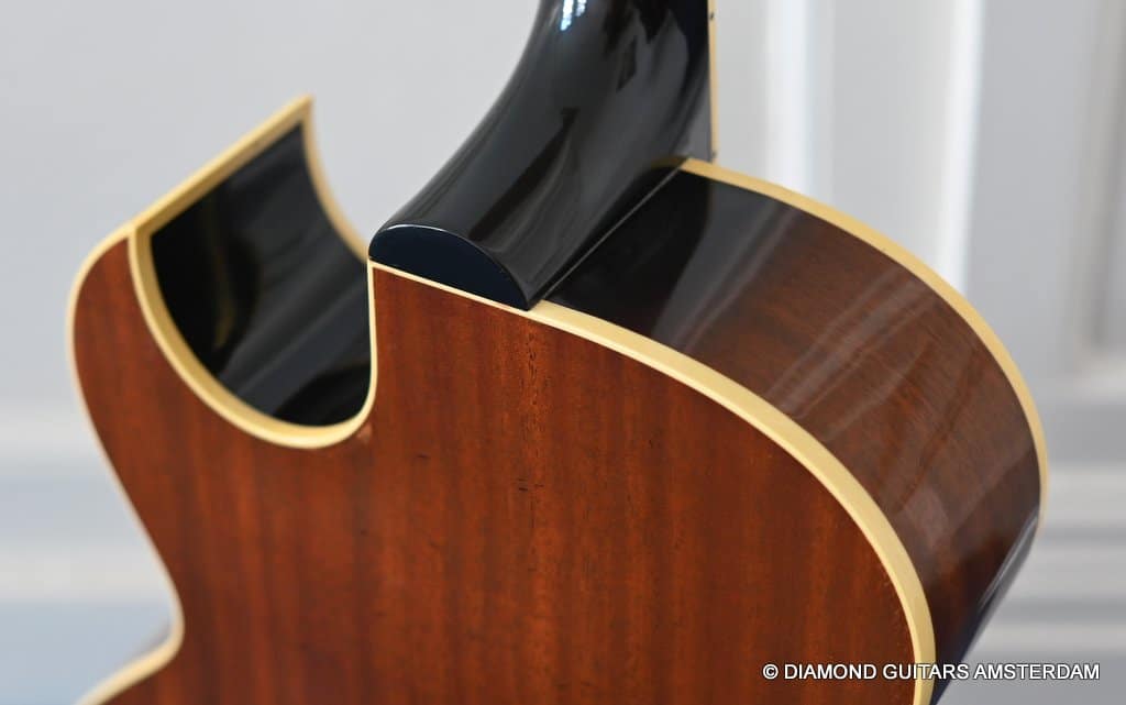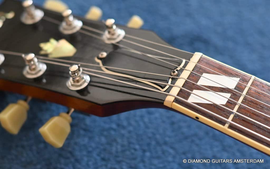This well-kept 1988 Gibson ES-175D was a two-owner guitar and very well treated during her life. She sparkles in tone and looks. What a beauty. And what a tone. This is a stunning example from the post-Norlin era where Henry Juskiewicz led the company into a new future by focusing on quality of tonewood and build techniques. This ES is built with laminated Honduran Mahogany back & sides and a Big Leaf Maple top. For the fingerboard Madagascar Rosewood was used. Also, the one-piece Honduran Mahogany neck was re-reintroduced in that period. The low output PAF-style Tim Shaw sound bright, sweet, and full of character. They deliver those o so familiar warm, round tones from the neck pickup and a clear, articulate, and punchy tone from the bridge pickup. She is in excellent condition. We had our luthier do a fret job and upgraded the tuners with a nice set of high-quality Kluson-style Grover Vintage Deluxe. This is a very nice example featuring that deep dark Sunburst finish in a very clean shape with minimal signs of use for its age.
