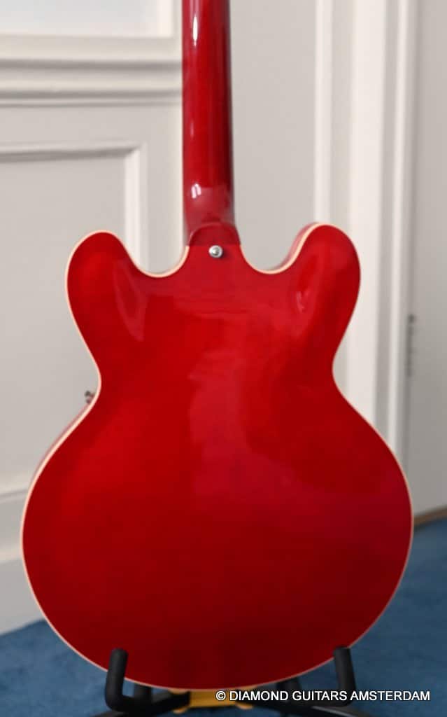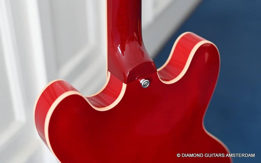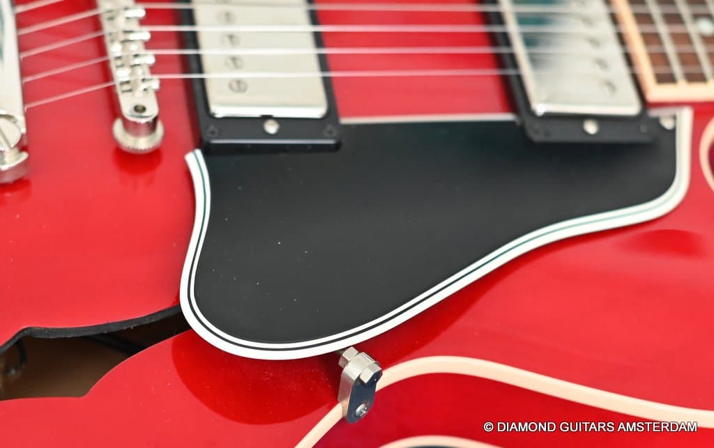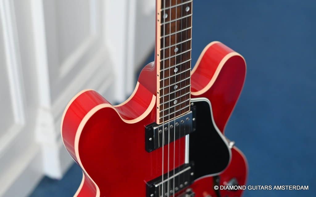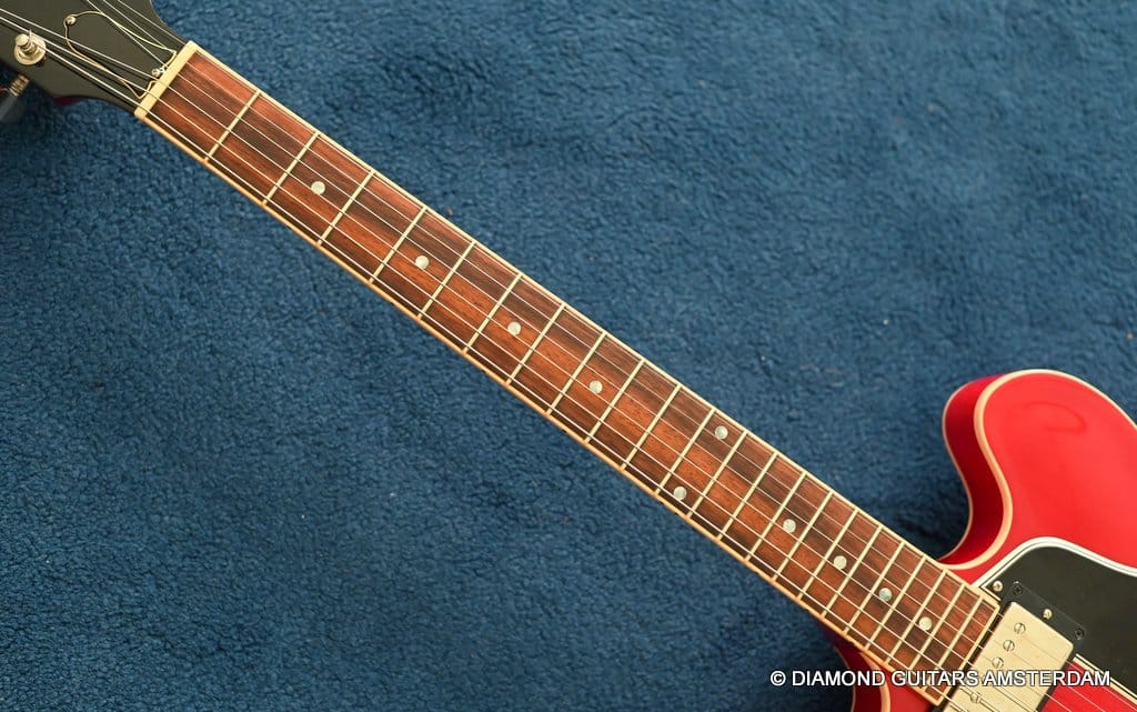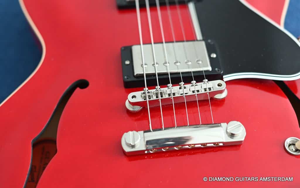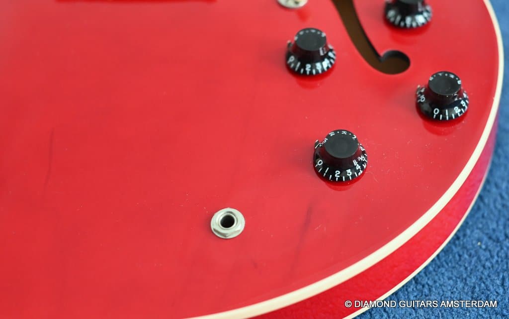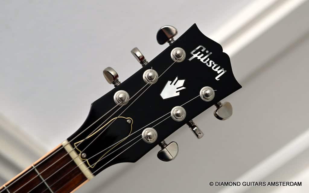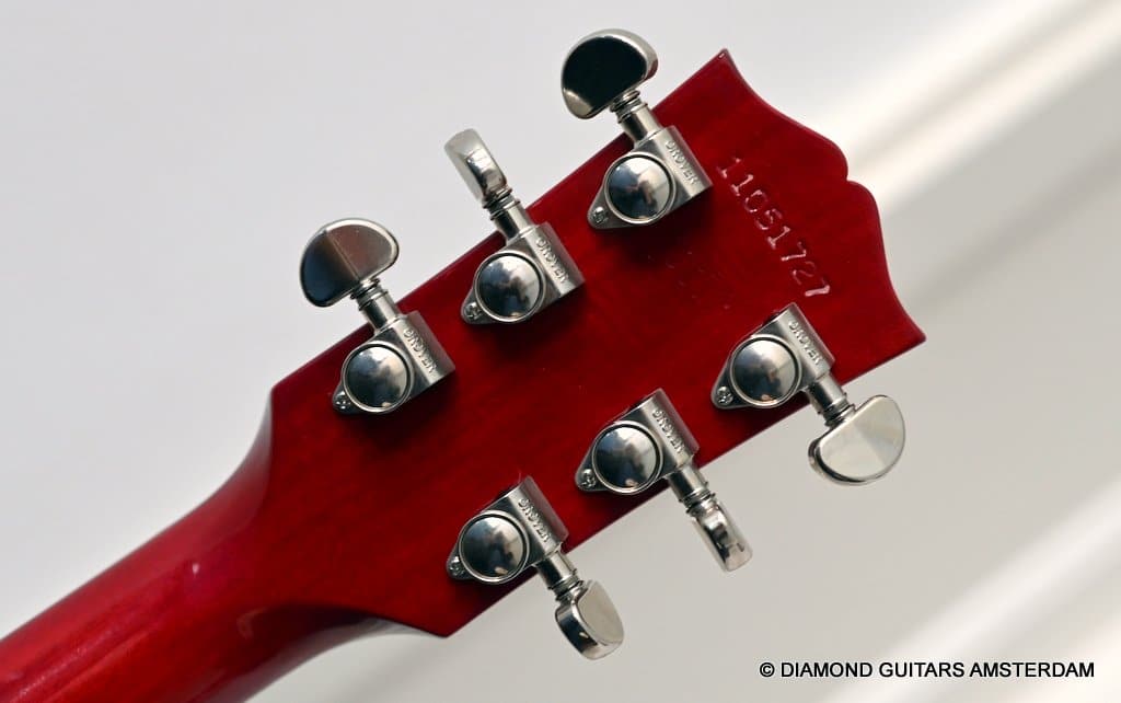 ABR-1 bridge with aluminum stop tailpiece. Mother-of-pearl inlays and Gibson Deluxe tulip tuners with green key top off the 60’s Slim Tape neck profile. (Note: neck feels a little beefier in the shoulders than the other 60s Slim Tapers I’ve experienced – a good thing, in my opinion.) The guitar is in excellent condition. Flaws include a small scuff on the upper horn (see pic) and some buckle rash too minor to show up in the pictures. The frets are near perfect and were just hand polished.