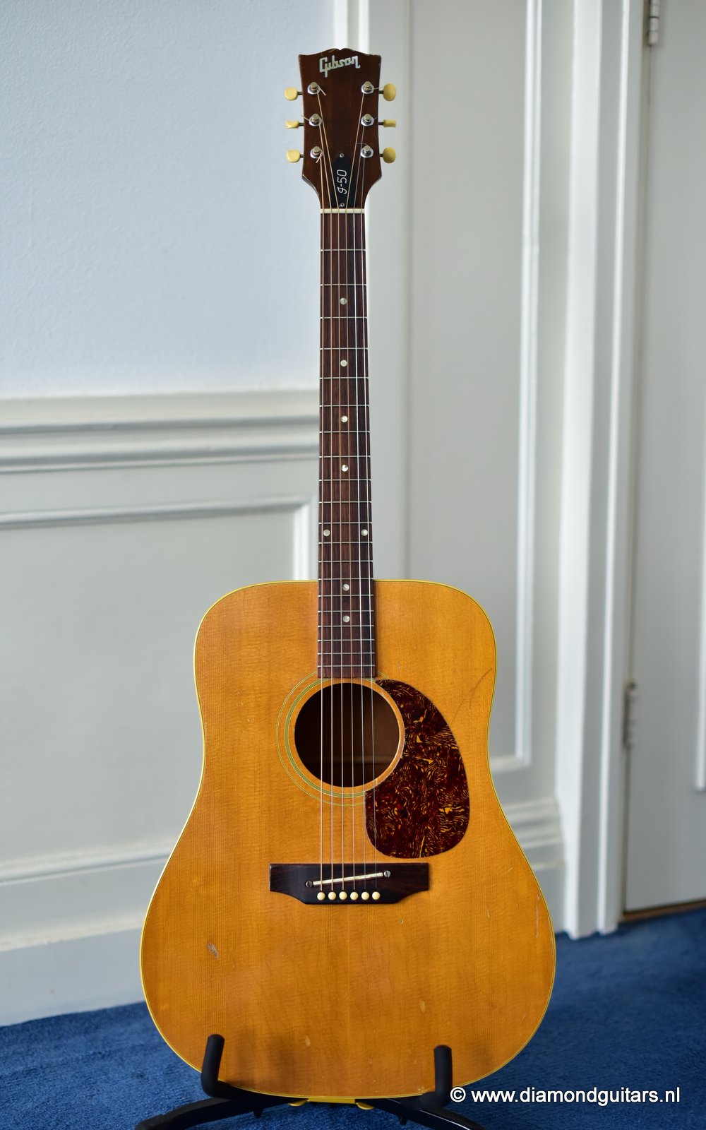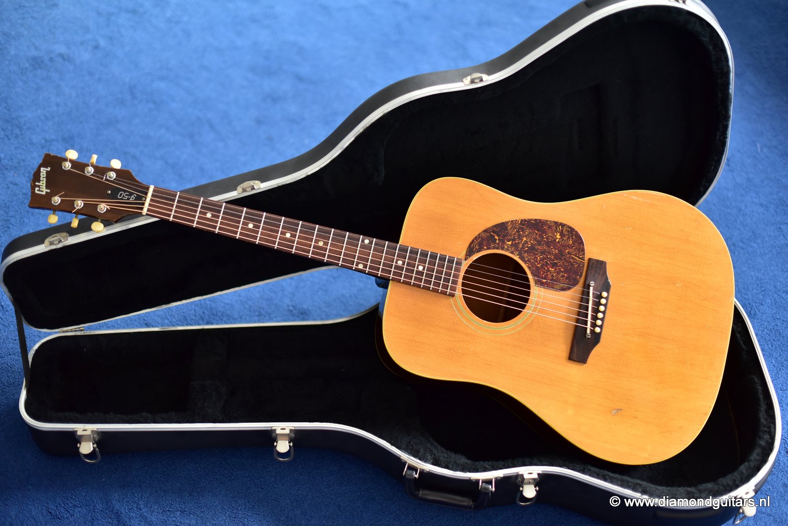 Late 1968 Gibson changed the J-45/J-50 body shape from slope shouldered to square shouldered. Shortly after this change – December 1969 – Norlin acquired Gibson. Things would change, mostly not for the better. This beauty is one of last pre-Norlin J-50 guitars with the original Faux Tortoise pickguard and without the infamous volute, built in Gibson’s famous Kalamazoo factory. The J-50 is the classic example of the ‘workhorse’ guitar and one of Gibson’s most iconic models. This square shouldered dreadnought has the sweet honey coloured Spruce top and Honduras Mahogany back, sides and neck. She oozes character!