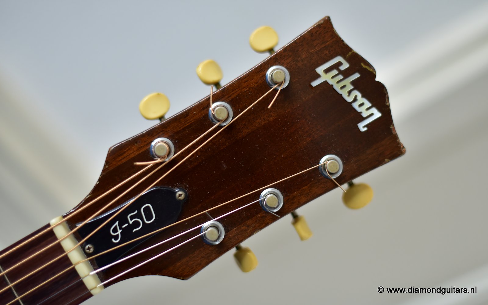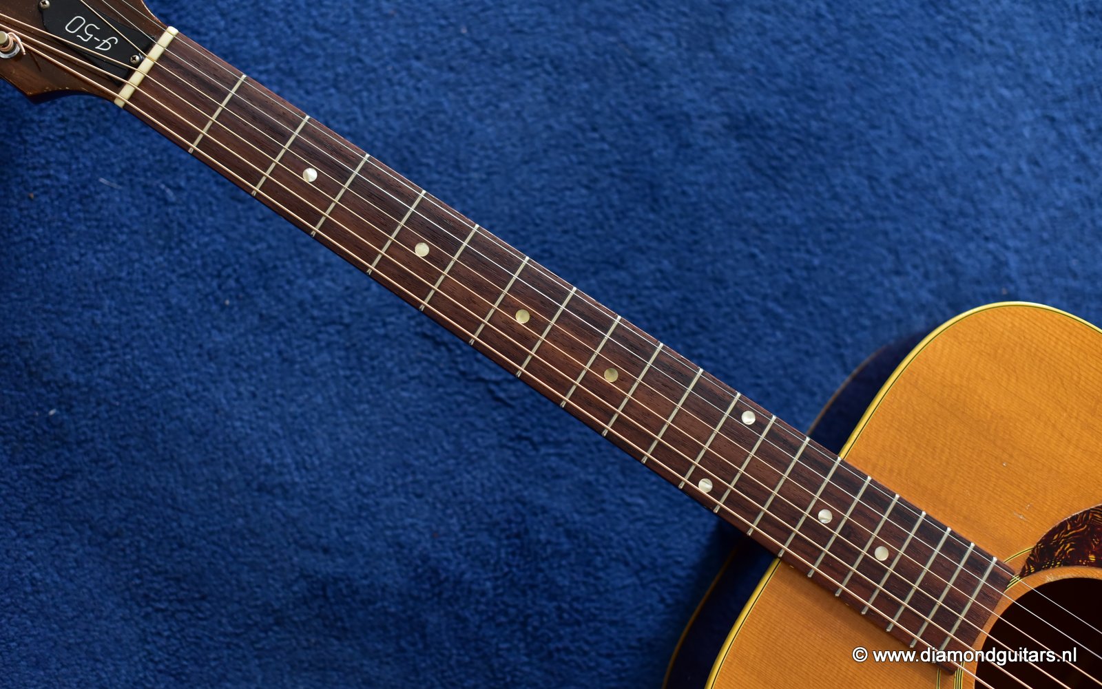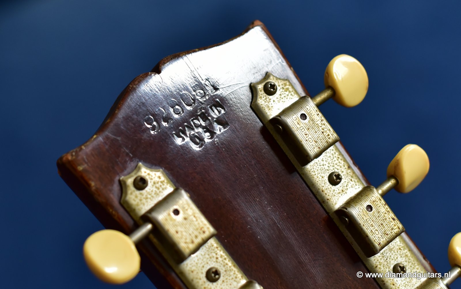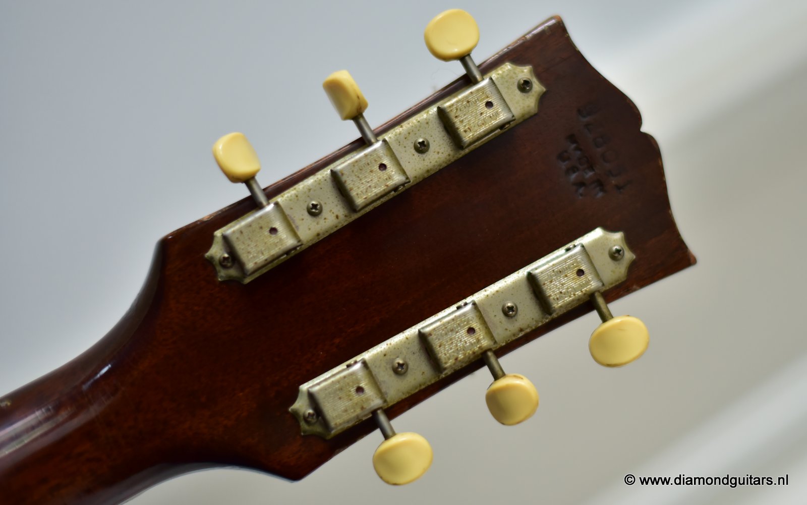 Her condition is very good considering her age. Various nicks, chips, dents & dings and surface scratches. Lots of weather checking & some finish wear. This one has seen stages and is used to makin’ music! The Kluson tuners and their buttons are a still very good. Overall the guitar has an ultra-cool, true vintage look to it with a nice patina. A full re-fret and bridge modification brought the playability and intonation to a professional level. The bridge was improved by luthier Hans Moust for better tone without losing the action adjustment option. Thus the original Rosewood insert was milled to hold a compensated bone nut. Brilliant solution. The result is a loud, great sounding and excellent playing instrument with that great sixties vintage Mahogany tone. Luthier Hans Moust knows how to make vintage guitar fun to play again. The neck is the well know, nicely rounded, wide profile Mahogany Gibson standard with cream side-dots and combined with a dark Madagascar Rosewood fingerboard with Pearl dot inlays. Frets are like new of course and show only very minimal wear. The truss rod and the adjustable bridge work properly. Check the sound sample by clicking the Soundcloud button below.
