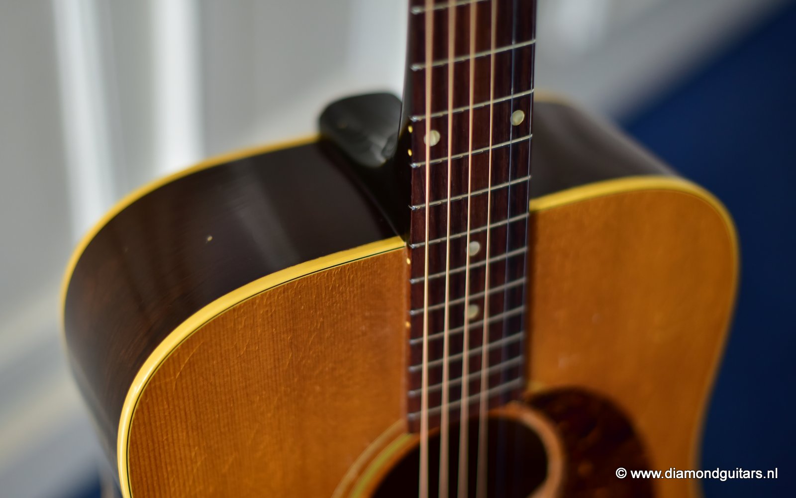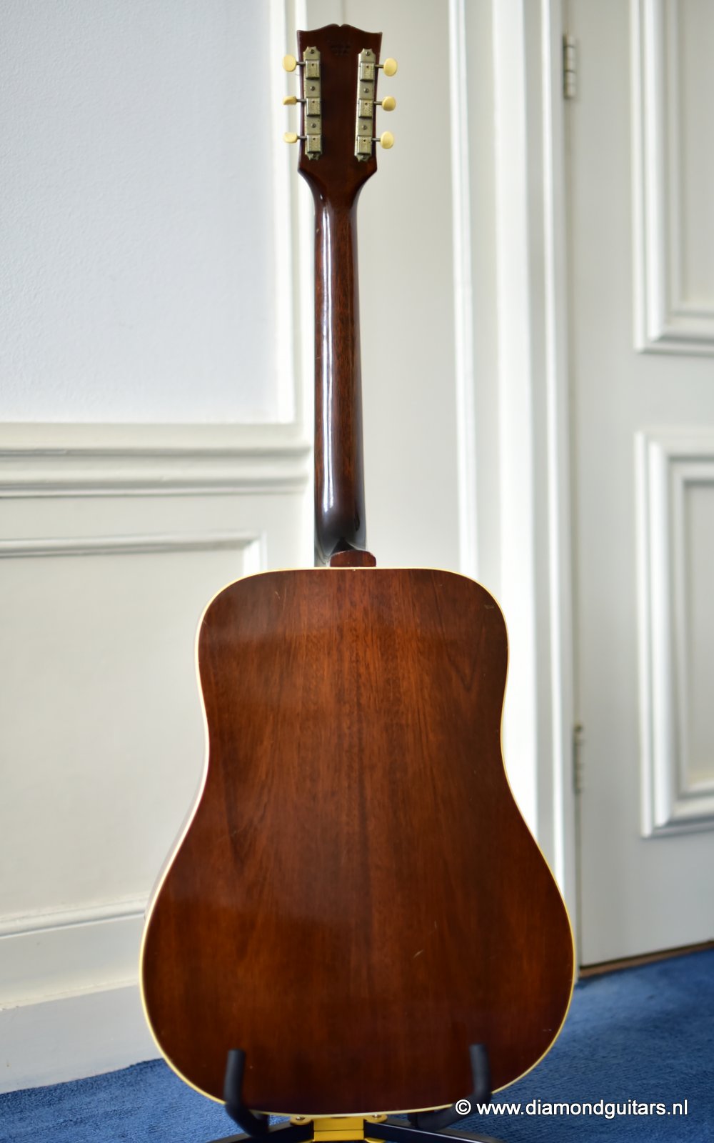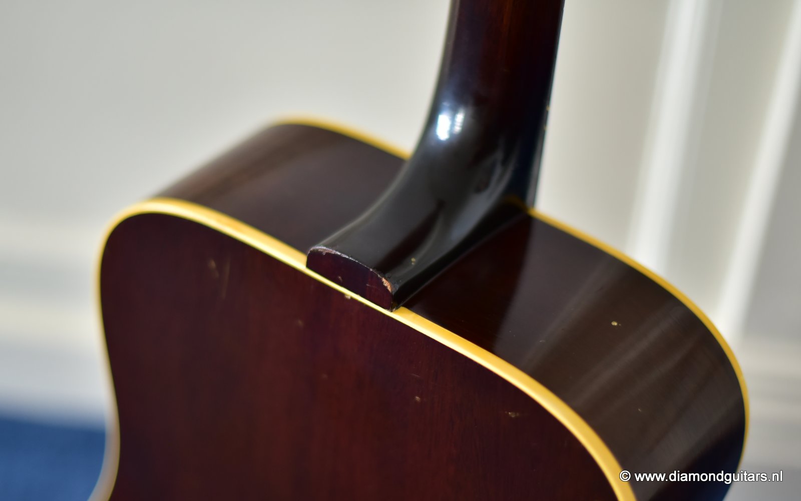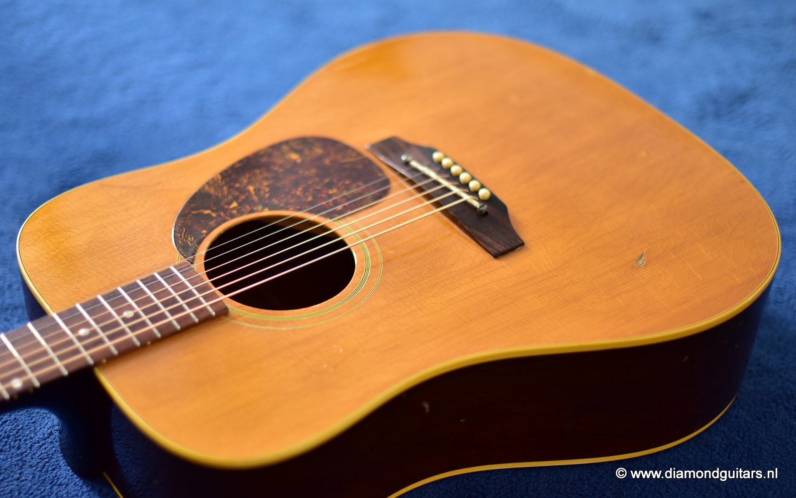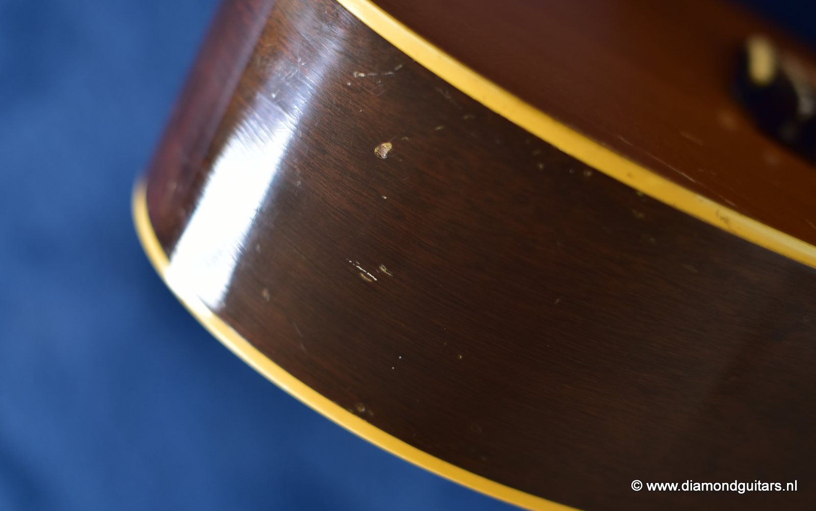 Her condition is very good considering her age. Various nicks, chips, dents & dings and surface scratches. Lots of weather checking & some finish wear. This one has seen stages and is used to makin’ music! The Kluson tuners and their buttons are a still very good. Overall the guitar has an ultra-cool, true vintage look to it with a nice patina. A full re-fret and bridge modification brought the playability and intonation to a professional level. The bridge was improved by luthier Hans Moust for better tone without losing the action adjustment option. Thus the original Rosewood insert was milled to hold a compensated bone nut. Brilliant solution. The result is a loud, great sounding and excellent playing instrument with that great sixties vintage Mahogany tone. Luthier Hans Moust knows how to make vintage guitar fun to play again. The neck is the well know, nicely rounded, wide profile Mahogany Gibson standard with cream side-dots and combined with a dark Madagascar Rosewood fingerboard with Pearl dot inlays. Frets are like new of course and show only very minimal wear. The truss rod and the adjustable bridge work properly. Check the sound sample by clicking the Soundcloud button below.