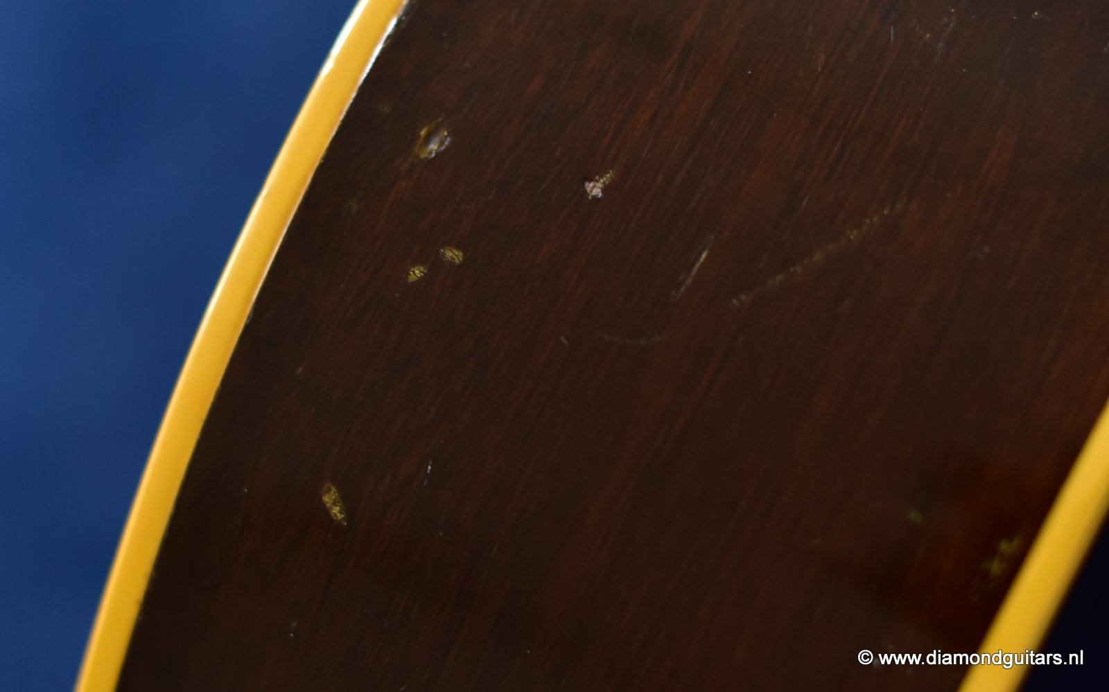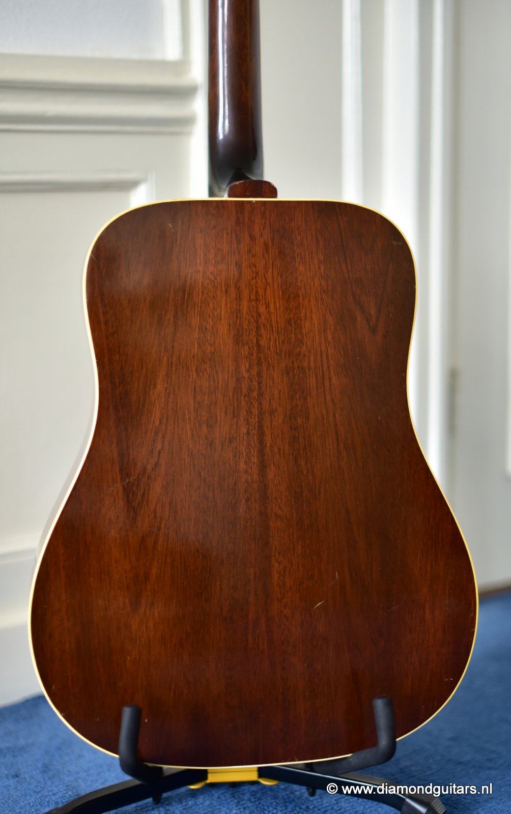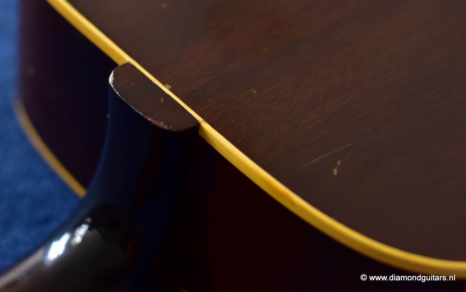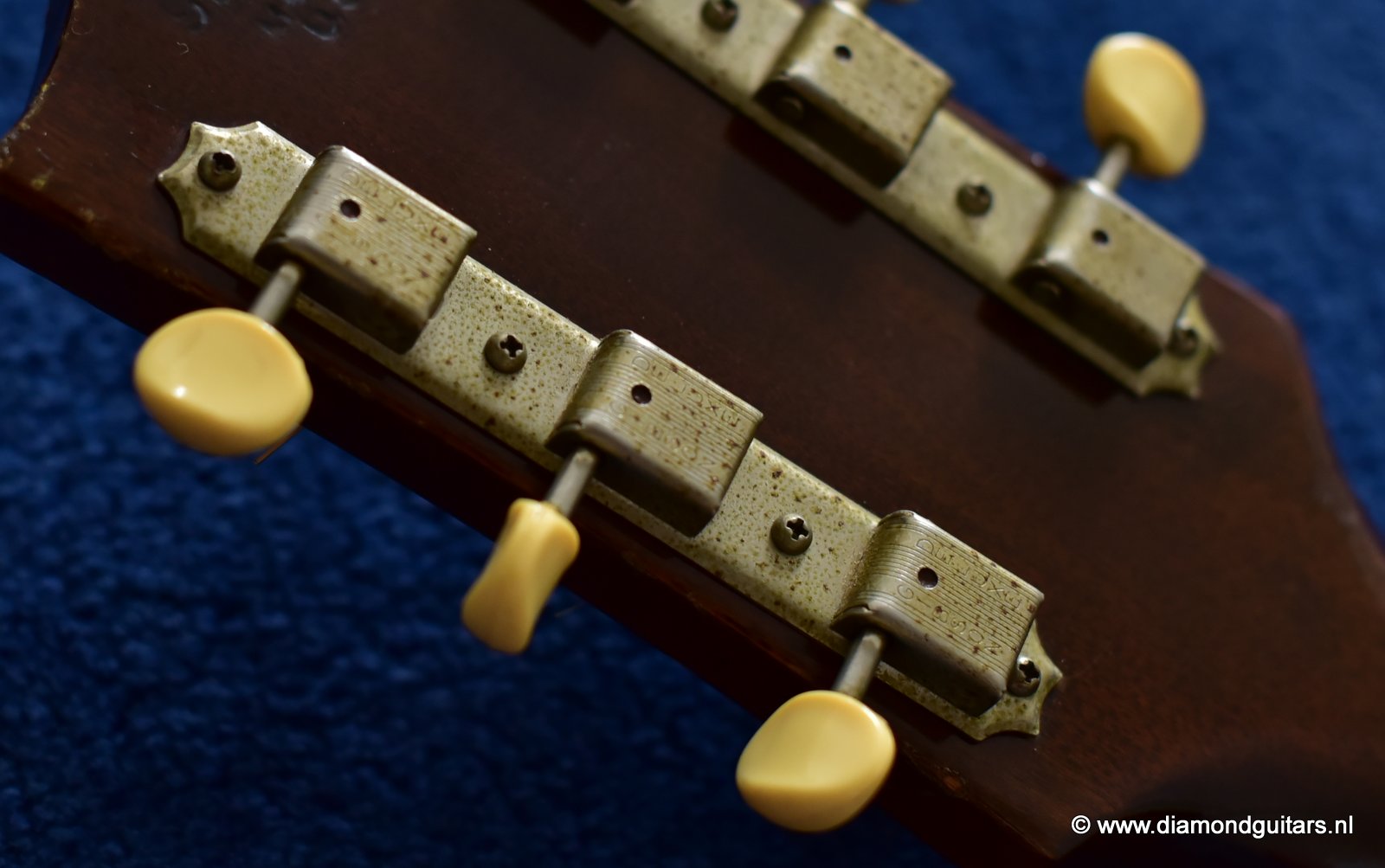 Her condition is very good considering her age. Various nicks, chips, dents & dings and surface scratches. Lots of weather checking & some finish wear. This one has seen stages and is used to makin’ music! The Kluson tuners and their buttons are a still very good. Overall the guitar has an ultra-cool, true vintage look to it with a nice patina. A full re-fret and bridge modification brought the playability and intonation to a professional level. The bridge was improved by luthier Hans Moust for better tone without losing the action adjustment option. Thus the original Rosewood insert was milled to hold a compensated bone nut. Brilliant solution. The result is a loud, great sounding and excellent playing instrument with that great sixties vintage Mahogany tone. Luthier Hans Moust knows how to make vintage guitar fun to play again. The neck is the well know, nicely rounded, wide profile Mahogany Gibson standard with cream side-dots and combined with a dark Madagascar Rosewood fingerboard with Pearl dot inlays. Frets are like new of course and show only very minimal wear. The truss rod and the adjustable bridge work properly. Check the sound sample by clicking the Soundcloud button below.