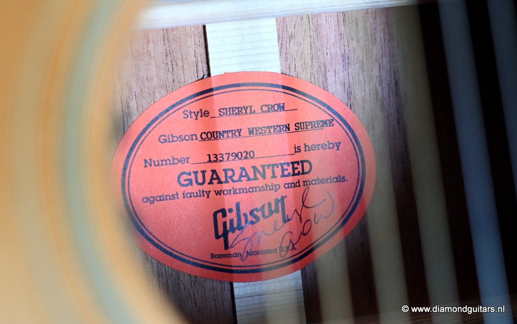 Gibson Sheryl Crow Country Western Supreme is outfitted with the astounding Amulet M analog pickup for accurate tone and response of the instrument when amplified. Finished in a gorgeous Antique Cherry, the Sheryl Crow Country Western Supreme is a natural beauty! Lightweight too: 1.95 kg. And like she says: it’s a Beut! This fine instrument was played but is still near mint with almost no playwear on the lower frets. No issues whatsoever! She will bring you years of inspiration and beauty the eye and ears. Listen to the sound impression on Soundcloud and watch Sheryl talk about this her signature model on YouTube. Consignment sale. No trades.