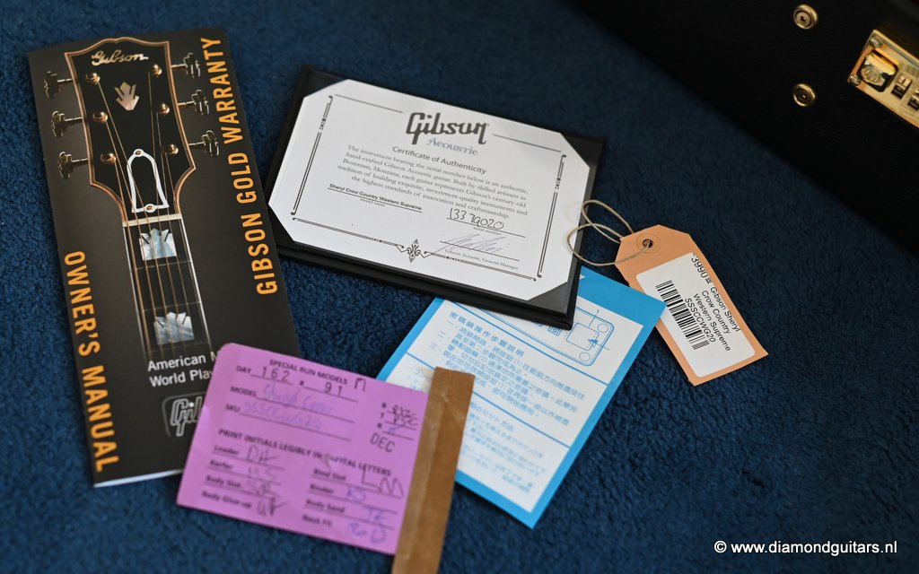 Gibson Sheryl Crow Country Western Supreme! The most highly customized Country Western in Gibson’s history. Created for Sheryl Crow and based off her own Country Western, the features of this signature model are designed to deliver the sweet voice of our classic Country Western with the added punch created from our 1930’s Advanced bracing pattern. The Thermally Aged Sitka spruce top and hide glue provide additional projection and increased expression with a wider dynamic range.