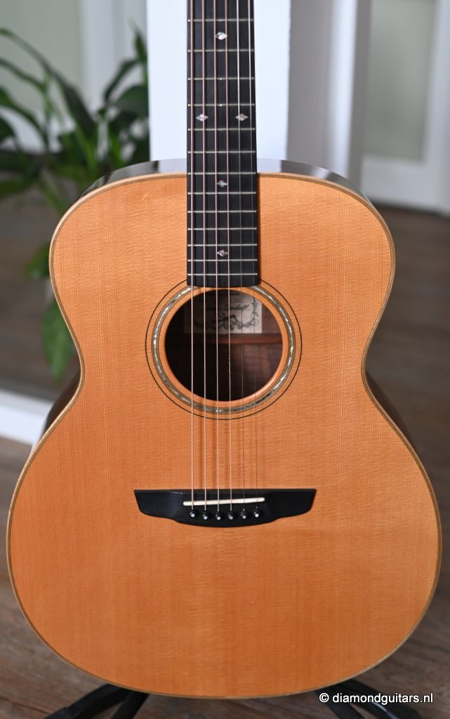 This wonderful instrument is a 2005 Goodall Concert Jumbo build with Engelman Spruce and spectacular Curly Walnut. She’s a wonderful versatile instrument great for fingerstyle guitar but can handle strumming and flat picking too.