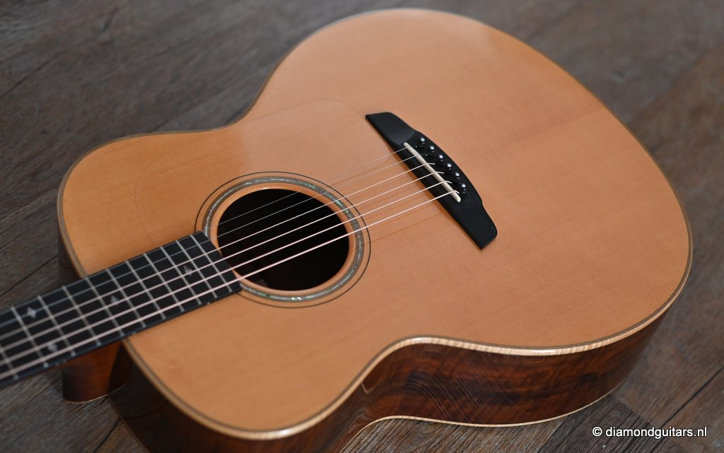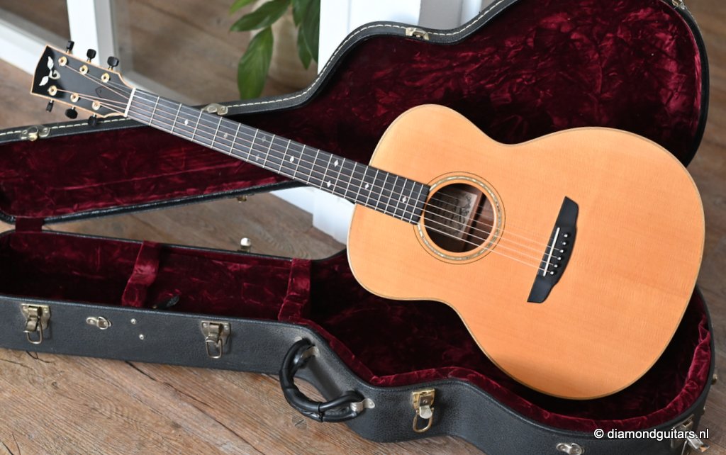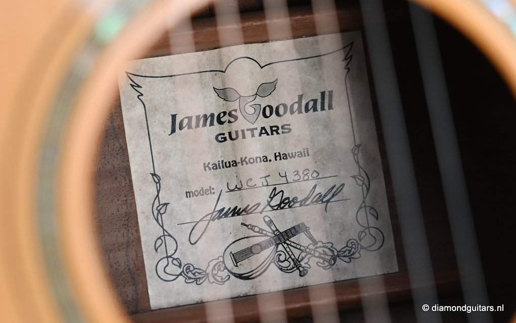 more comfortable size. Her voice blooms with harmonic richness, sustain, and a “piano-like” quality. Walnut provides just enough dryness to keep those overtones from becoming overpowering, giving the guitar clarity inside the lushness. The WJC body gives it excellent projection (approaching a dreadnought in volume), but with more balance and evenness across the strings. It’s equally at home with fingerstyle, open tunings, and lush strumming. This Concert Jumbo offers a lush, resonant, and refined tone, with a blend of warmth and clarity. Think of it as Rosewood with Mahagany dryness, wrapped in Goodall’s overtone-richt, modern voice. Since the CJ model retains the large acoustic soundboard area of the Standard or Dreadnought, while increasing comfort and curvy visual appeal, this model has become a favored size for many Goodall Guitar owners. She is in excellent condition. No dings, scratches or whatsoever. Just some lightly visible play marks on the clear pickguard. A beauty in every sense of the word! Listen to a sound impression here: