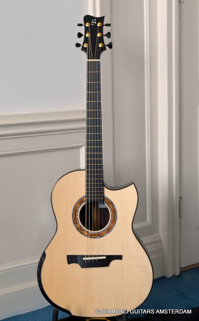 Michael Greenfield is truly passionate about guitars and tone. Great tone. FAT tone. Prior to becoming a full-time luthier in the mid 90s, he spent some 20 years repairing and restoring vintage instruments. Nowadays, he carefully handcrafts around 16 exquisite acoustic guitars each year in his Montréal shop, each one unique with custom specifications. He believes in squeezing every last molecule of tone out of his guitars. In short, Micheal is a master of fine, handcrafted acoustic guitars. This G1 is like the Steinway on your lap. Not as heavy but with 2.6kg dry weight you can imagine why she has that tone, sustain and presence, right there on your leg. She delivers unprecedented fat mid and high notes due to Greenfield’s proprietary Tone Halo and ‘modified lattice’ bracing inside the body. Also, the back bracing is different from most other guitars. Instead of traditional perpendicular braces, his braces radiate out from a central point on the lower back of the guitar to optimize tone and projection. More on his building approach in this vid.