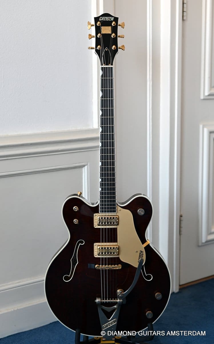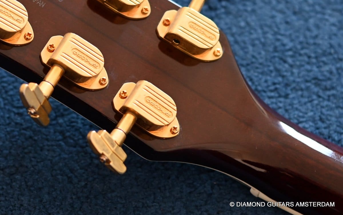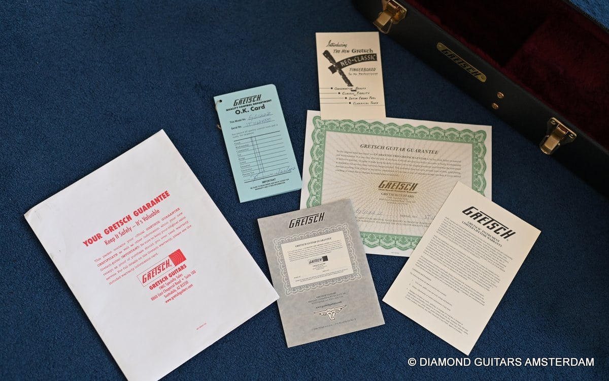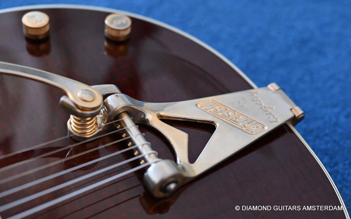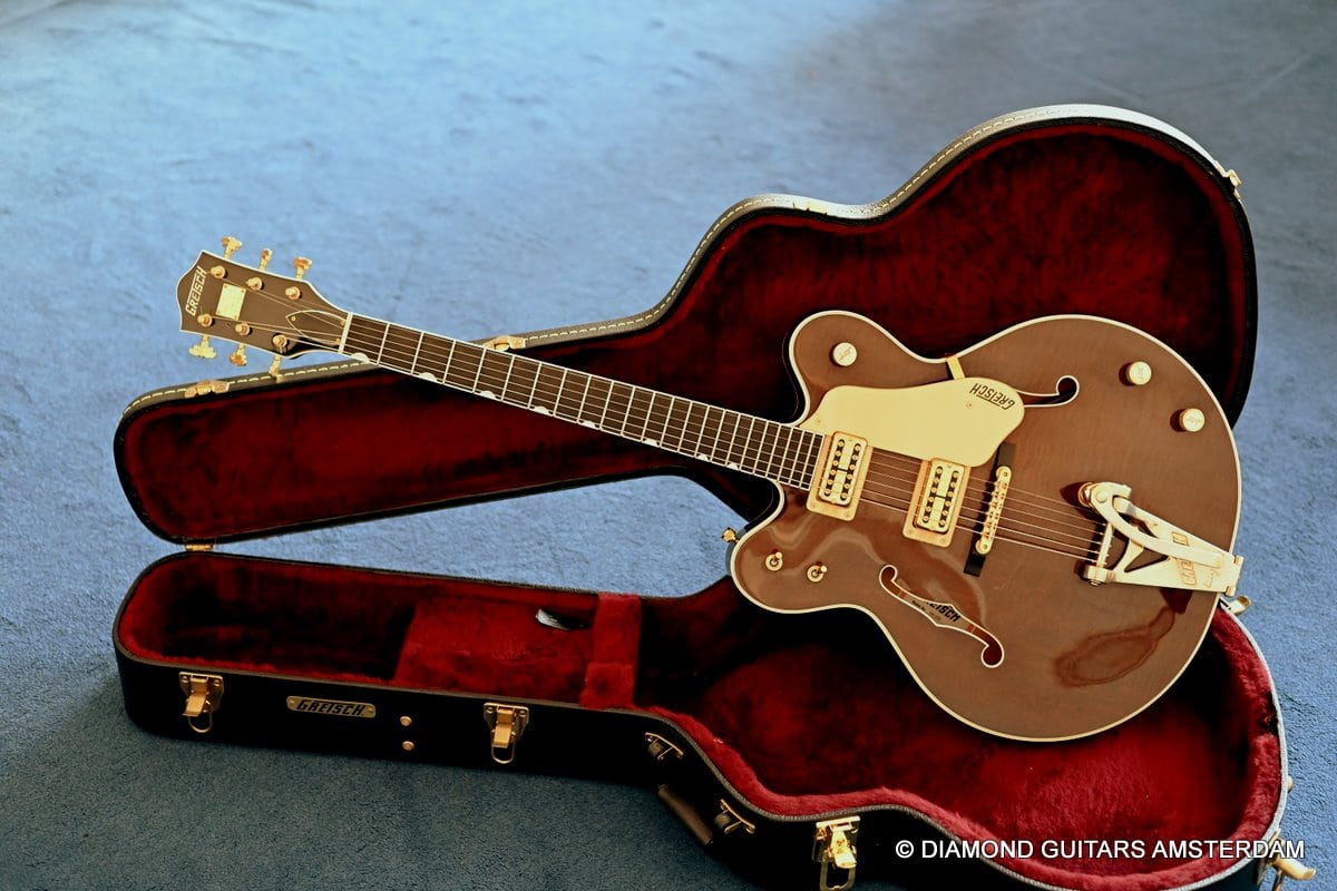 This modern version of the classic double-cutaway Country Gentleman features a rock maple neck joined at the 18th fret for easy access to the upper registers. Other features include a 17″ body with open f-holes, twin High Sensitive Filter’TronTM pickups, Adjusto-MaticTM bridge and Bigsby® B6G vibrato tailpiece. The Professional Collection by Gretsch offers the absolute highest standard for the discriminating Professional player. Gretsch has spared no expense to both recreate the sound and feel of their original electric guitars of the 50s and 60s and to offer models with more modern advancements. With dozens of different models and variations to choose from, there truly is a Gretsch for every playing style from traditional Chet Atkin’s style finger picking to hard driving Rock & Roll and beyond! With the Professional Collection you have a classic guitar build by modern precision standards! The guitar comes with a nice quality TKL case with the Gretsch logo and documentation! Gold plating has faded over the years but overall in Excellent condition. No dings, no scratches but light angel hair around the knobs.