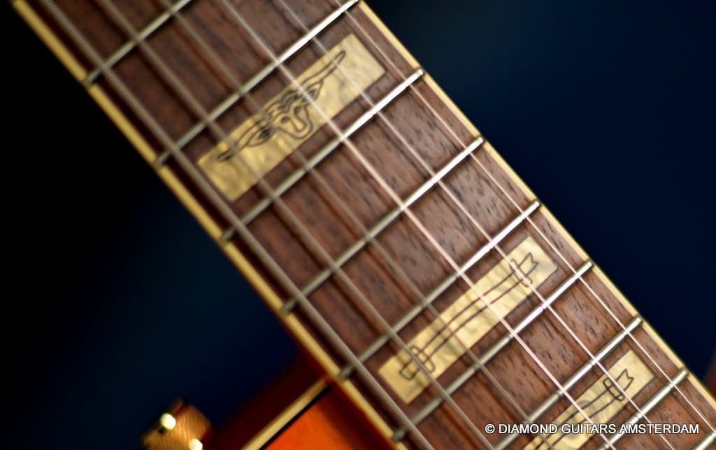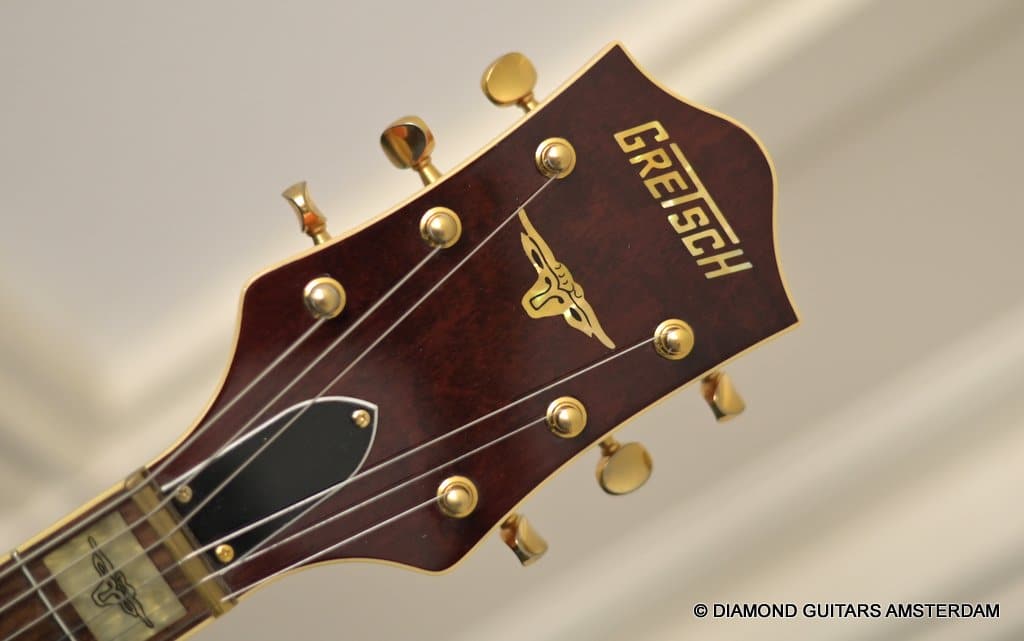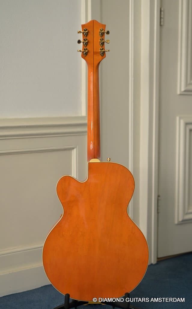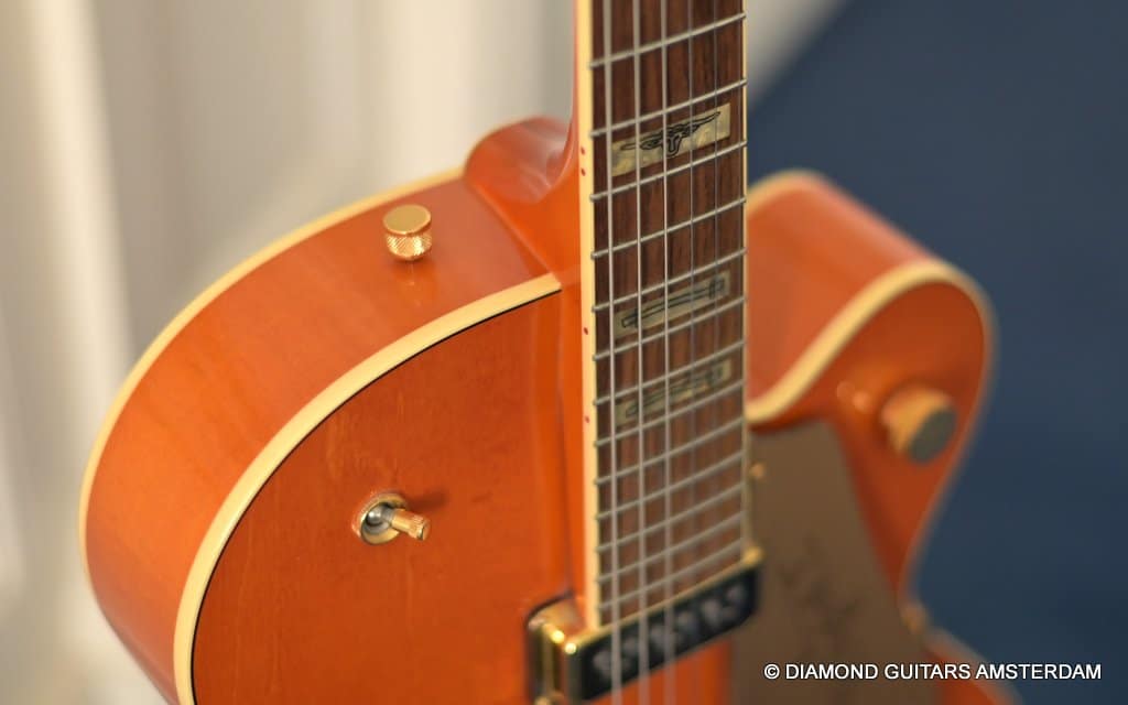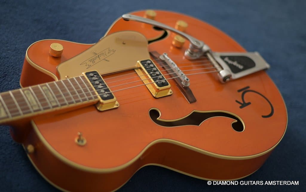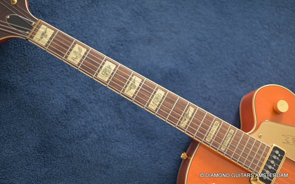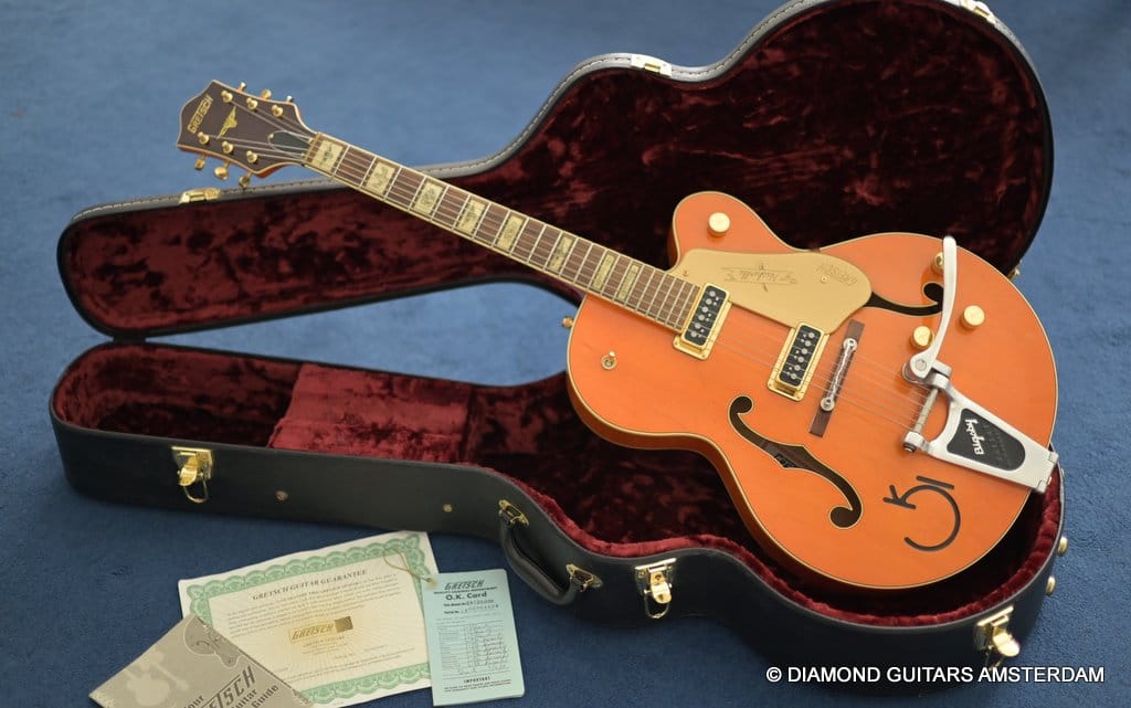 Based on early 1950s models, the Gretsch G6120DSW model is probably the iconic Gretsch with its G brand in the top and ‘Western’ motif inlays. A fully hollow guitar with tone bars and a soundpost for support, the DSW designation indicates that DynaSonic pickups are installed, and the Western decorations are used. The Gretsch 6120 was very popular and influential after its prototypes were presented in 1954 to Chet Atkins, then a rising and very respected guitarist, session player and producer. Atkins went on to use Gretsch guitars exclusively for many years, and shifted to an endorsement deal with Gibson around 1980 after Gretsch, owned by Baldwin, folded. The 6120 was also favored by many other top 1950s artists, notably including Duane Eddy.