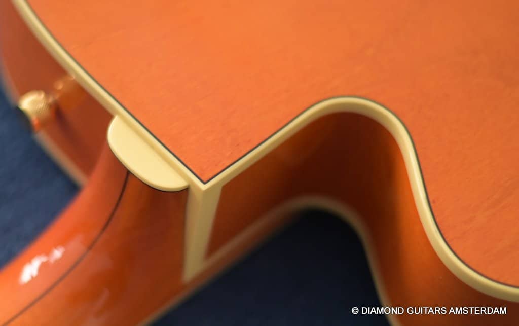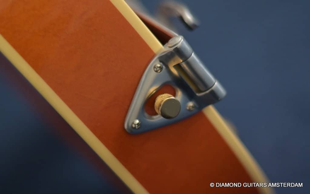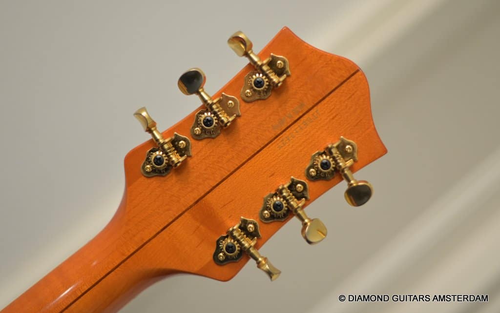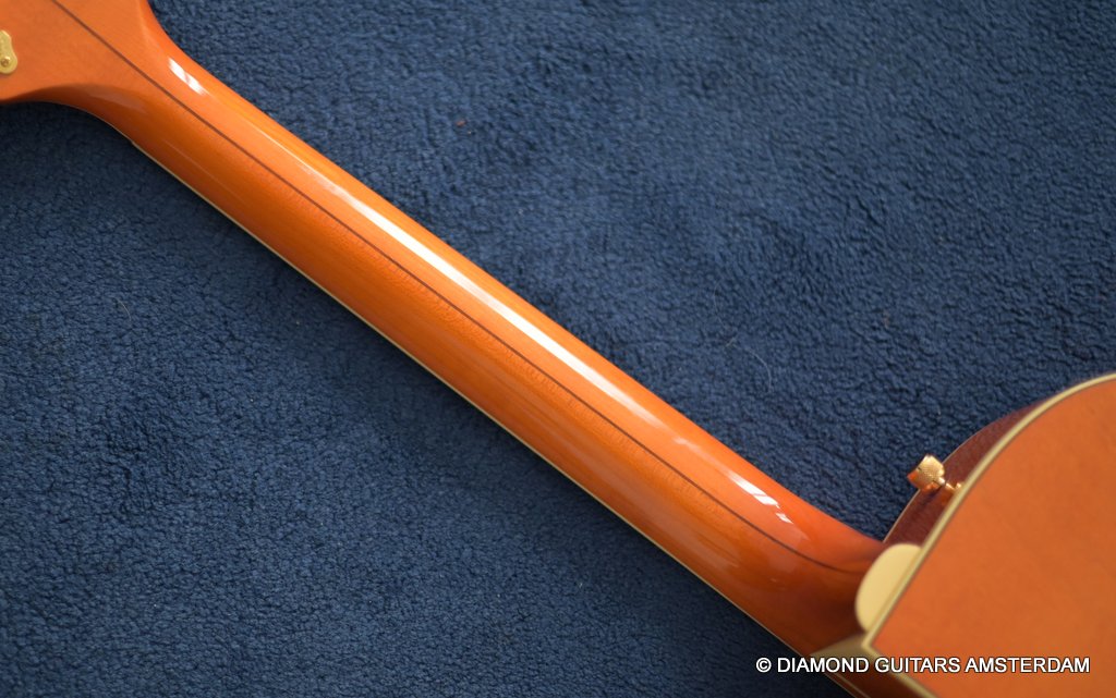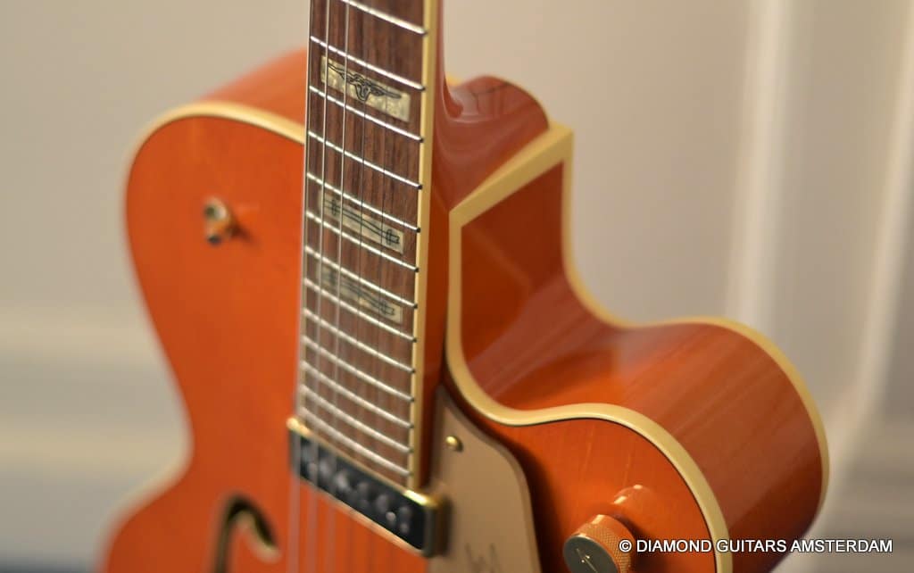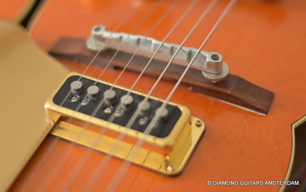 The Gretsch G6120 DSW is structurally similar to many other 6120 variants, but is closest to the early 1954-1955 models, before humbucking pickups appeared. This model also features a Brass nut, an attempt to equalize tone between fretted and open strings. The key differences are in the electronics – the DSW carries a pair of ‘DynaSonic’ single coil pickups built by Seymour Duncan to replicate 1950s deArmond models. This pickup design is quite elaborate, with spring-loaded carriers for the pole piece magnets very visible on the back. The wiring is typical pre-Filter’Tron Gretsch with a single pickup selector, master volume, individual volumes, and a master tone pot. On this model, the gold-plated knobs sport an arrow like the 1955 models, rather than the later G-Arrow design. A Bigsby is installed with the vintage flat handle and the bridge is an Aluminum unit, produced by Bigsby for use with their tailpieces, on a Rosewood base. These bridges tend to be very twangy! The Rosewood base has been glued to the finish. The finish is the classic Gretsch orange, and is in great condition. This is a really nice and easy to play guitar, comfortable and clean sounding. Her condition is excellent. Listen to a sound impression here:
