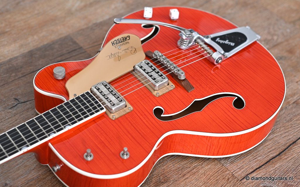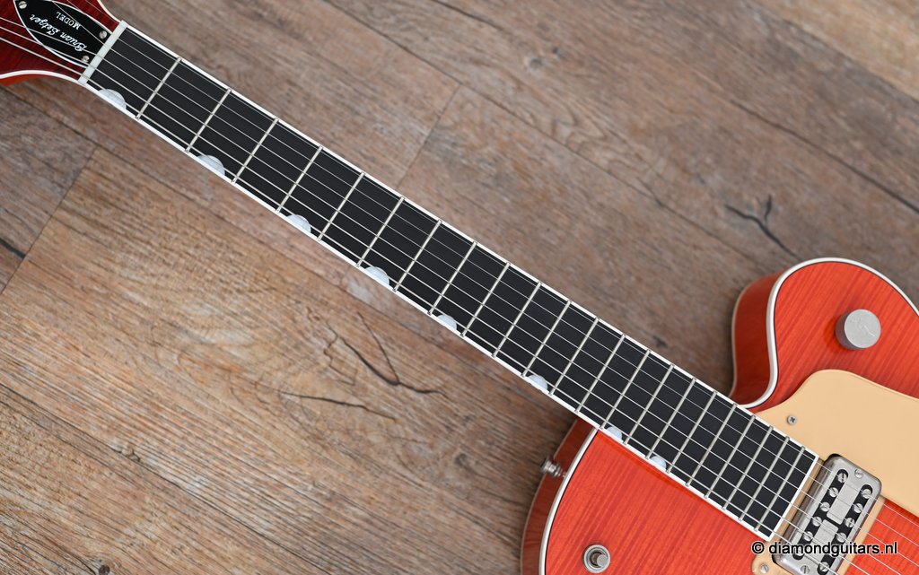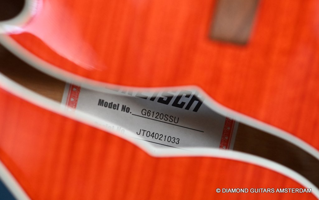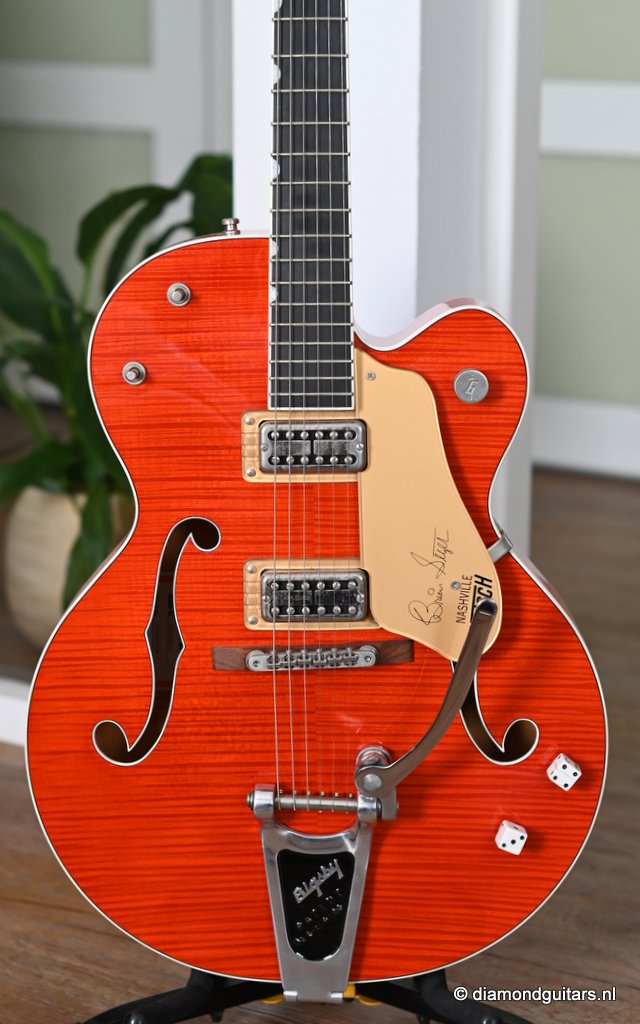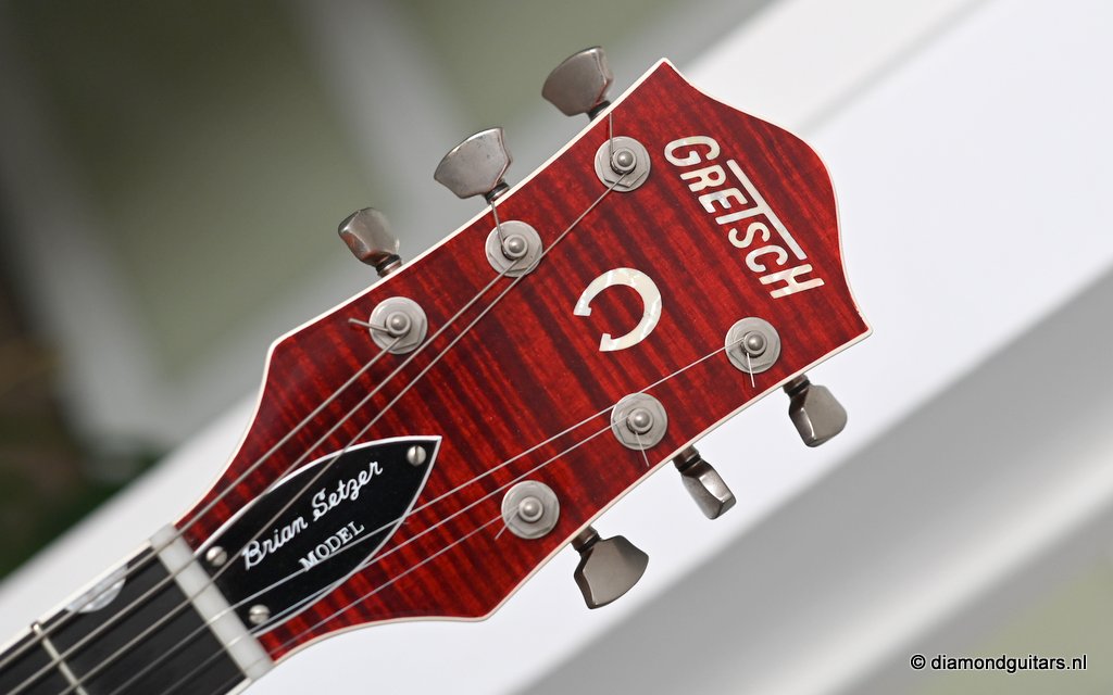 Introduced in 1954 as a Chet Atkins model, the Gretsch 6120 featured a fully hollow, 16 inch wide and 2 7/8 inch deep Maple Laminate body with bound F holes, tone bar / sound post bracing and a Maple neck with Rosewood or Ebony fingerboard and bridge base. The body, neck, headstock and F-holes are all bound. This version comes with the Bigsby B6 tailpiece. As was the practice at the time, the Bigsby, like the pickups and bridge, are not gold-plated. Naturally, its pickguard bears the Brian Setzer signature and the Gretsch Nashville logo. At the time this guitar was built, Gretsch did not have the rights to the Chet Atkins name; that was lost in 1980 and renewed in 2007, so the term ‘Nashville’ was used instead. Though the post-2014 models represent an evolution in the Gretsch Brian Setzer lineup, focusing on modern playability and feedback control, this pre-2014 models holds her distinctive charm, especially for players seeking a more vintage-authentic experience.
