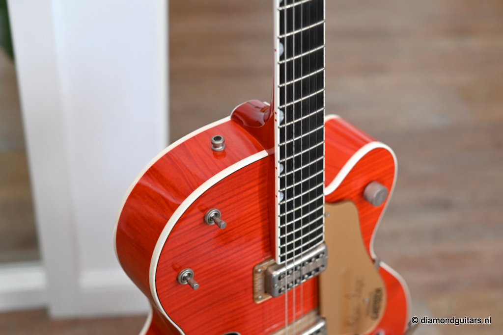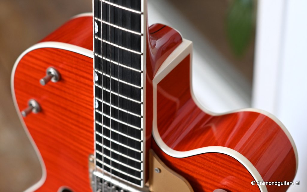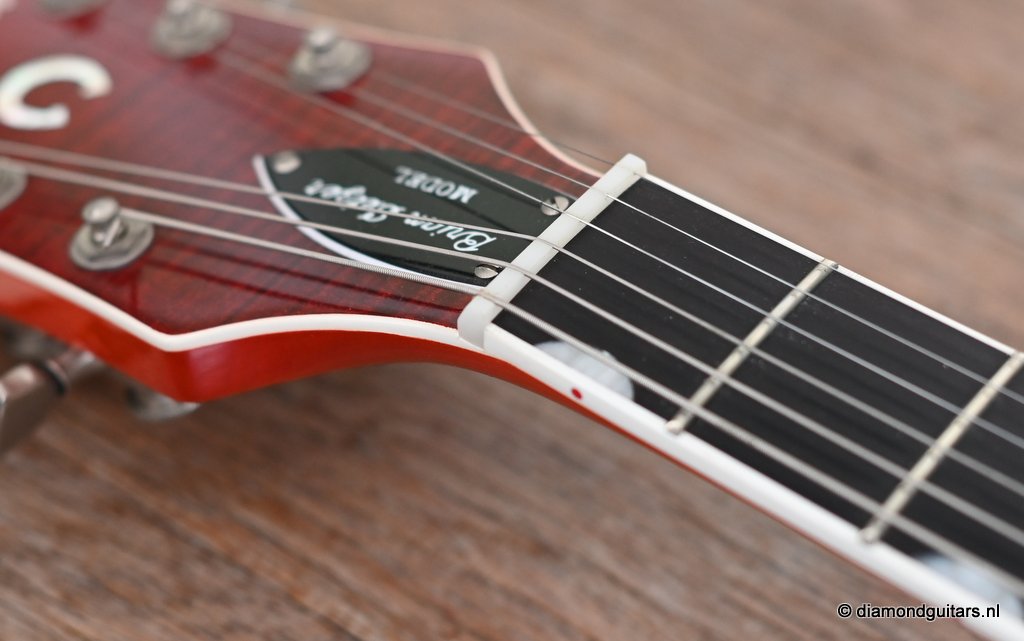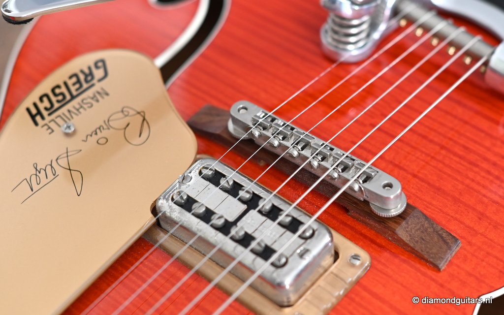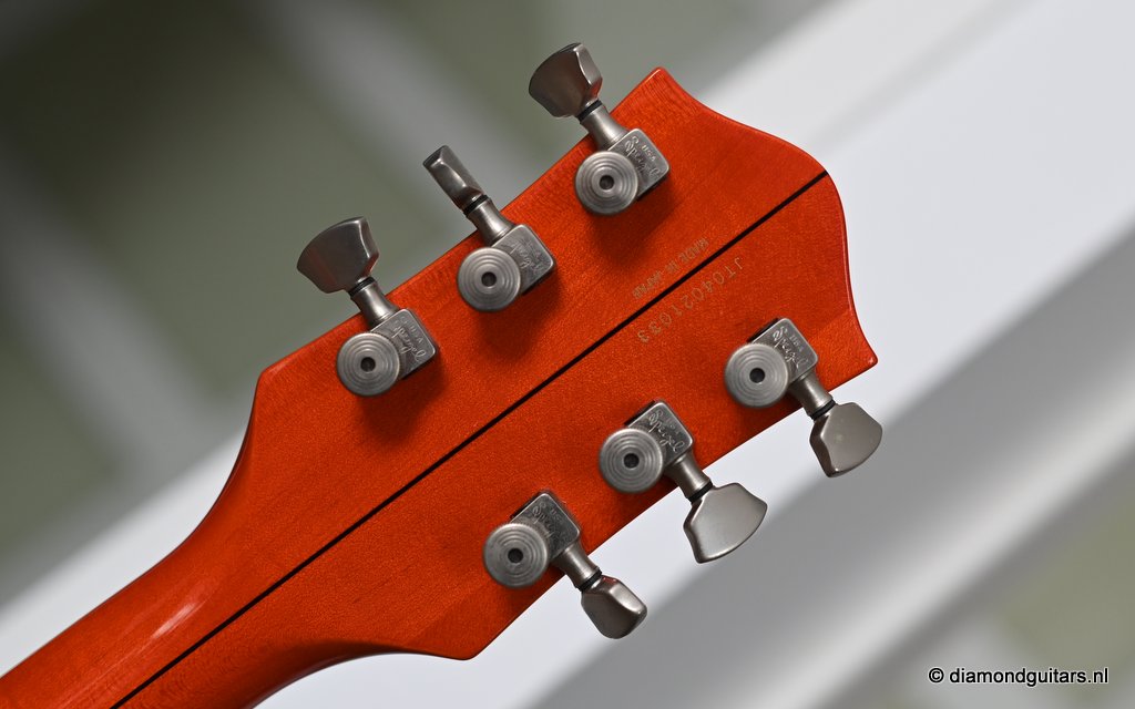 Introduced in 1954 as a Chet Atkins model, the Gretsch 6120 featured a fully hollow, 16 inch wide and 2 7/8 inch deep Maple Laminate body with bound F holes, tone bar / sound post bracing and a Maple neck with Rosewood or Ebony fingerboard and bridge base. The body, neck, headstock and F-holes are all bound. This version comes with the Bigsby B6 tailpiece. As was the practice at the time, the Bigsby, like the pickups and bridge, are not gold-plated. Naturally, its pickguard bears the Brian Setzer signature and the Gretsch Nashville logo. At the time this guitar was built, Gretsch did not have the rights to the Chet Atkins name; that was lost in 1980 and renewed in 2007, so the term ‘Nashville’ was used instead. Though the post-2014 models represent an evolution in the Gretsch Brian Setzer lineup, focusing on modern playability and feedback control, this pre-2014 models holds her distinctive charm, especially for players seeking a more vintage-authentic experience.