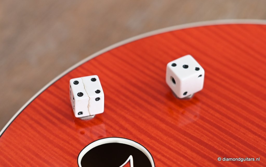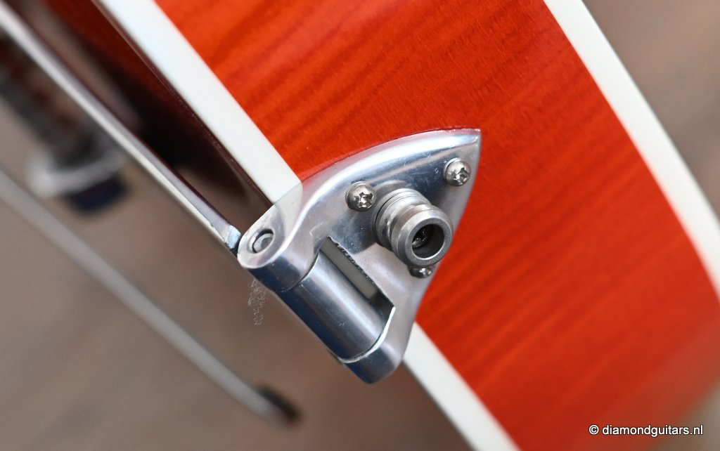 Here we’re looking at a Gretsch G6120SSU Brian Setzer built in Japan by Terada in 2004. As a Brian Setzer model, it is based his 1960 6120 models used in countless performances and recordings. It has a number of features specific to this model, in particular the use of Sperzel locking tuners, intonation-adjustable bridge, and ‘Dice’ knobs for the pickup volumes. The body is of awesome highly flamed Maple laminate. Later models add a ‘pinned’ bridge base, which Gretsch does in a particular way. Under the bridge base, a pair of headless Allen screws are inserted into the top above the braces. The bridge base is routed to fit onto these screws or pins. This allows the bridge base to move forward or back for significant intonation adjustments, while preventing the player from accidentally pushing the bridge to the side. The floating bridge is a standard feature of most archtop guitars, and many players use double-sided tape to secure the bridge. Gretsch’s approach allows for easy removal of the bridge, making service and cleaning easier.