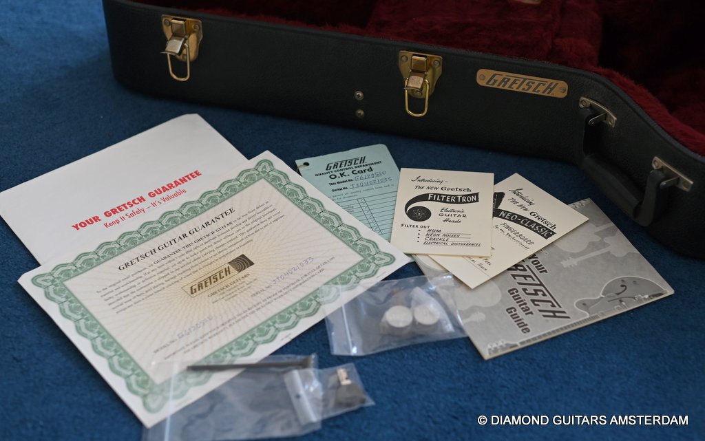 She is in overall excellent condition with only light wear: a couple of small dings on the back, light corrosion patina on pickups and knobs and very light pick marks. Fretwork is very good. She has a very comfortable, slim V profile neck and is really easy to play. And of course, she’s fitted with a pair of Setzer signature TV Jones Classic pickups. These pups are known for their clear, chimey, and articulate with a vintage-inspired sound with balance across bass, mids, and treble. Their moderate output closely replicating the sound of late 1950s Filter’Tron pickups with their tight lows, detailed mids, and a bright but not piercing high-end.