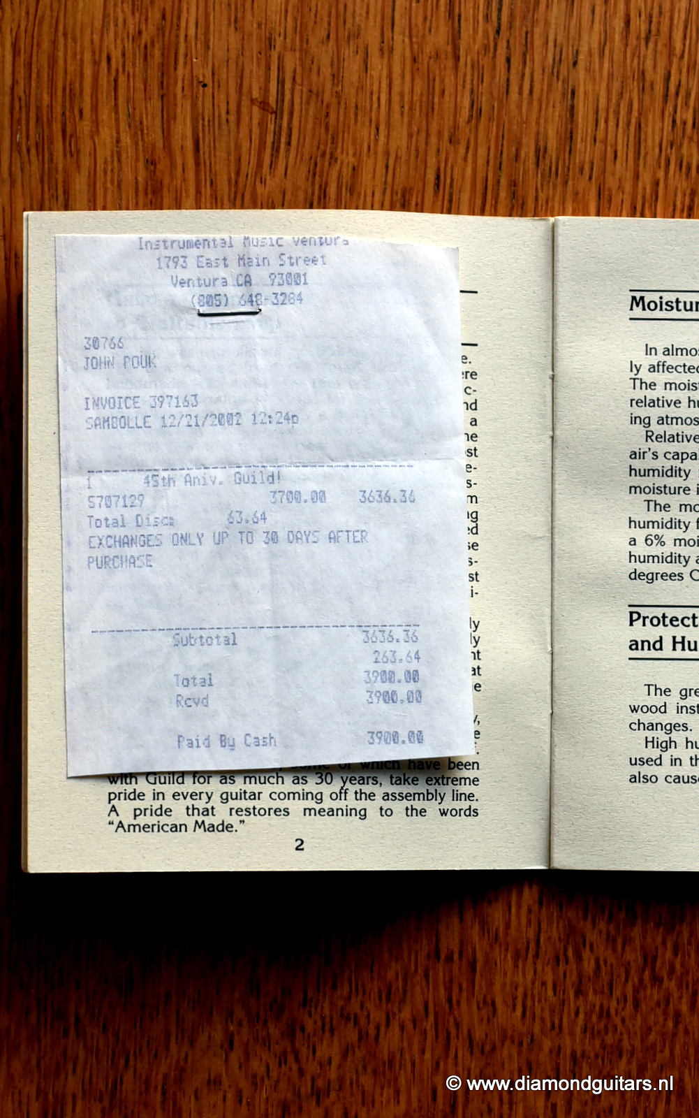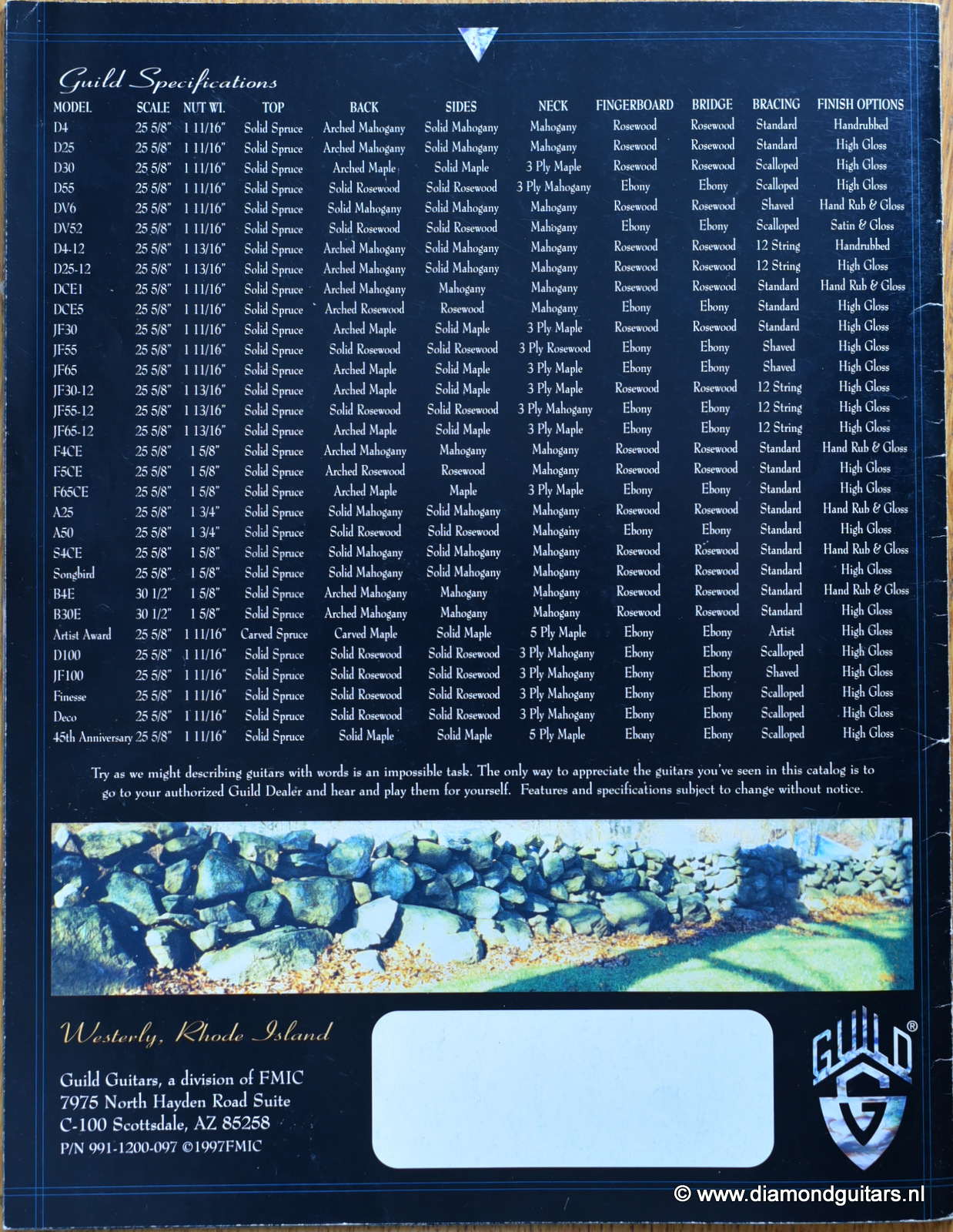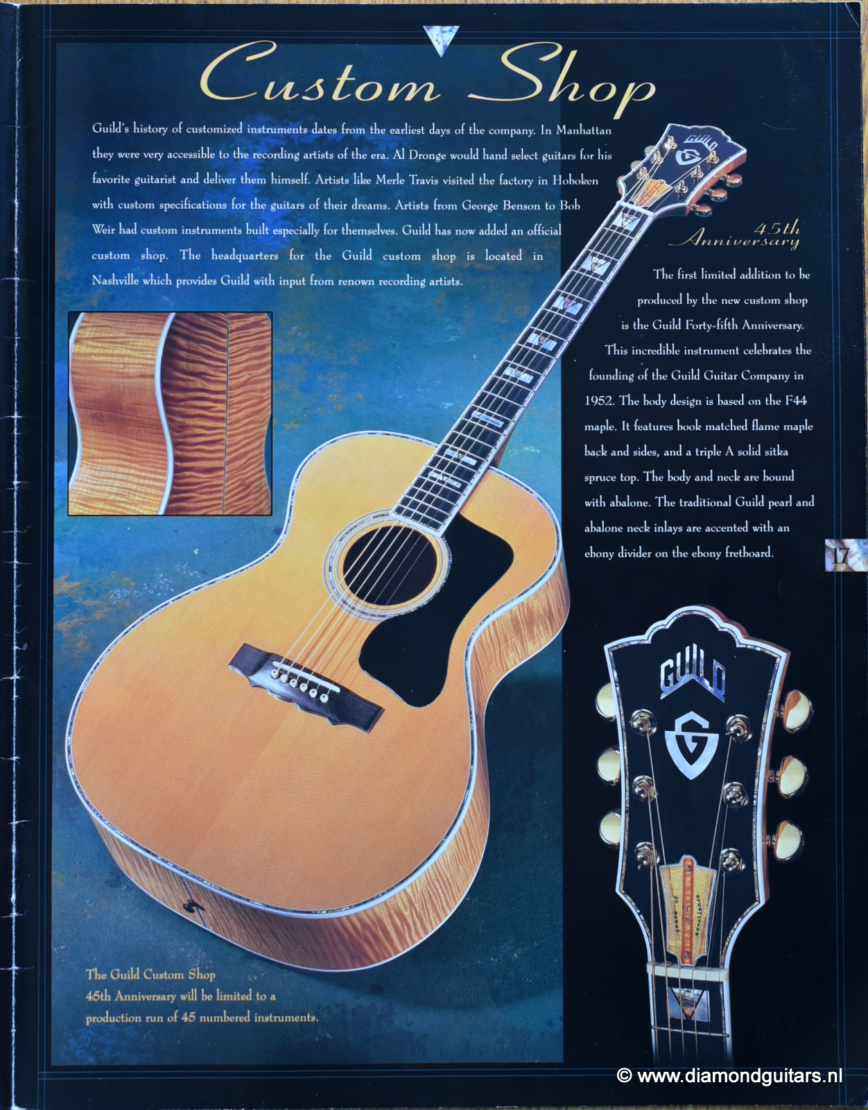 Between 1997 and 1999, the Nashville Guild Custom shop was created by Bruce Bolen (Fender) and Tim Shaw (Guild), they waged up and trained some top luthiers (Mark Kendrick) and custom created top models like the D-100 for George Straight, the double-necked Crossroads for Slash, the Finesse and Art Deco and built 45 works of art: the 45th anniversary limited edition! They even struck a deal with Bob Benedetto to re-think and custom build the X-500, X-700 and the Artist Award alongside his La Venezia and the Fratello. In Nashville….music city number 1!