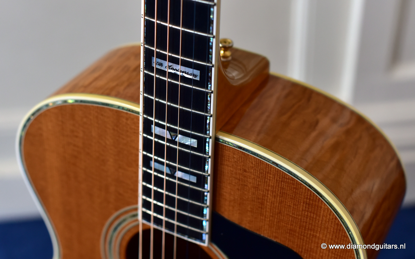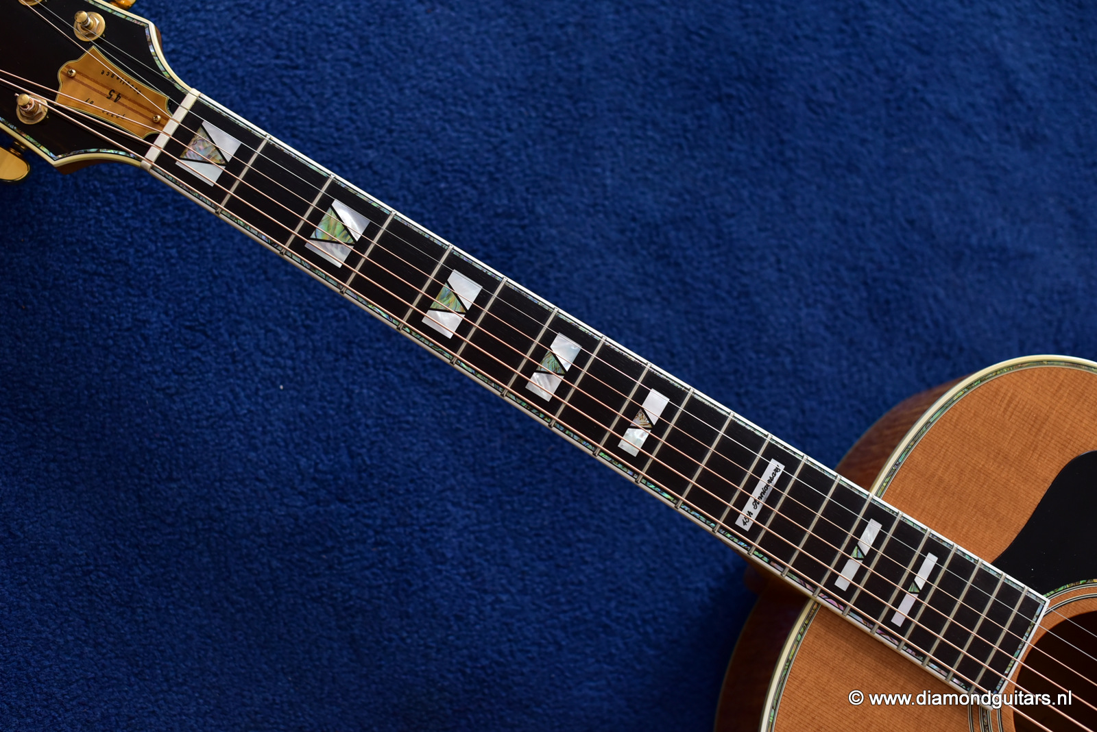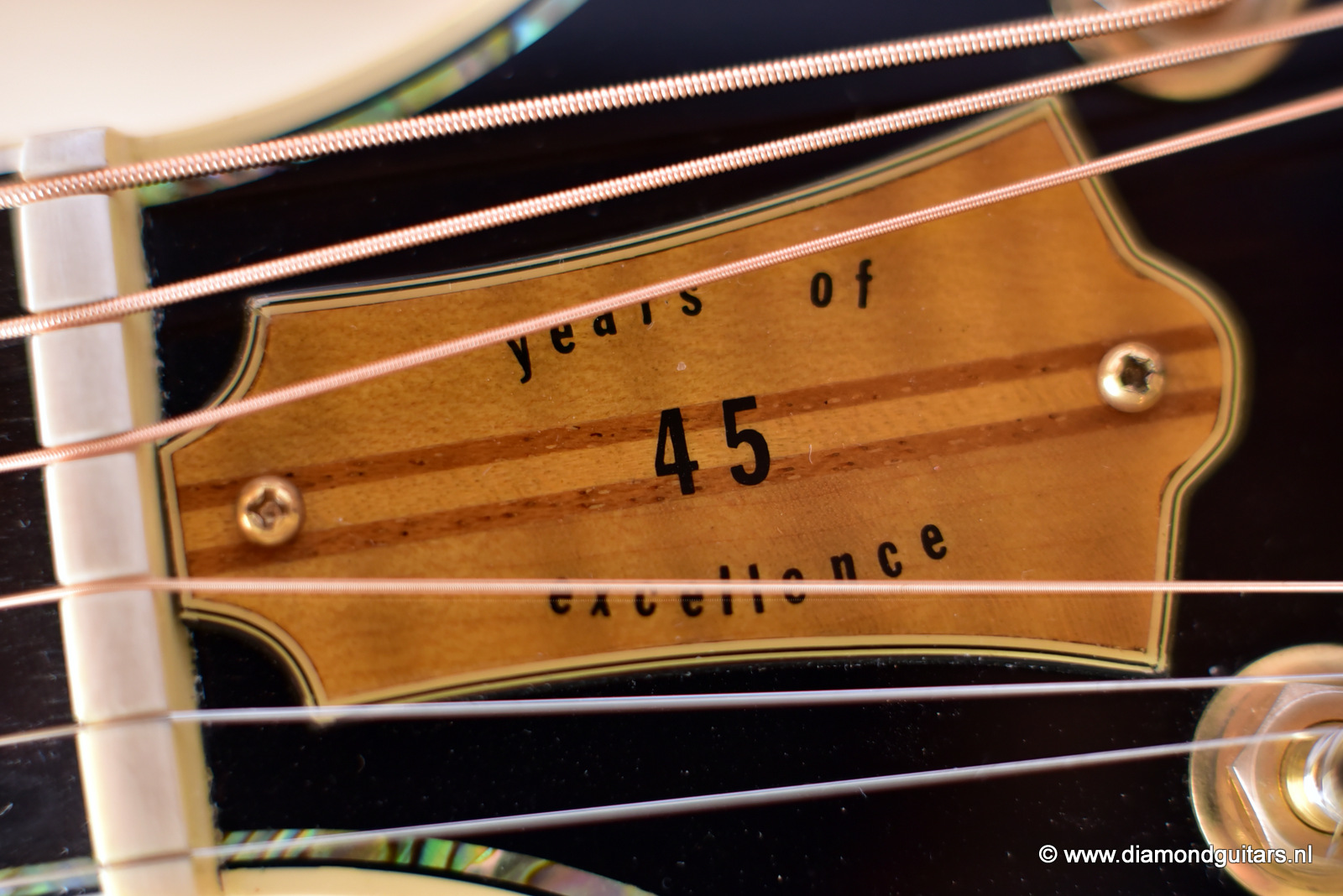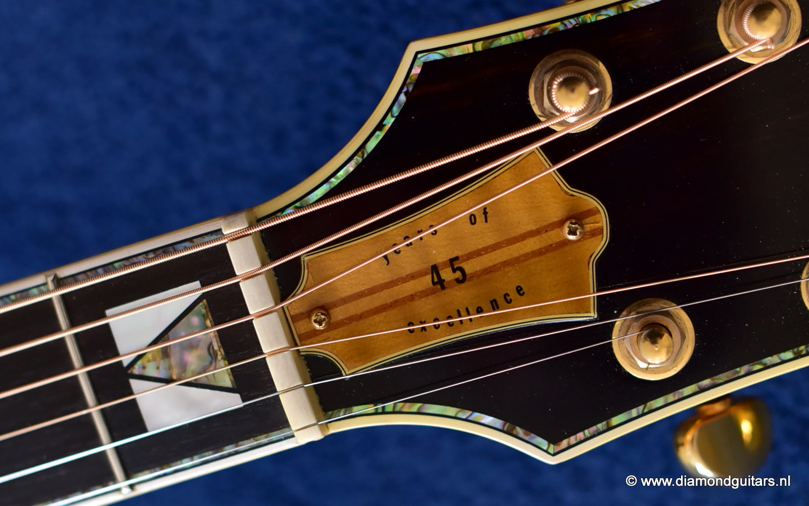 The neck is a 5-ply curly Maple and Mahogany, most commonly seen on the legendary Artist Award. The peghead is faced with solid Ebony and showcases the traditional “inverted G” pattern in mother-of-pearl. For this 45th Anniversary model, custom shop luthiers painstakingly inlay the top, fingerboard, peghead and back strip with rare Paua Abalone from New Zealand. The guitar also includes an Ivory nut and compensated saddle, made from fossilized mammoth Ivory found legally on the tundra in Alaska. The 45th Anniversary is limited to an individually numbered series of only 45 guitars and is supplied with a special “black alligator” covered case.