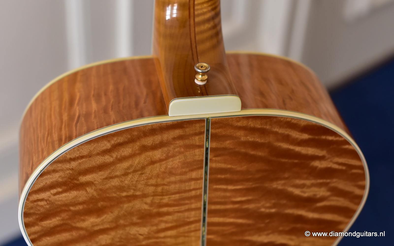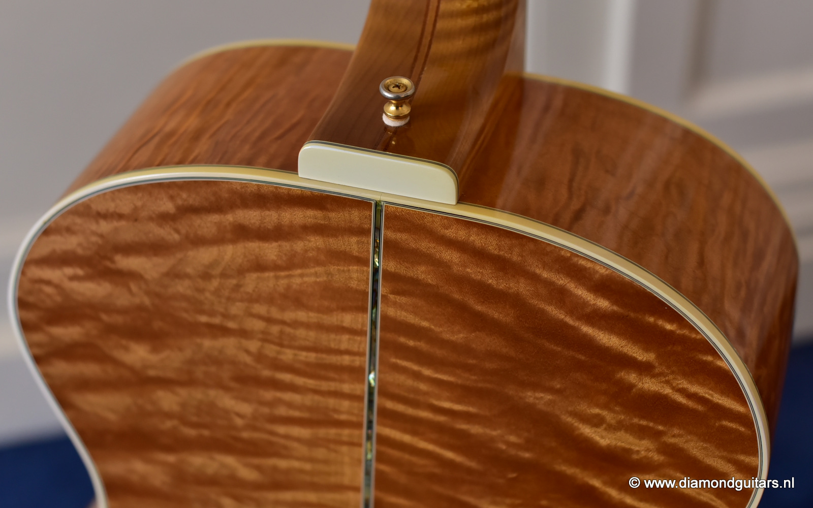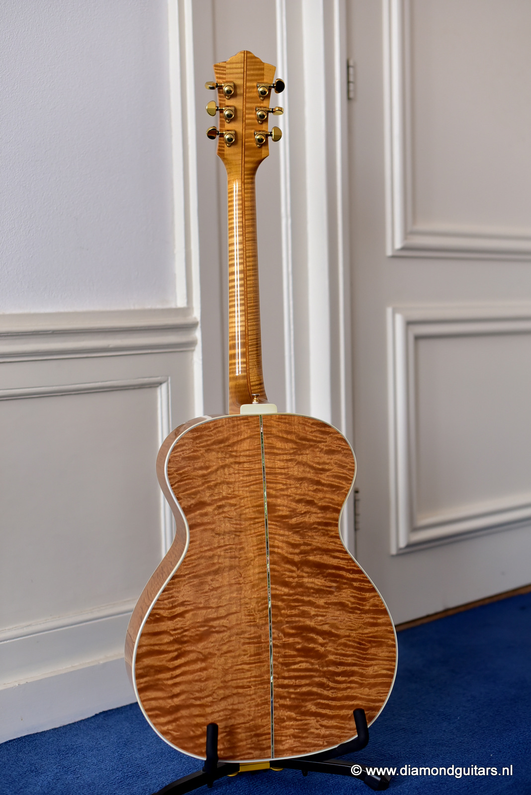 The body of the 45th Anniversary model measures 15″ x 20″ x 4″. This distinctive Guild F-shape features greater body depth than other instruments of a similar size, and helps produce the clear and balanced tone associated with Guilds. For the 45th anniversary, the luthiers in the Custom Shop have hand-bent solid curly maple for the back and sides, and chosen a very nice quarter sawn AAAA-grade Sitka spruce for the top. Each 45th Anniversary top is hand-tuned for maximum performance and features scalloped and shaved top bracing in Guild’s “floating X” pattern. This pattern, common to all Guild Custom Shop guitars, locks the main tone bars into the rims at the waist for stability, while allowing the lower bout to flex freely.