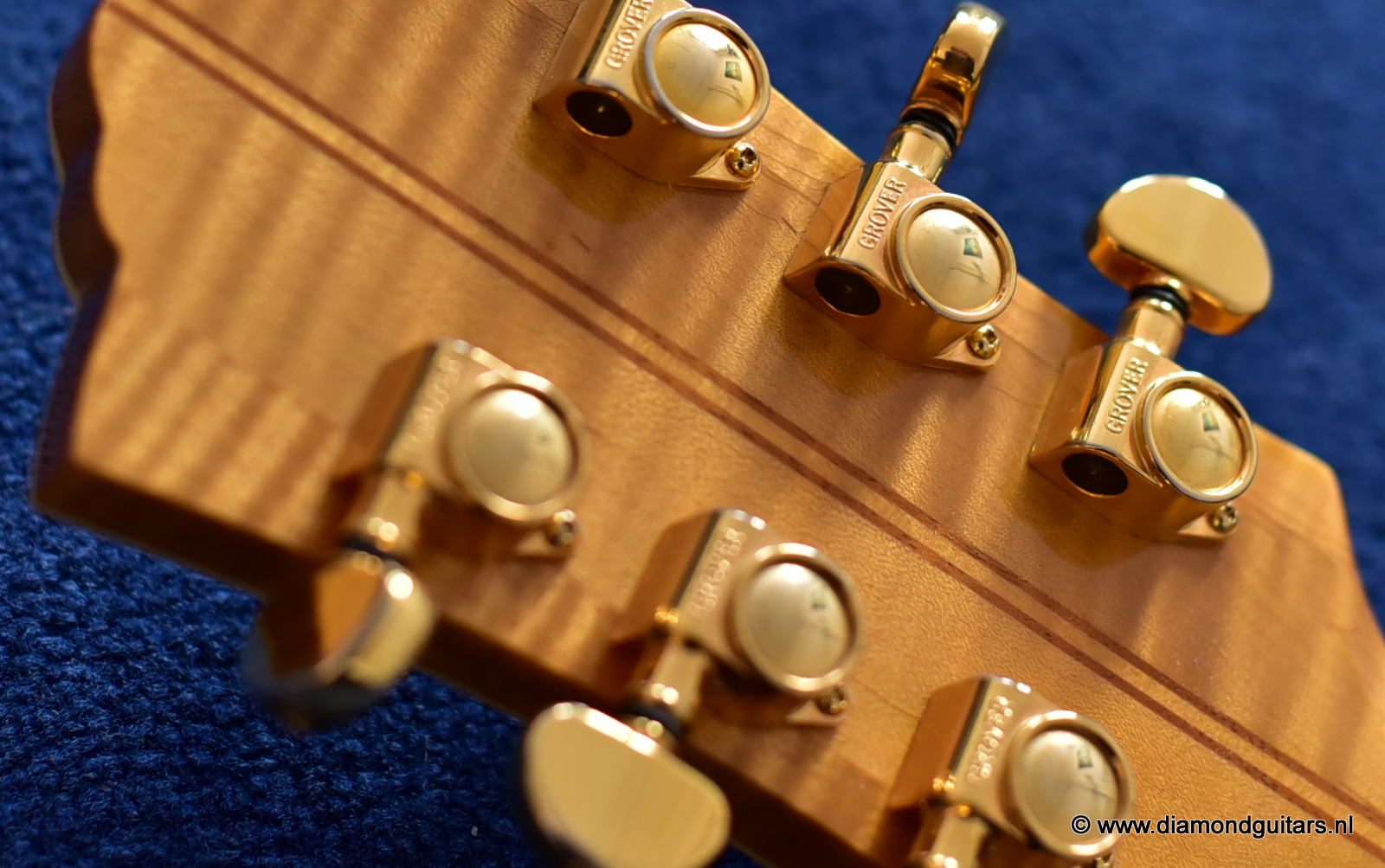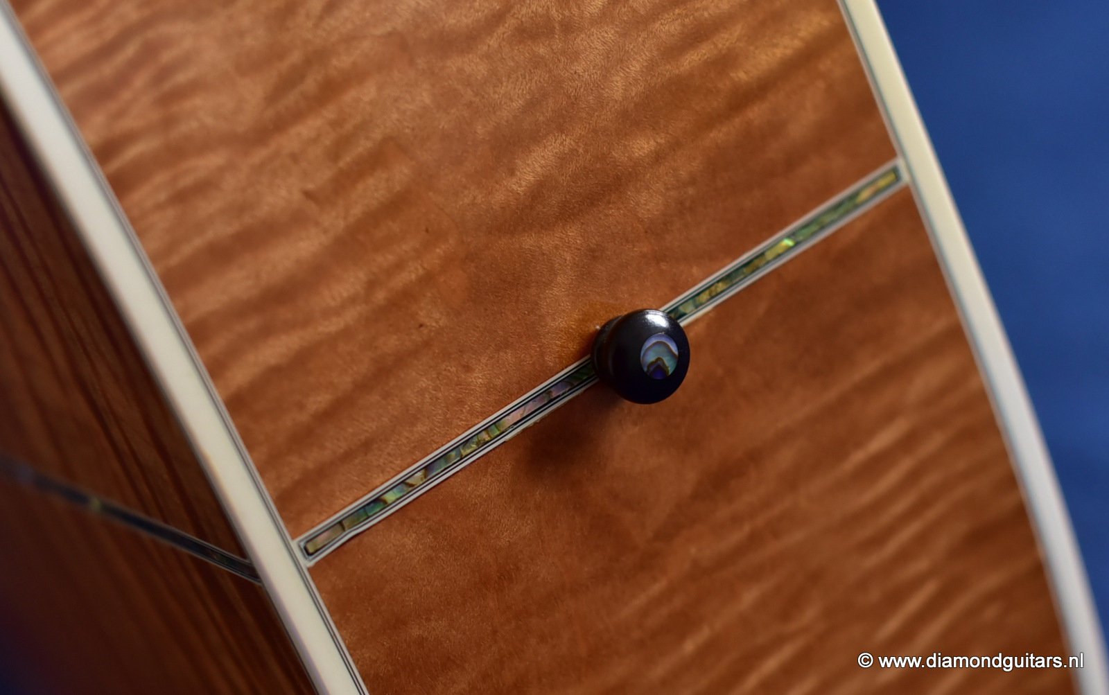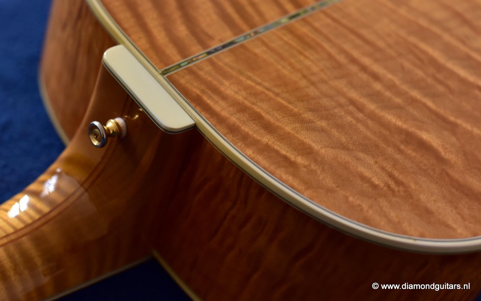 The body of the 45th Anniversary model measures 15″ x 20″ x 4″. This distinctive Guild F-shape features greater body depth than other instruments of a similar size, and helps produce the clear and balanced tone associated with Guilds. For the 45th anniversary, the luthiers in the Custom Shop have hand-bent solid curly maple for the back and sides, and chosen a very nice quarter sawn AAAA-grade Sitka spruce for the top. Each 45th Anniversary top is hand-tuned for maximum performance and features scalloped and shaved top bracing in Guild’s “floating X” pattern. This pattern, common to all Guild Custom Shop guitars, locks the main tone bars into the rims at the waist for stability, while allowing the lower bout to flex freely.