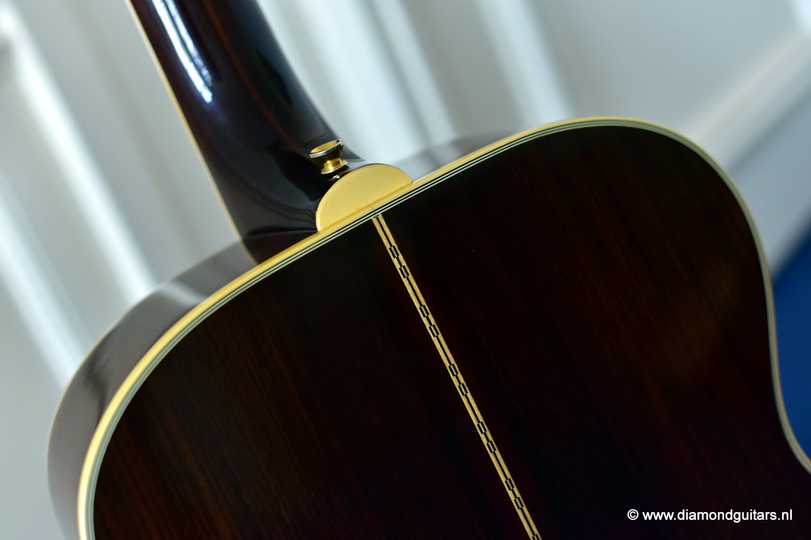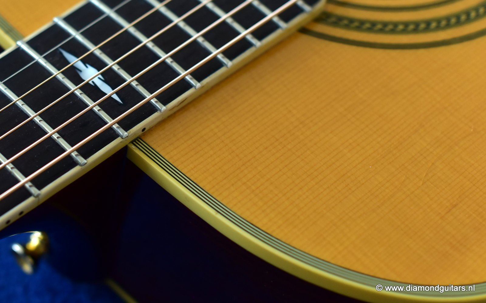 This Guild GF60 is a rare beast indeed. With an interesting story: George Gruhn and Kim Walker were asked to design a special guitar line. The Guild GF-60 was prototyped and designed at the Gruhn Guitarshop in Nashville, somewhere around 1984. They were built at the Guild Guitar plant between 1985 and 1988. George Gruhn gave Kim some specs he wanted in that line of guitars. Kim was at that time shopforeman/restorer deluxe at Gruhn Guitars. The Guild Traditional GF-series are high end guitars. Only solid tonewoods were used. This GF60 came with an Englemann Spruce top and stunning East Indian Rosewood back and sides, scalloped braces and a sexy snakehead-ish peghead with Gold Grover ‘waffleback’ tuners.