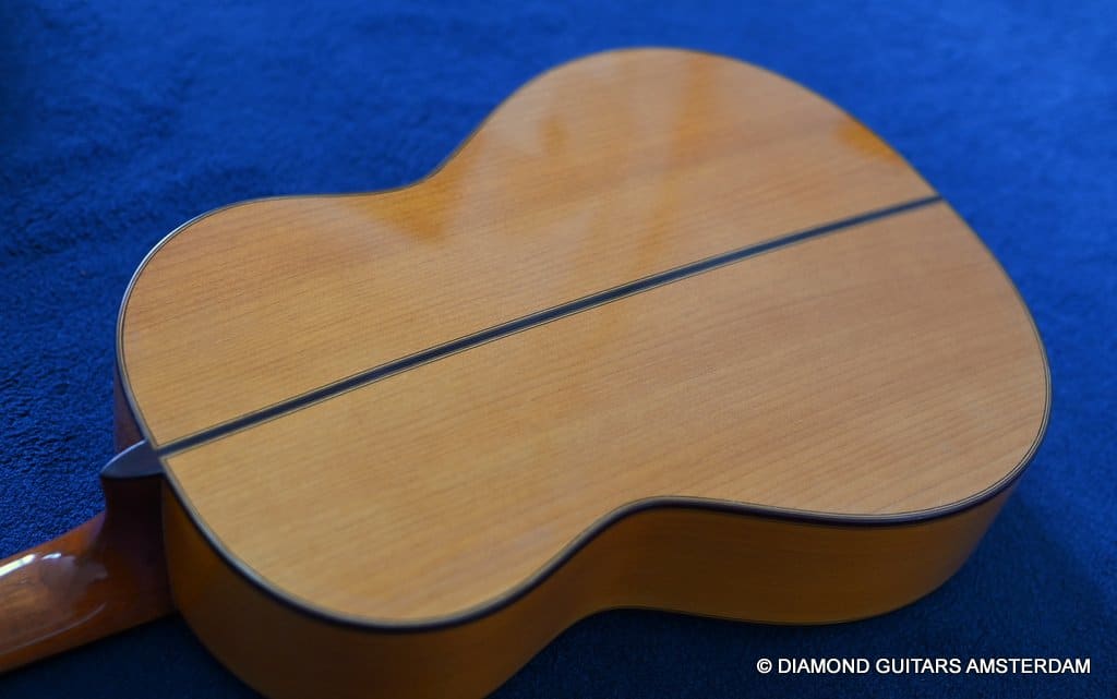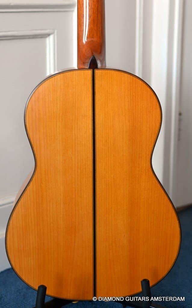 This 2017 José A. Fuentes #109 is an extraordinary flamenco guitar built with a mastergrade German Spruce top and Royal Spanish Cypress for back and sides. The top has a beautifully accentuated and straight grain. A guitar with a very personal timbre and with astounding strength and quality. Bass notes offer a great foundation. Mid and high notes a clear and warm. Great projection, quick response and dynamic voice, which make her the perfect instrument, ideal to be used both as a concert guitar and as an accompaniment guitar for singing and dancing.