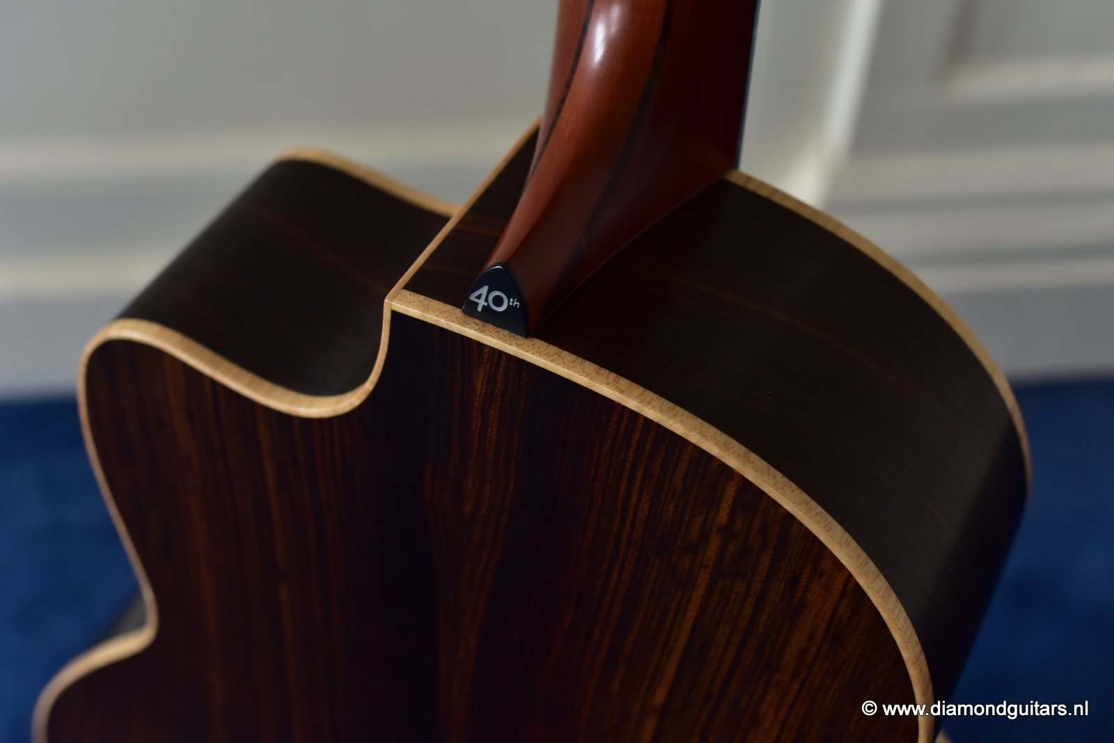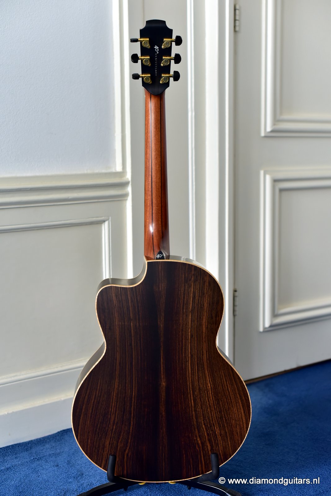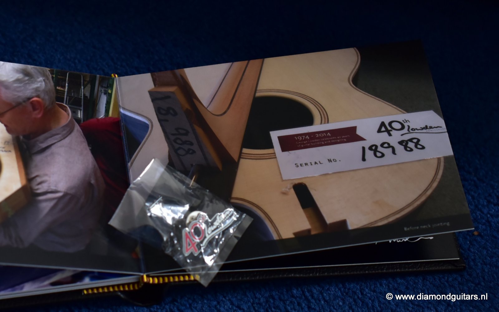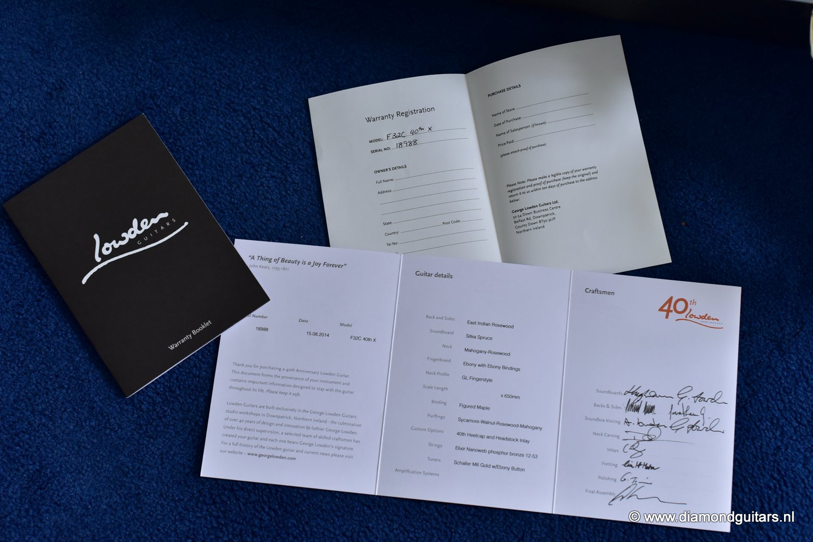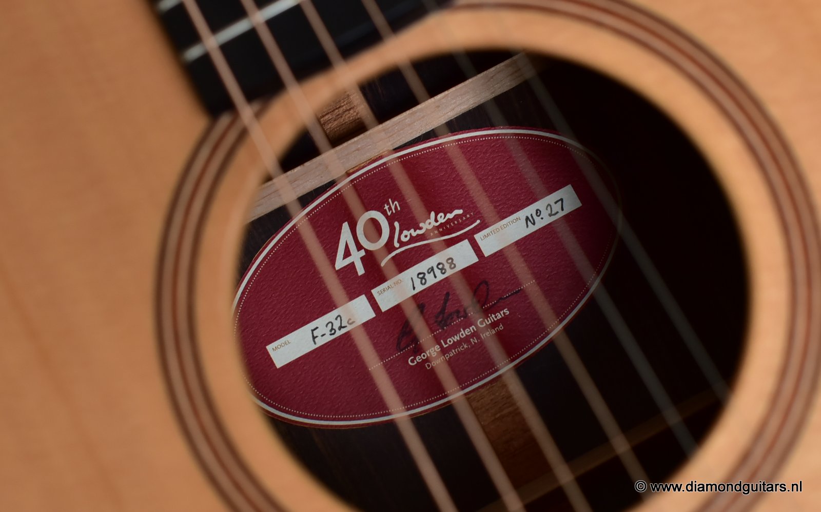 The 40th Anniversary Limited Edition Option is focued on the celebration Georges 40 years with Lowden Guitars. This option was made available as an upgrade to any guitar in the Lowden range. This provided the opportunity for Lowden customers to play an important role in choosing the unique family of hand built Lowden instruments built in celebration of the anniversary year. Lowden Guitars is a company of luthiers founded and led by George Lowden. George Lowden has personally chosen all woods and bracing sets, voiced and hand-carved the dolphin profile and closed the soundbox on these limited guitars. George also personally inspected the final set up. Each of these 40th Anniversary guitars bears a specially designed label and 40th inlay. Accompanying each 40th Anniversary guitar is a hand made, serial number- specific, souvenir photographic record book of the guitar being built. Finally every 40th Anniversary guitar also has a special edition Lowden Provenance document which bears the signatures of all of the craftsmen involved in building the guitar.