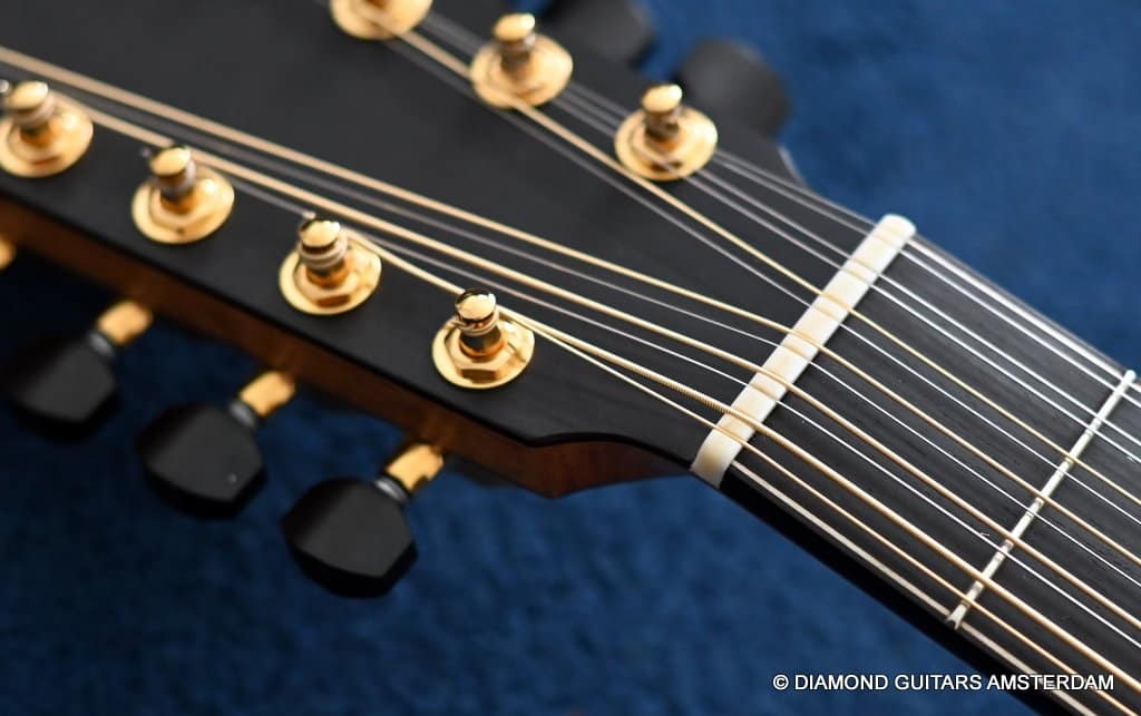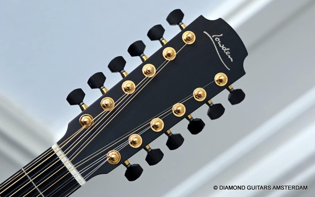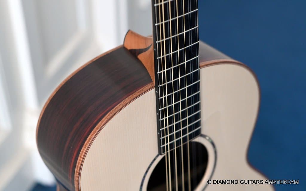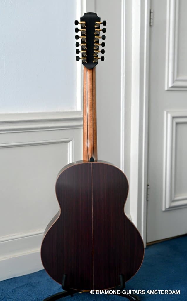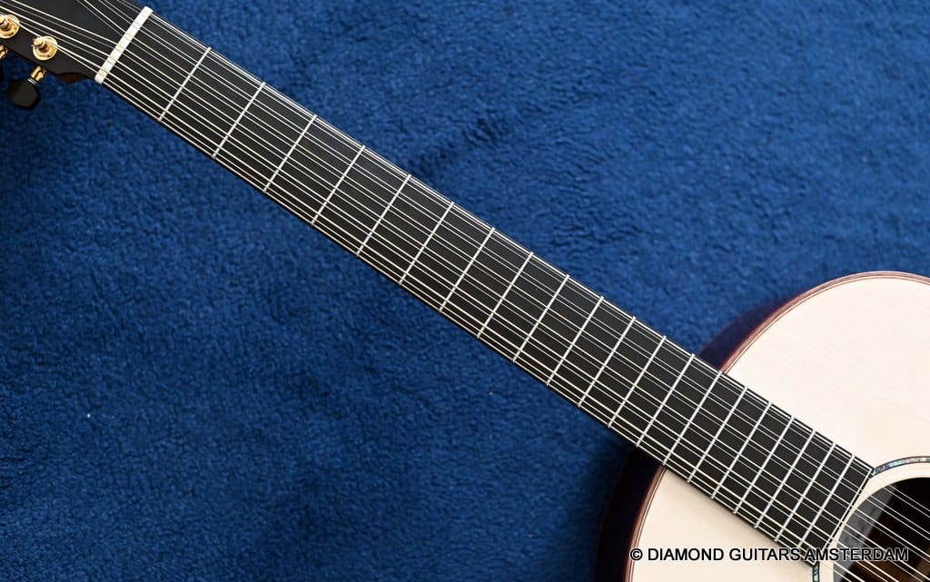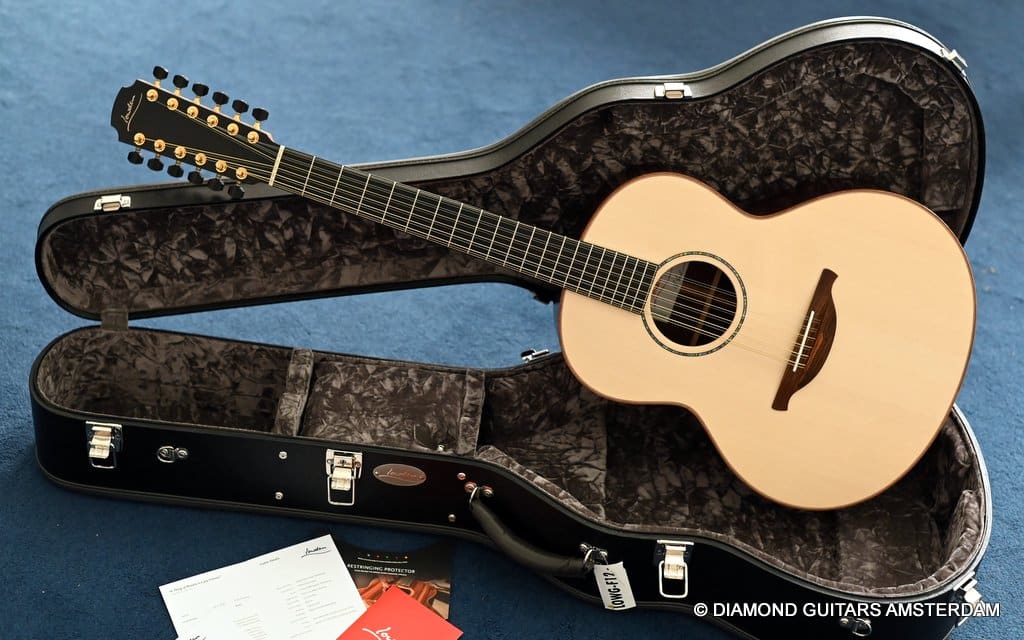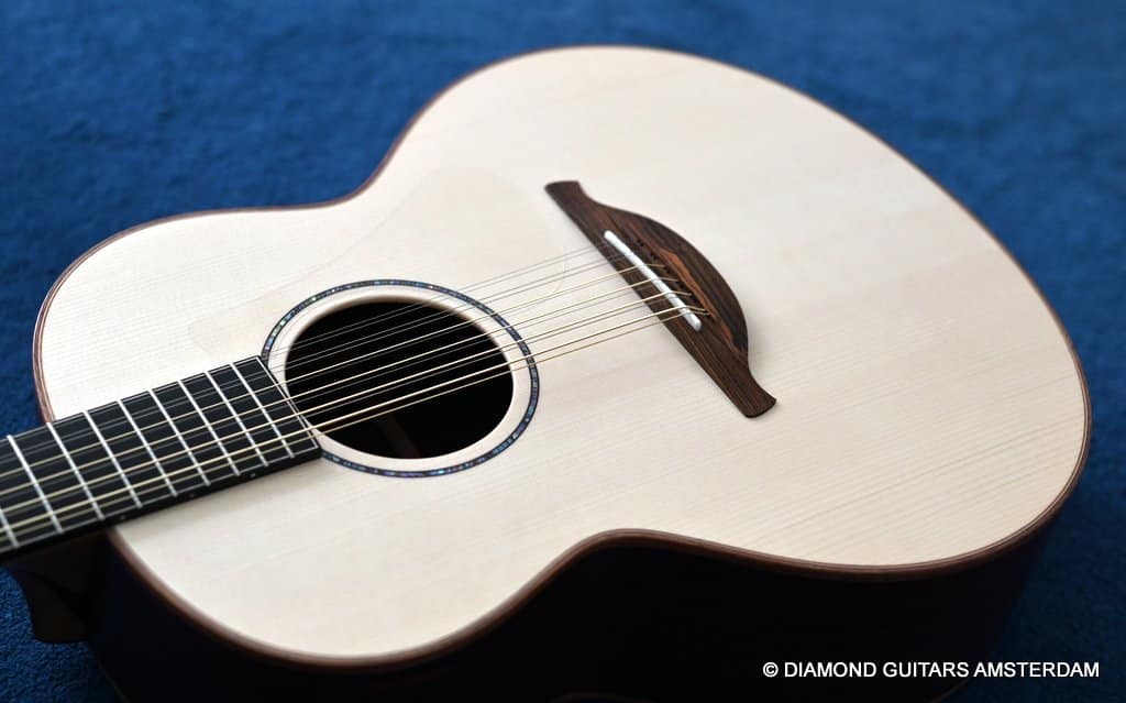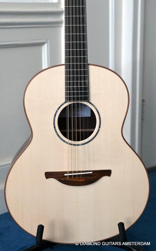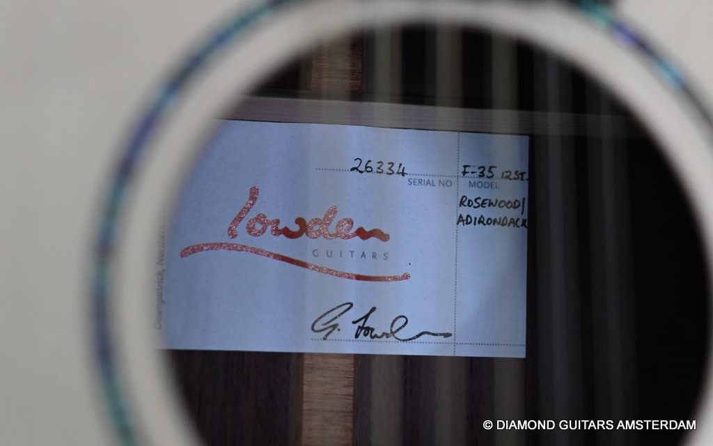 This Lowden F35 Indian Rosewood – Adirondack 12-string is a powerful beauty. Subtle use of figured and beautiful woods, and above all…their superb tonal definition and separation. AAAA figured tonewoods used throughout, Abalone and wood rosette, hand mitred purfling joints on sides and back, wood (Ebony/Maple) bound Ebony fingerboard, the superb Gotoh 510 series gold tuners with Ebony knobs. She has deep and solid bases, a fat and rich high and beautiful open midrange. Chords and complex tunes flow clearly and detailed. This is the perfect guitar for the flat- and finger picker and every other player looking for a comfortably playing and holding hand build, high quality acoustic guitar that will help you explore all the details of the right-hand play.
