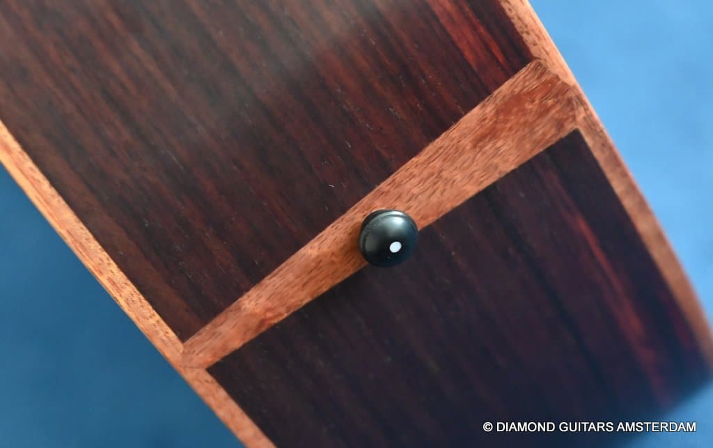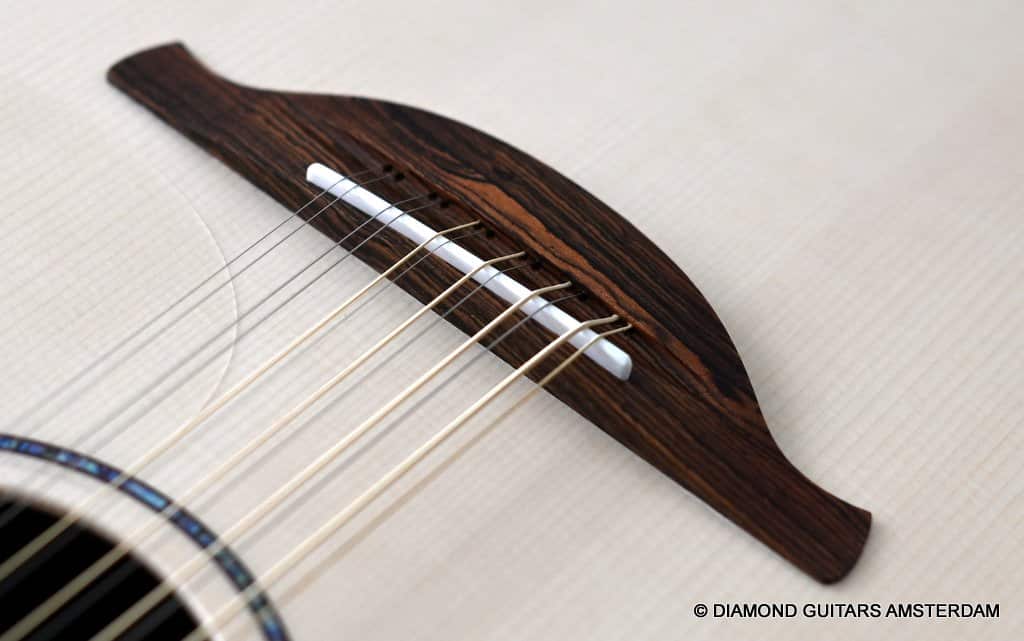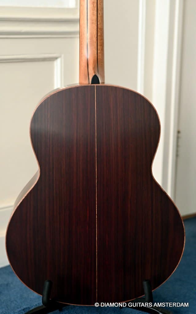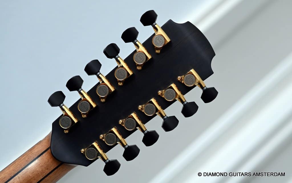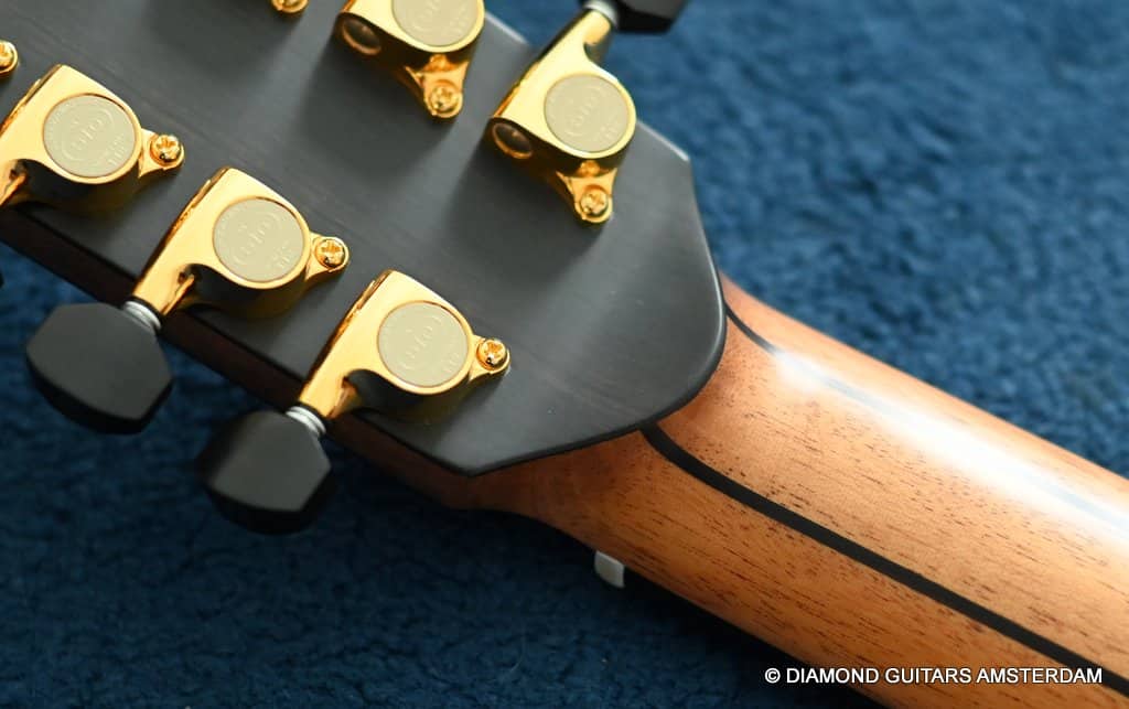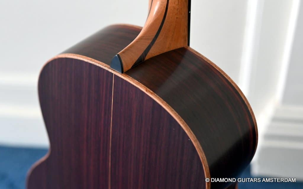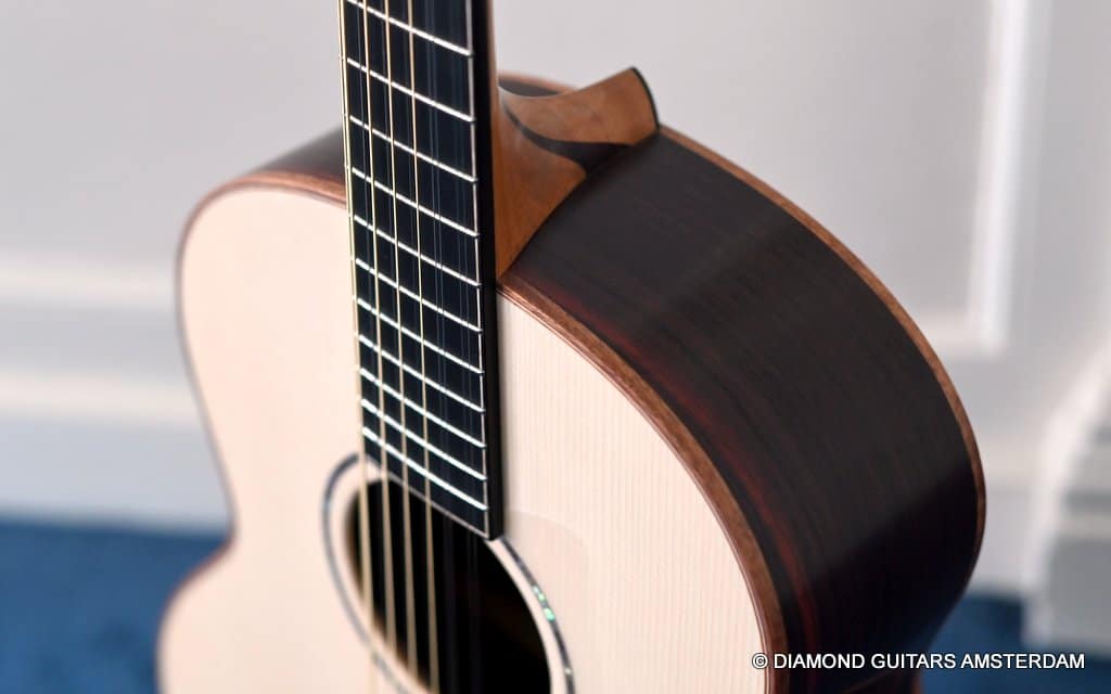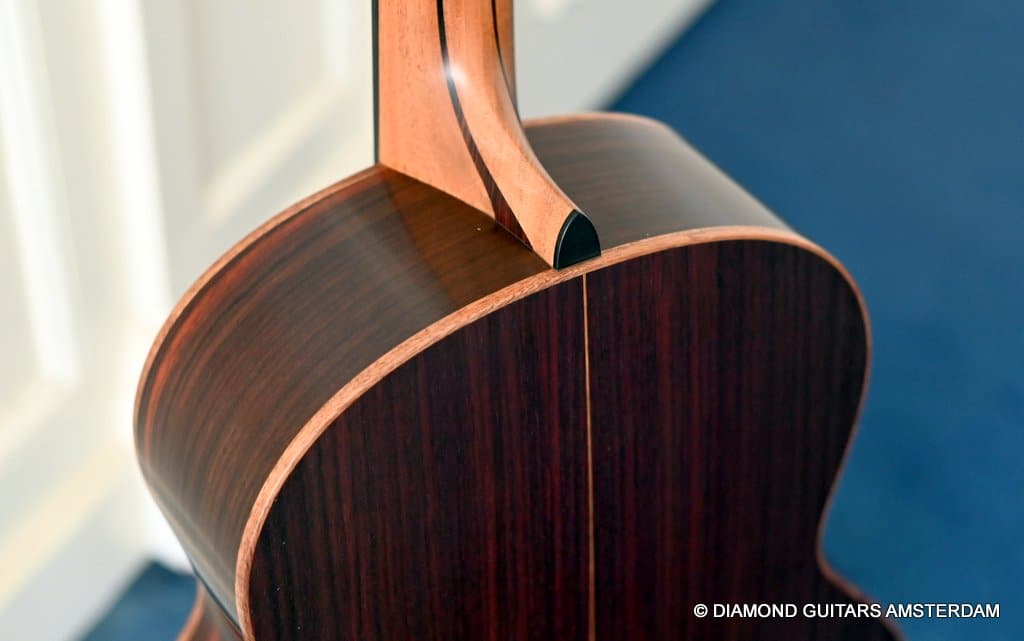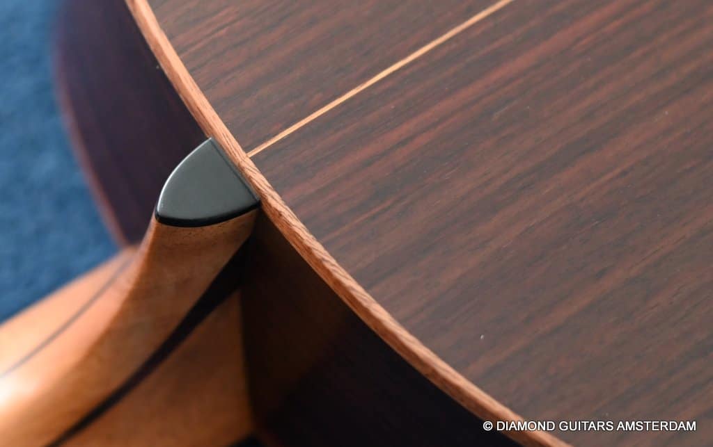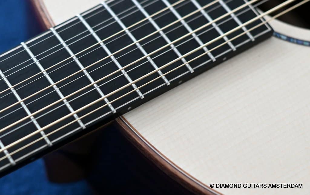 This Lowden F35 Indian Rosewood – Adirondack 12-string is a powerful beauty. Subtle use of figured and beautiful woods, and above all…their superb tonal definition and separation. AAAA figured tonewoods used throughout, Abalone and wood rosette, hand mitred purfling joints on sides and back, wood (Ebony/Maple) bound Ebony fingerboard, the superb Gotoh 510 series gold tuners with Ebony knobs. She has deep and solid bases, a fat and rich high and beautiful open midrange. Chords and complex tunes flow clearly and detailed. This is the perfect guitar for the flat- and finger picker and every other player looking for a comfortably playing and holding hand build, high quality acoustic guitar that will help you explore all the details of the right-hand play.